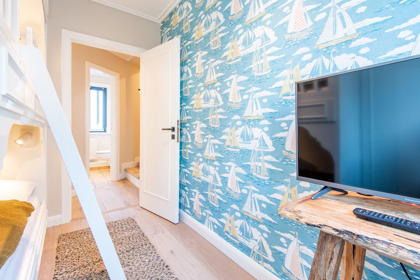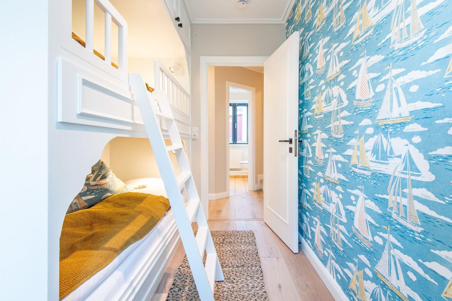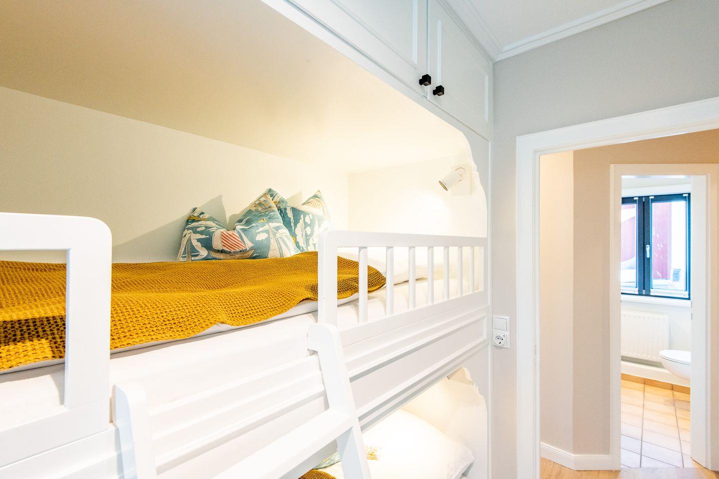 Das Hauptschlafzimmer verfügt über ein komfortables Boxspringbett (180x200 cm) und einen großzügigen Kleiderschrank, der ausreichend Stauraum für Ihre Kleidung bietet. Das zweite Schlafzimmer ist speziell für Kinder gestaltet und mit einem Etagenbett (2x 90x190 cm) und einem zusätzlichen Kleiderschrank ausgestattet, sodass auch die jüngsten Gäste sich hier wohlfühlen. Das moderne Badezimmer bietet eine Dusche, WC, Föhn und einen Handtuchwärmer.
