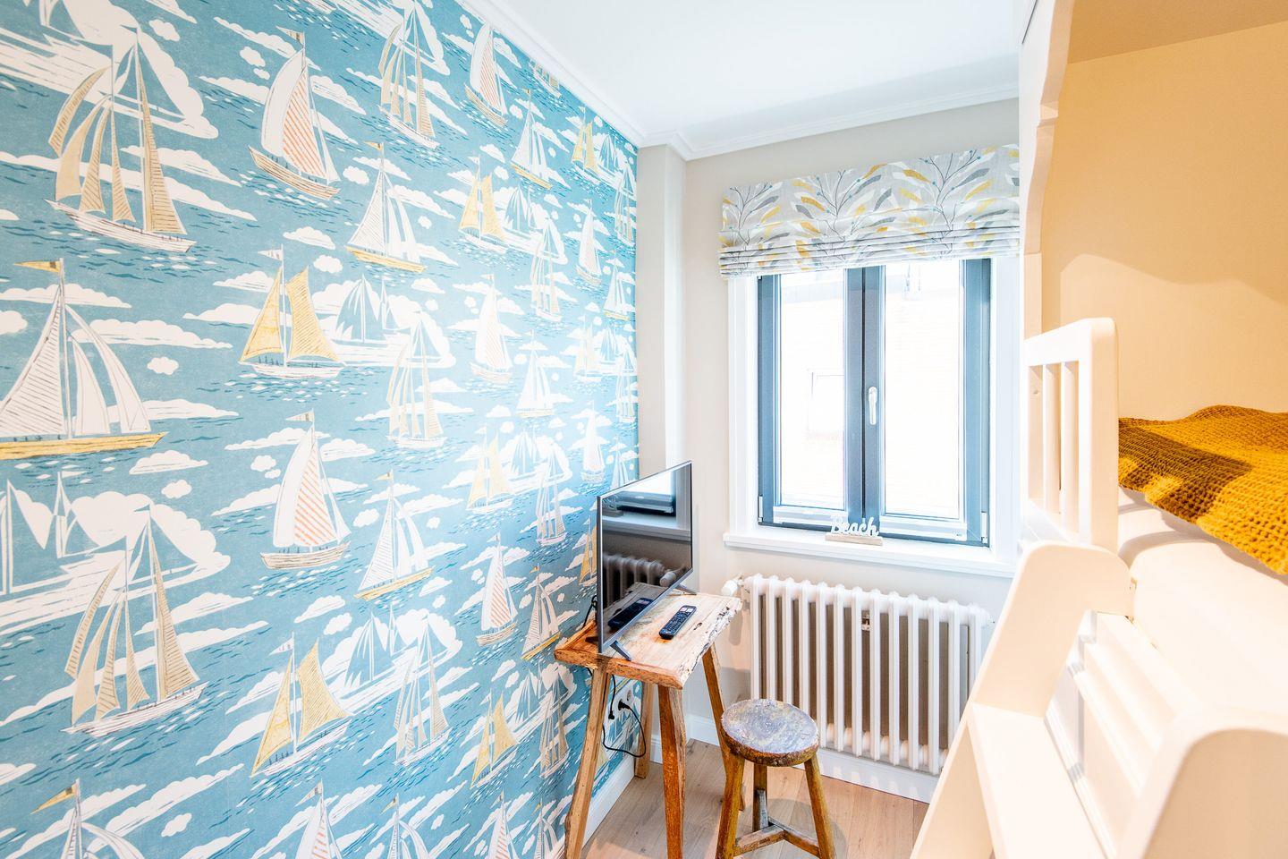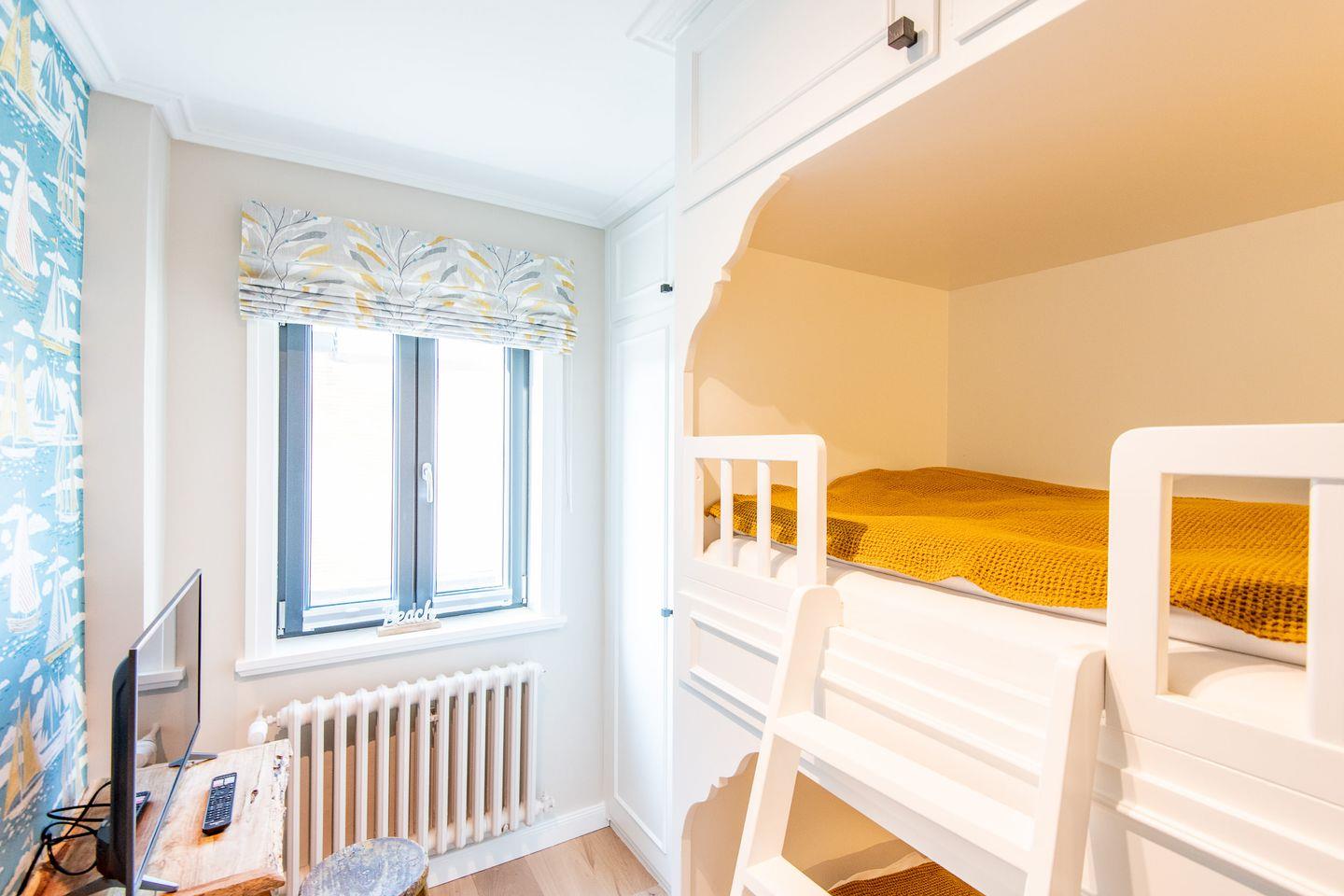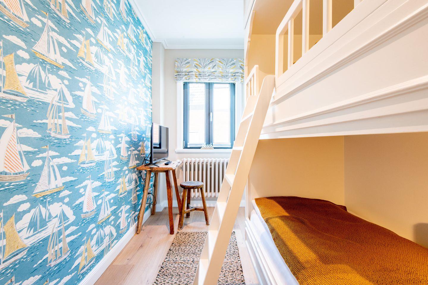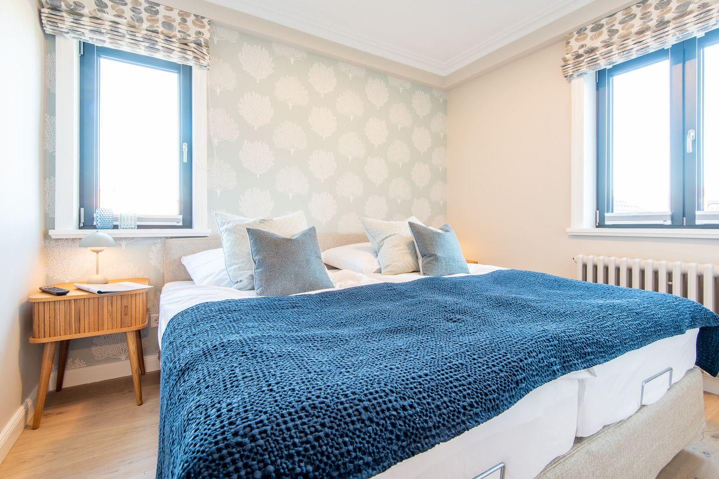 Das Hauptschlafzimmer verfügt über ein komfortables Boxspringbett (180x200 cm) und einen großzügigen Kleiderschrank, der ausreichend Stauraum für Ihre Kleidung bietet. Das zweite Schlafzimmer ist speziell für Kinder gestaltet und mit einem Etagenbett (2x 90x190 cm) und einem zusätzlichen Kleiderschrank ausgestattet, sodass auch die jüngsten Gäste sich hier wohlfühlen. Das moderne Badezimmer bietet eine Dusche, WC, Föhn und einen Handtuchwärmer.