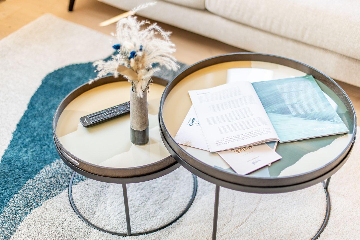 Das gemütliche Wohnzimmer verfügt über ein bequemes Sofa und eine einladende Essecke, die zu gemeinsamen Mahlzeiten und entspannten Abenden einlädt.