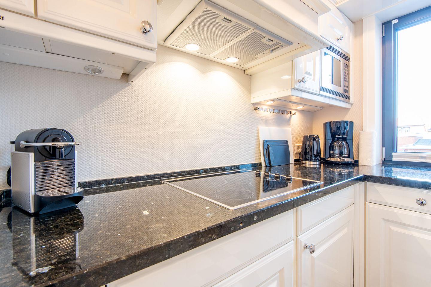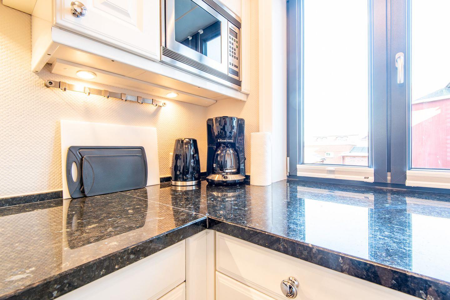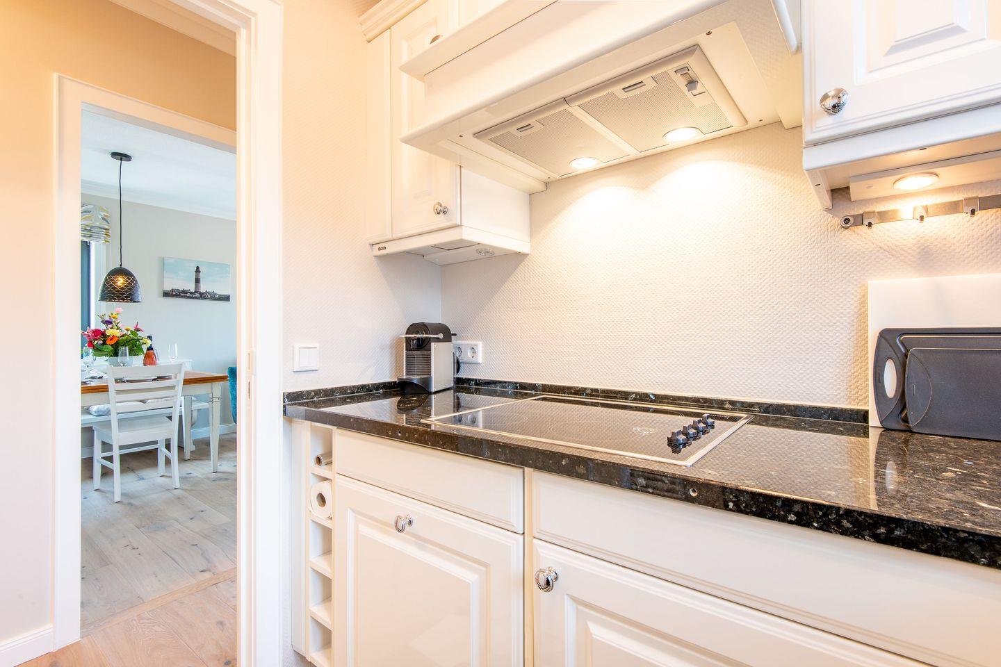 Die separate, hochmoderne Küche ist stilvoll mit einer Granitarbeitsplatte ausgestattet und bietet Ihnen alles, was Sie für einen komfortablen Aufenthalt benötigen. Sie ist mit einem Cerankochfeld, einem Geschirrspüler, einer Nespresso-Maschine und einer Filterkaffeemaschine voll ausgestattet.