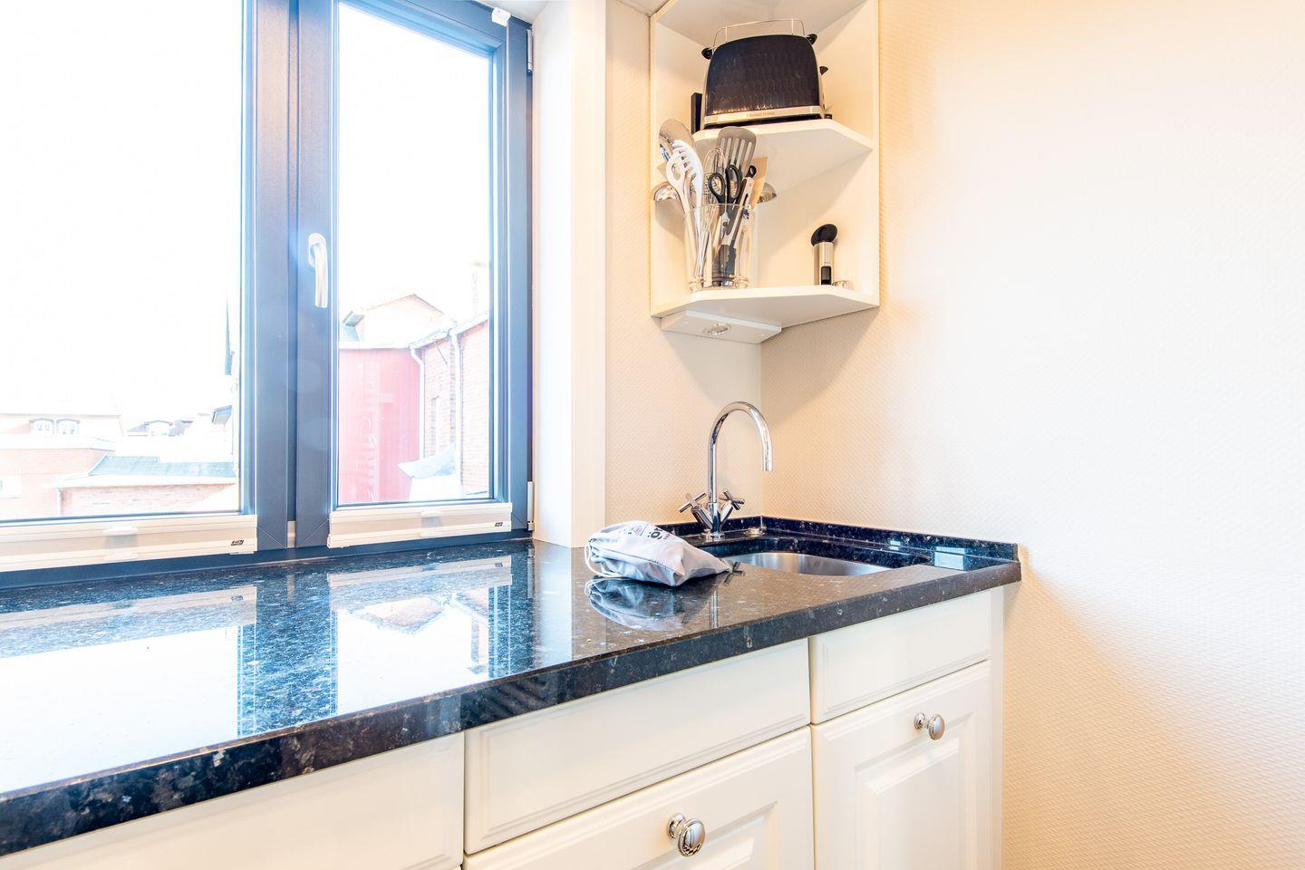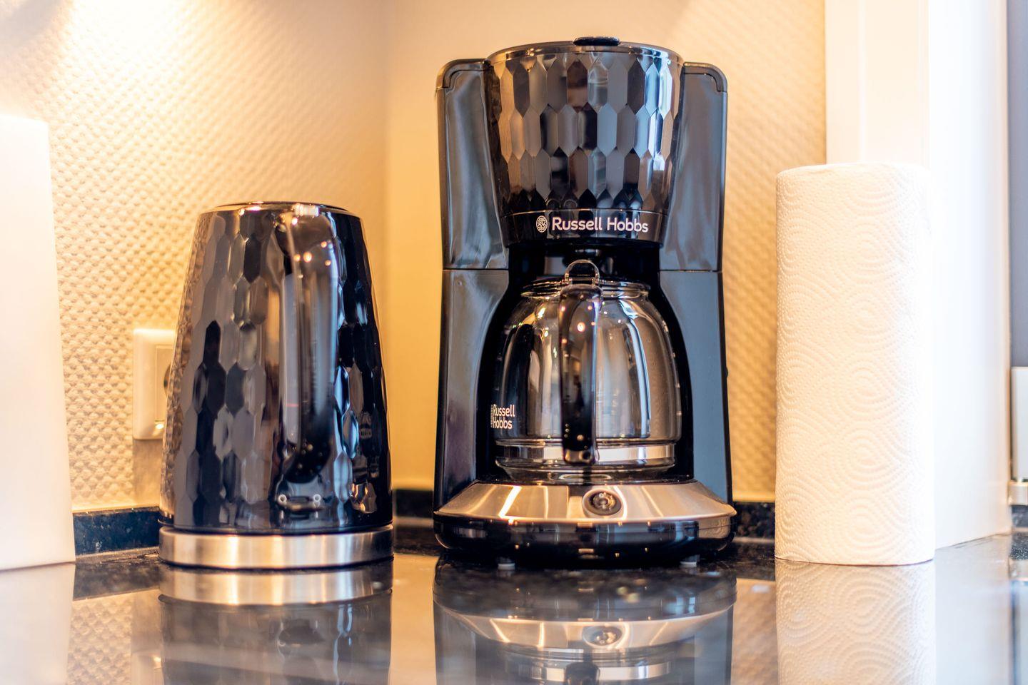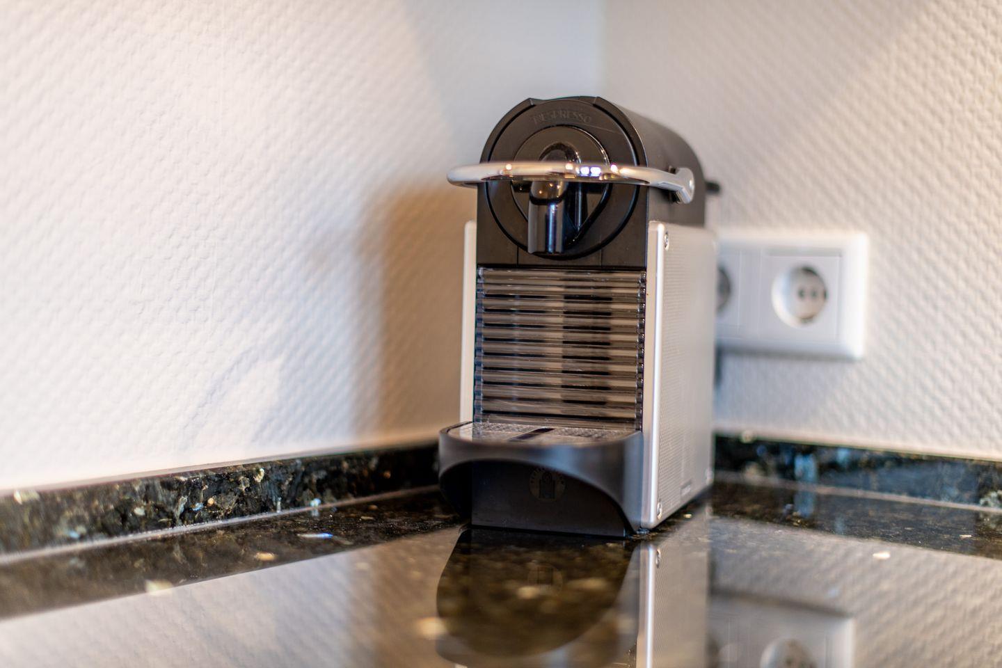 Die separate, hochmoderne Küche ist stilvoll mit einer Granitarbeitsplatte ausgestattet und bietet Ihnen alles, was Sie für einen komfortablen Aufenthalt benötigen. Sie ist mit einem Cerankochfeld, einem Geschirrspüler, einer Nespresso-Maschine und einer Filterkaffeemaschine voll ausgestattet.