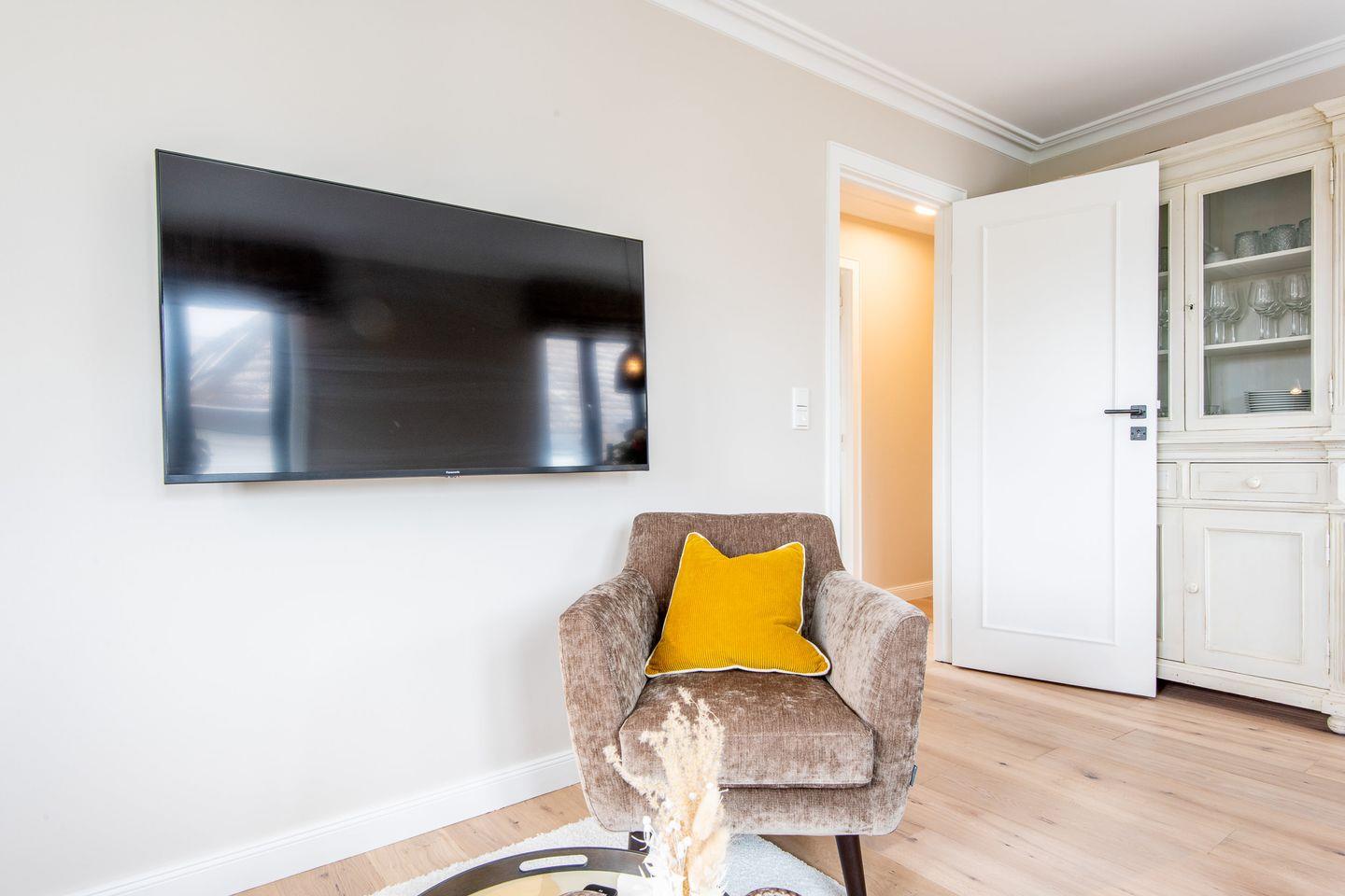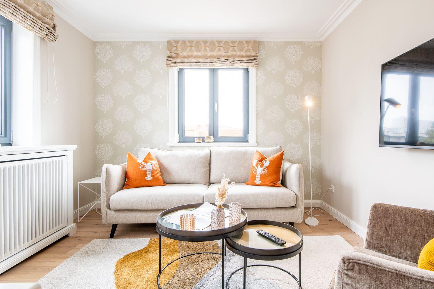 Das gemütliche Wohnzimmer ist stilvoll eingerichtet und mit einem bequemen Sofa sowie einer Essecke ausgestattet, die ausreichend Platz für gemeinsame Mahlzeiten bietet. Hier können Sie entspannen und die erlebnisreichen Tage auf Sylt ausklingen lassen.