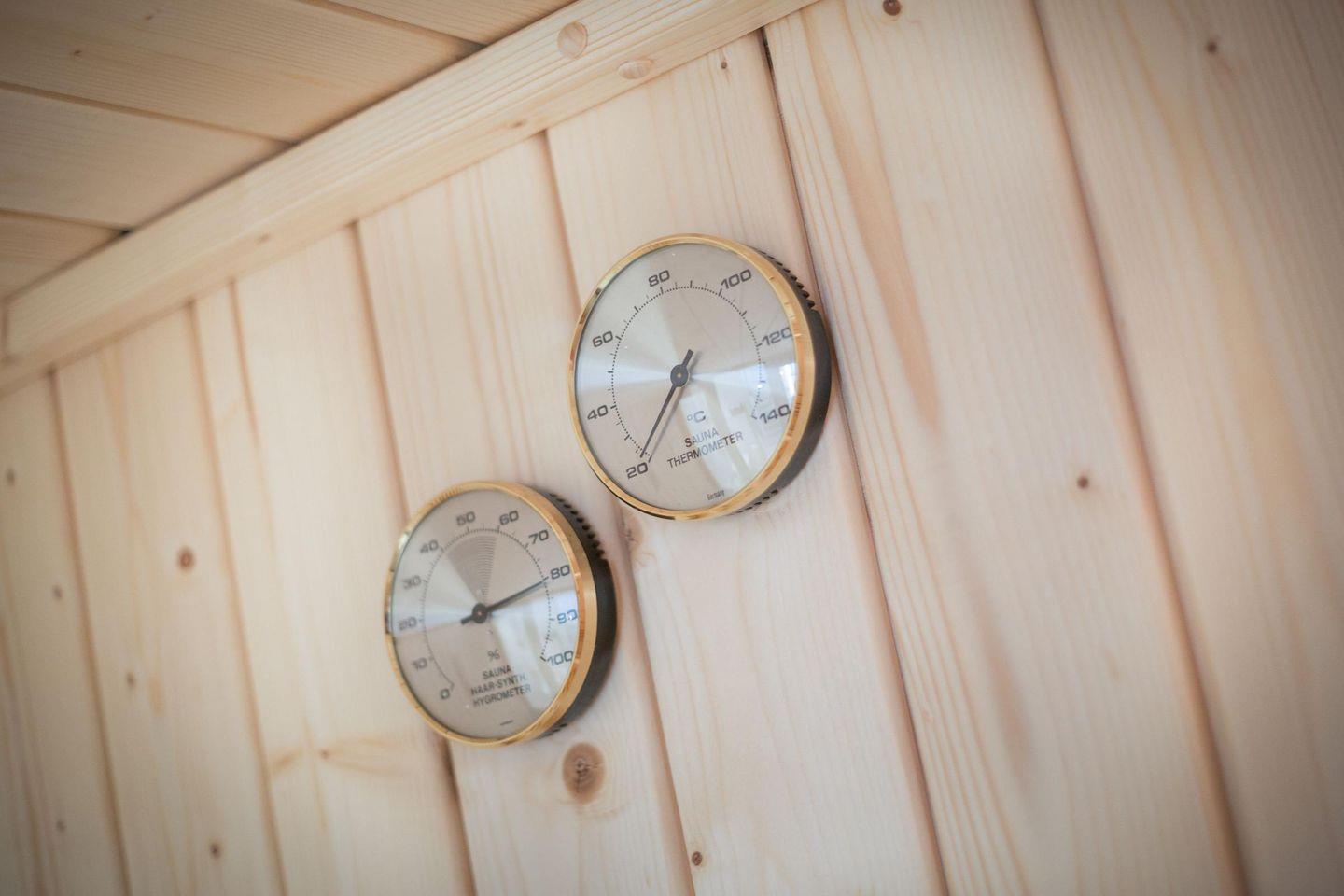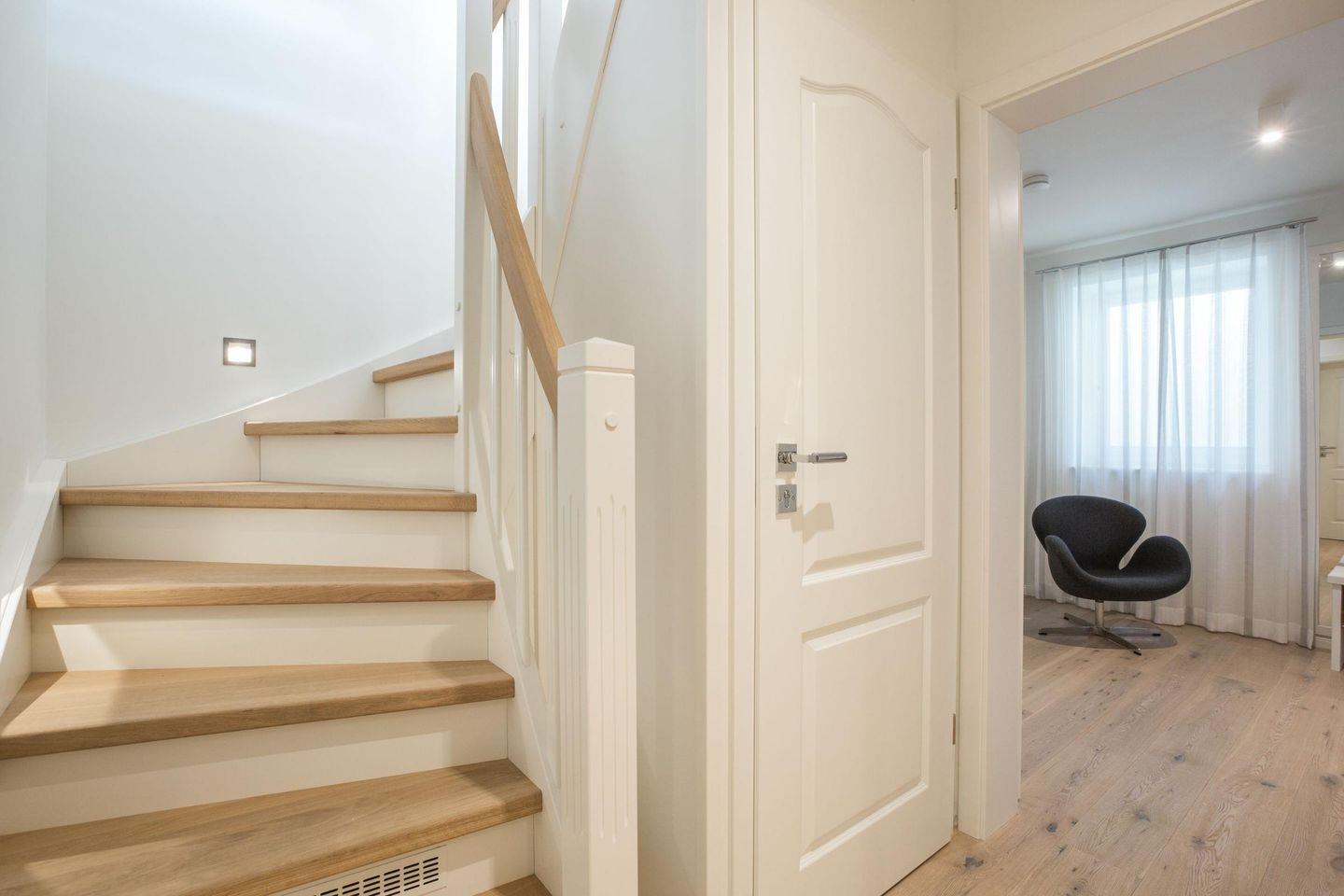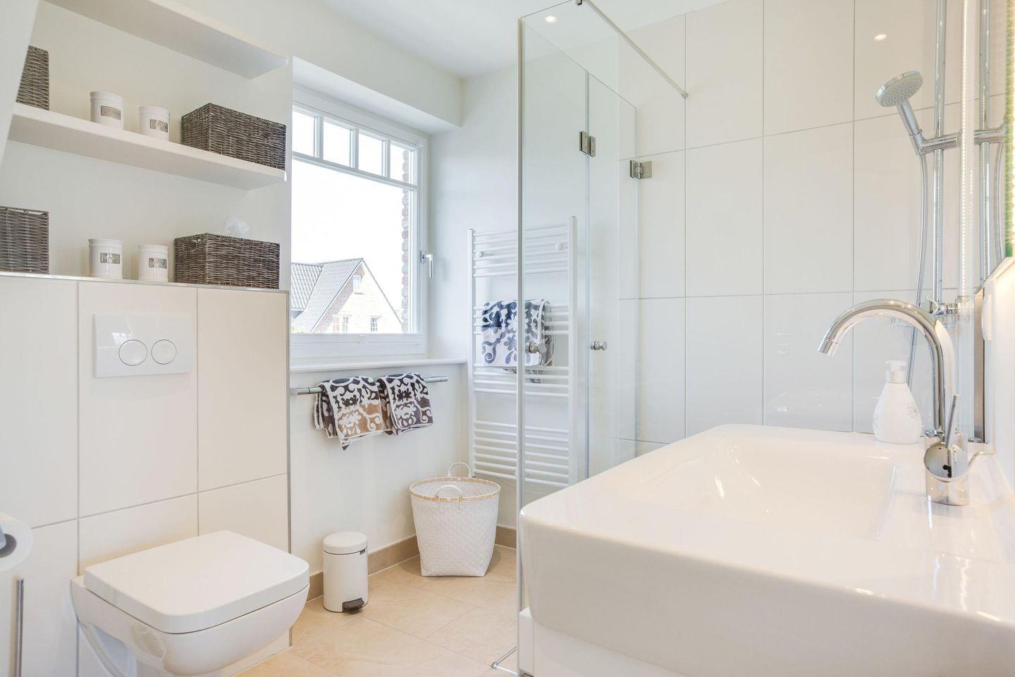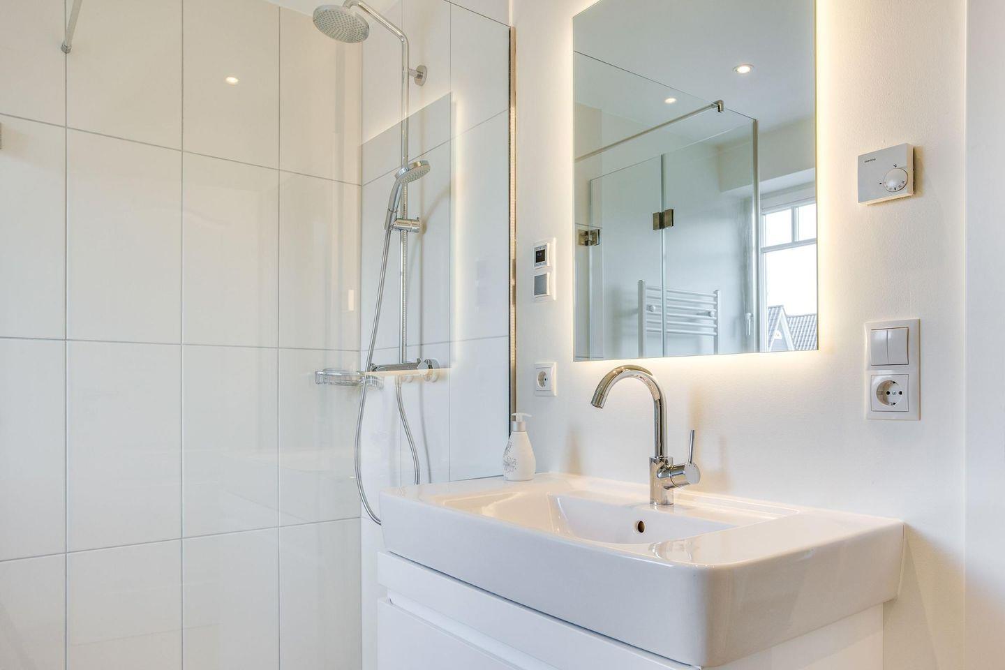 Zwei hochwertige Badezimmer und ein separates Gäste-WC, die allen Komfort für einen angenehmen Aufenthalt bieten. Das erste Badezimmer besticht mit einer ebenerdigen Dusche, einem WC und einem Handtuchwärmer und wird durch das Tageslicht angenehm erhellt, was für eine einladende Atmosphäre sorgt. Das zweite, großzügig gestaltete Badezimmer bietet ebenfalls eine bodengleiche Dusche, ein WC und einen Handtuchwärmer, und ist zusätzlich mit einer luxuriösen Sauna ausgestattet – perfekt für entspannende Momente und eine wohlverdiente Erholung vom Alltag. Das separate Gäste-WC im Eingangsbereich sorgt für zusätzlichen Komfort und Flexibilität für Sie und Ihre Gäste.