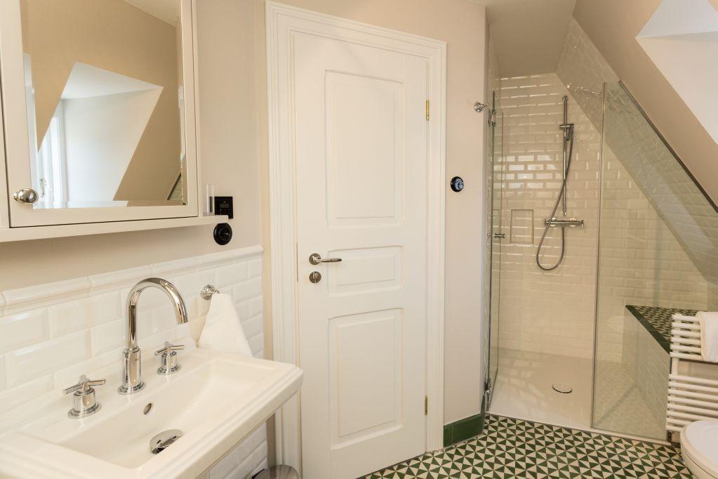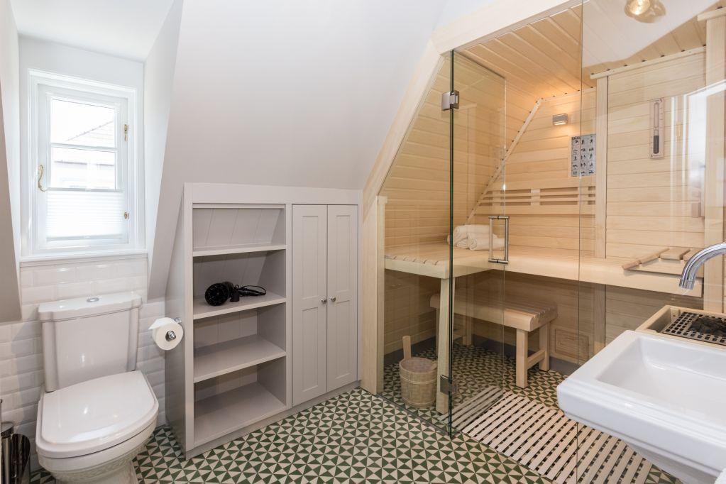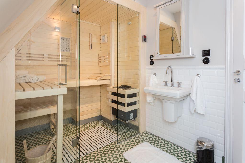 Das erste Badezimmer bietet mit einer ebenerdigen Dusche, WC, Handtuchwärmer und Tageslicht alles, was Sie für den Start in den Tag benötigen. Als besonderes Highlight verfügt es über eine finnische Sauna – der ideale Ort, um sich nach einem Tag am Meer zu entspannen. Das zweite Badezimmer ist ebenfalls mit einer ebenerdigen Dusche, WC und Tageslicht ausgestattet und ergänzt den luxuriösen Komfort dieser Ferienwohnung.