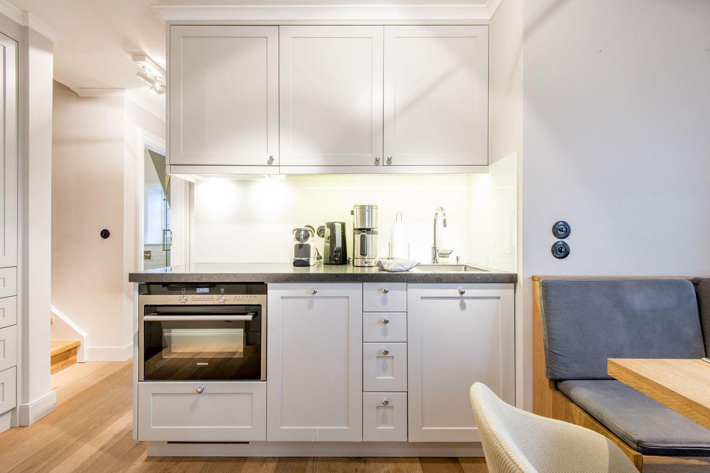 Die offene Küche fügt sich perfekt in den Wohnbereich ein und ist mit einem Induktionsherd, Geschirrspüler und weiteren hochwertigen Geräten ausgestattet, die die Zubereitung von Mahlzeiten zum Vergnügen machen. Hier finden Sie alles, was Sie für eine komfortable Selbstversorgung benötigen.