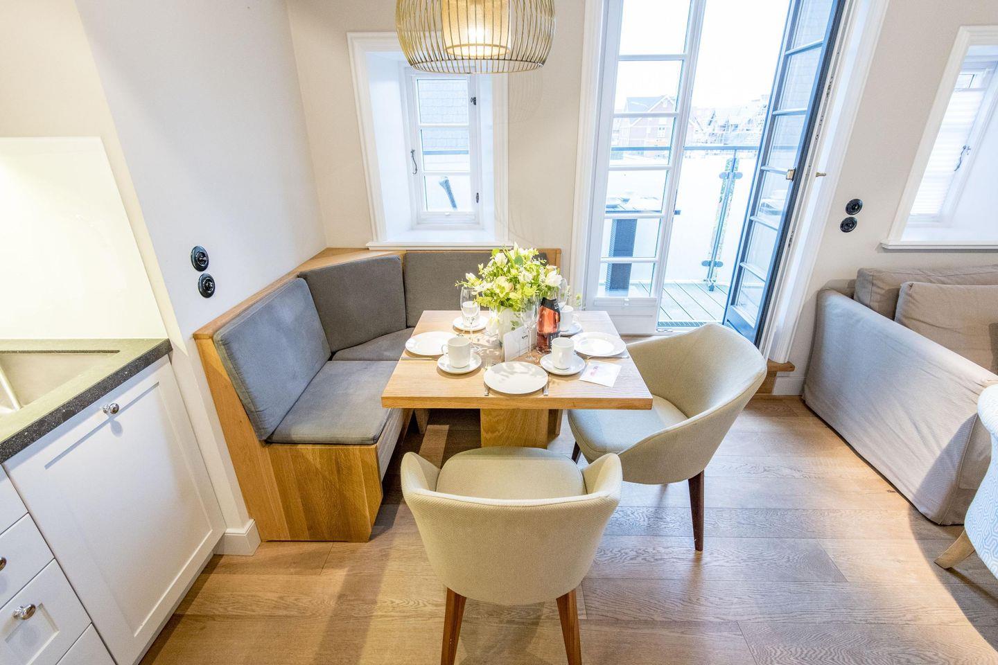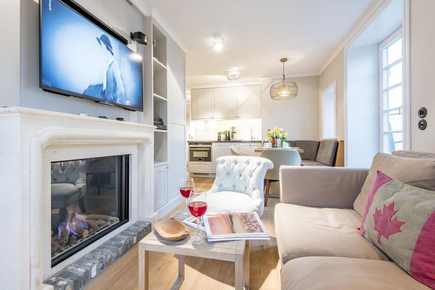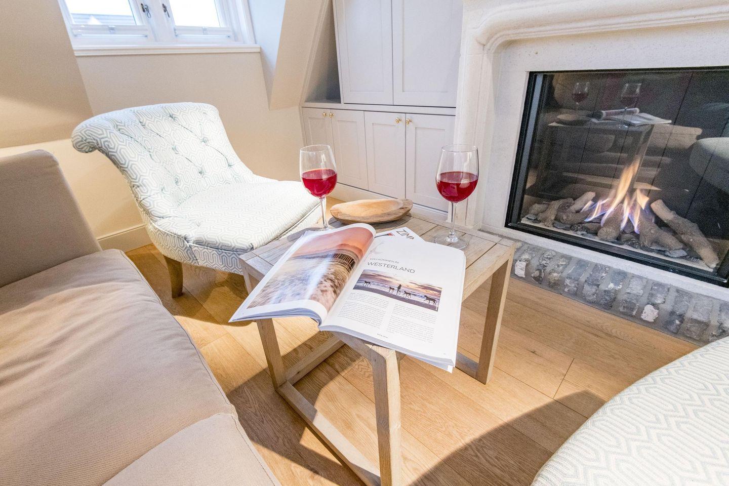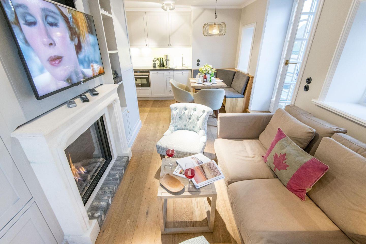 Der großzügige Wohnbereich lädt mit einem gemütlichen Sofa, einem Sessel und einem Esstisch für vier Personen zum Verweilen ein. Für behagliche Abende sorgt der Gaskamin, während der Balkonzugang nach Süden mit herrlichem Dünenblick zum Entspannen einlädt. Die Kombination aus stilvoller Einrichtung und moderner Technik schafft eine Atmosphäre der Erholung und Gemütlichkeit.