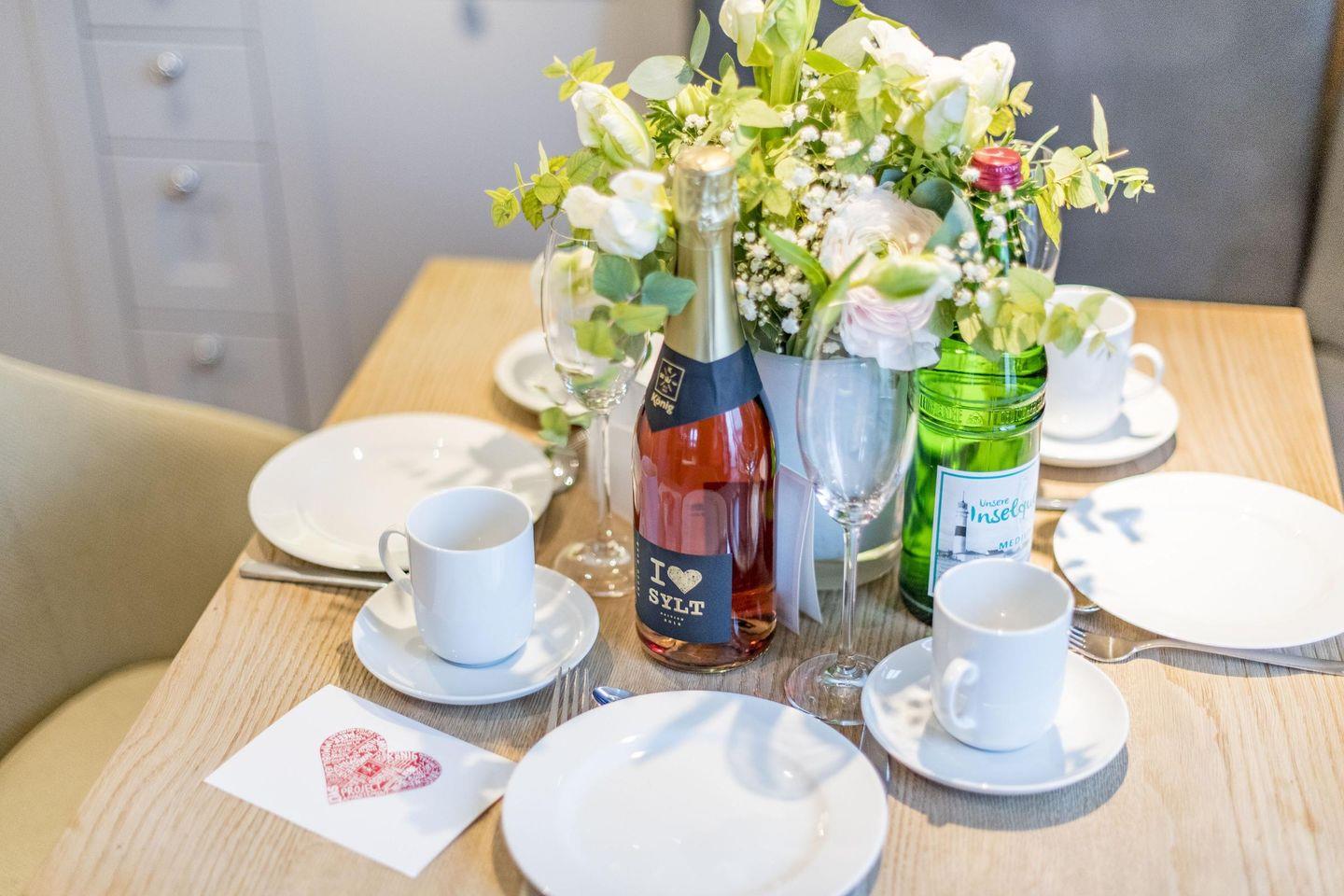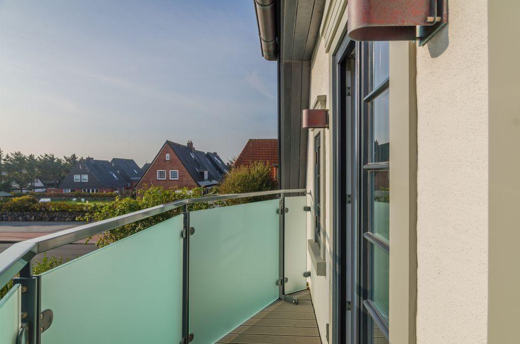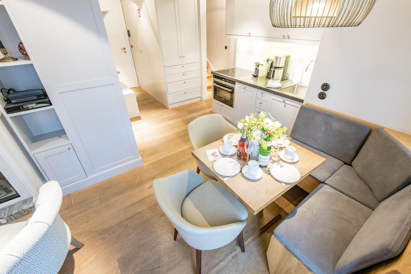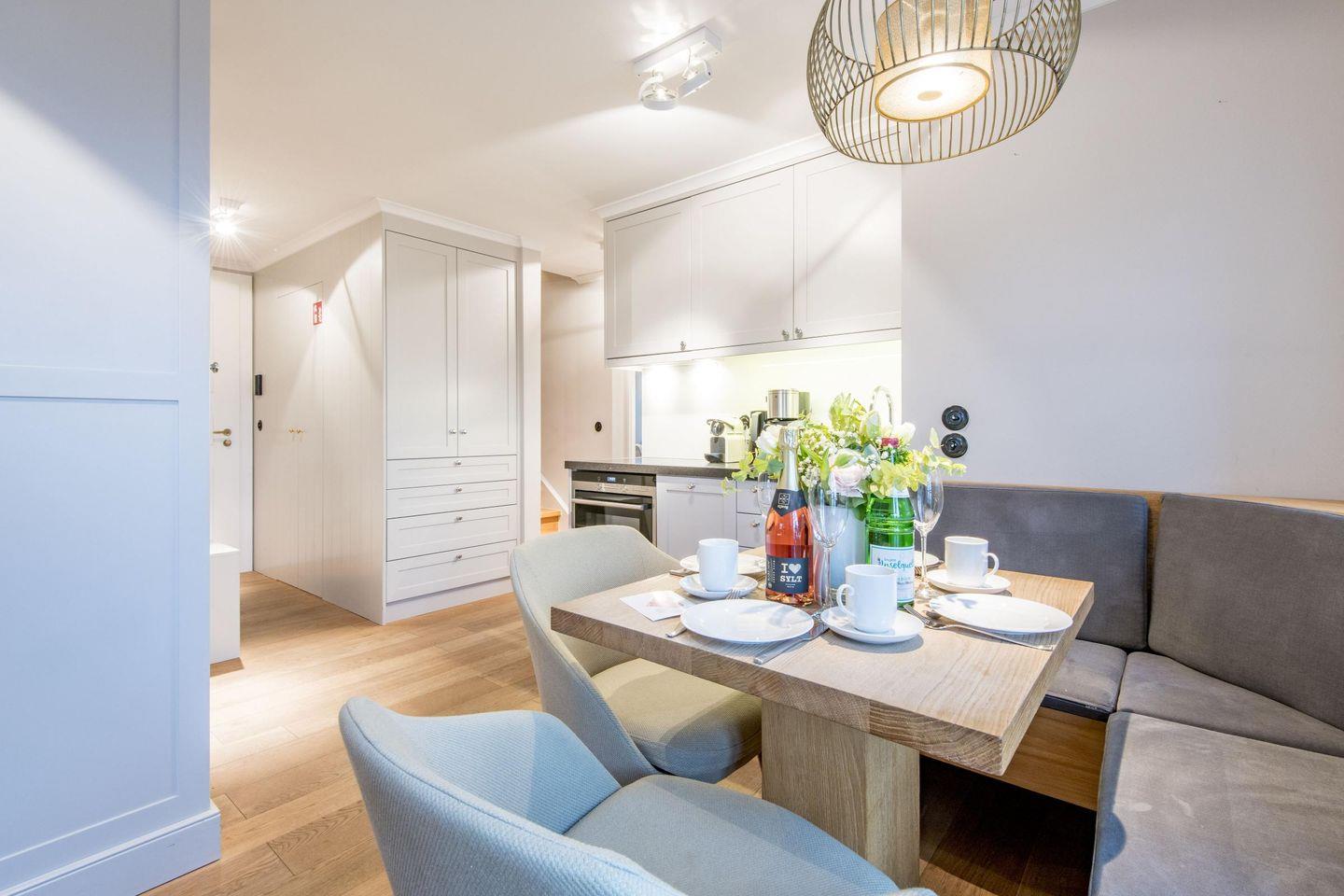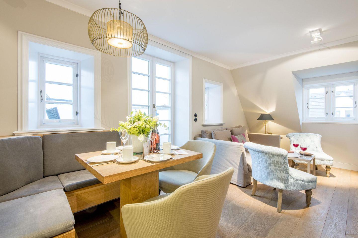 Der großzügige Wohnbereich lädt mit einem gemütlichen Sofa, einem Sessel und einem Esstisch für vier Personen zum Verweilen ein. Für behagliche Abende sorgt der Gaskamin, während der Balkonzugang nach Süden mit herrlichem Dünenblick zum Entspannen einlädt. Die Kombination aus stilvoller Einrichtung und moderner Technik schafft eine Atmosphäre der Erholung und Gemütlichkeit.