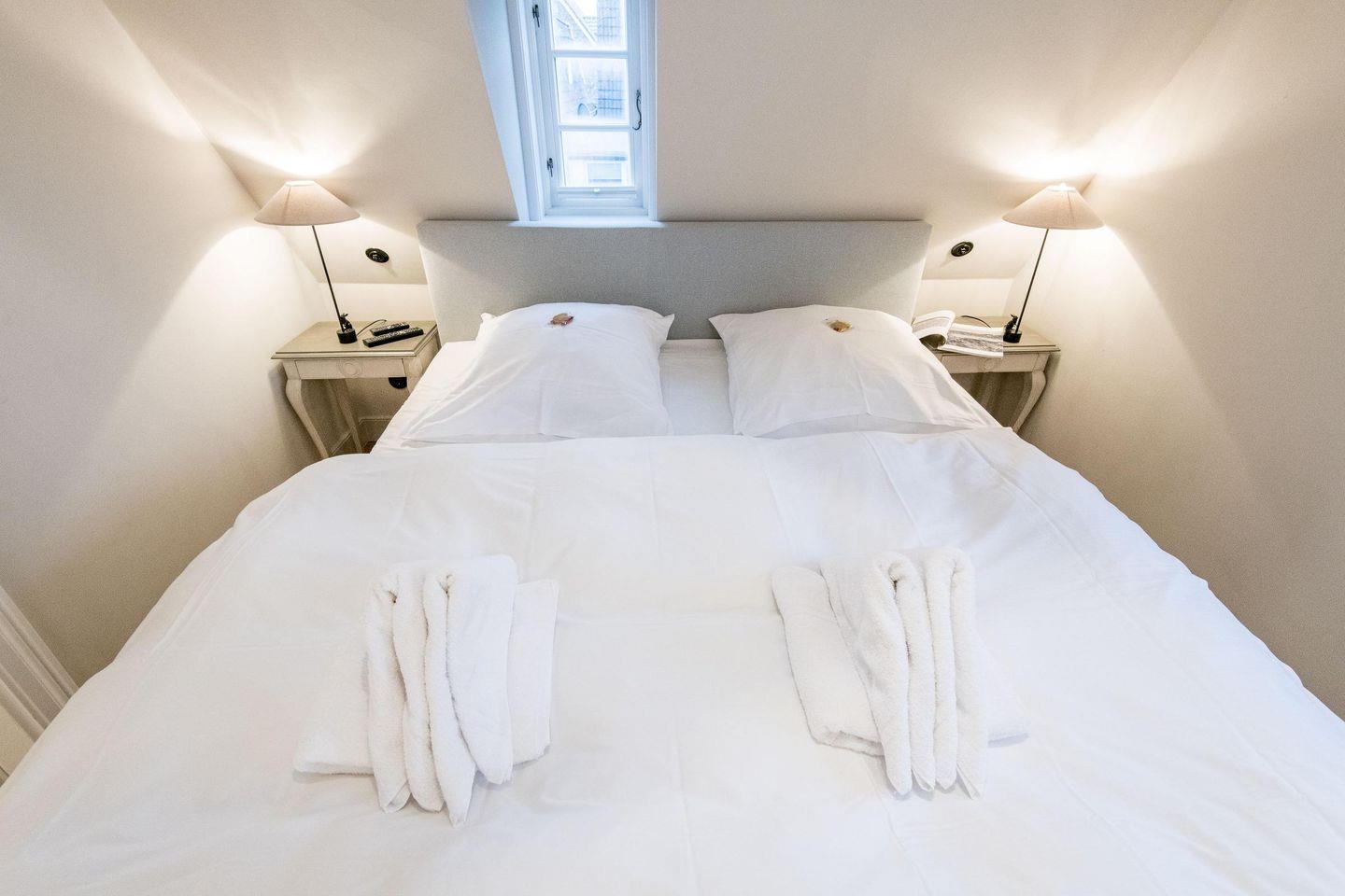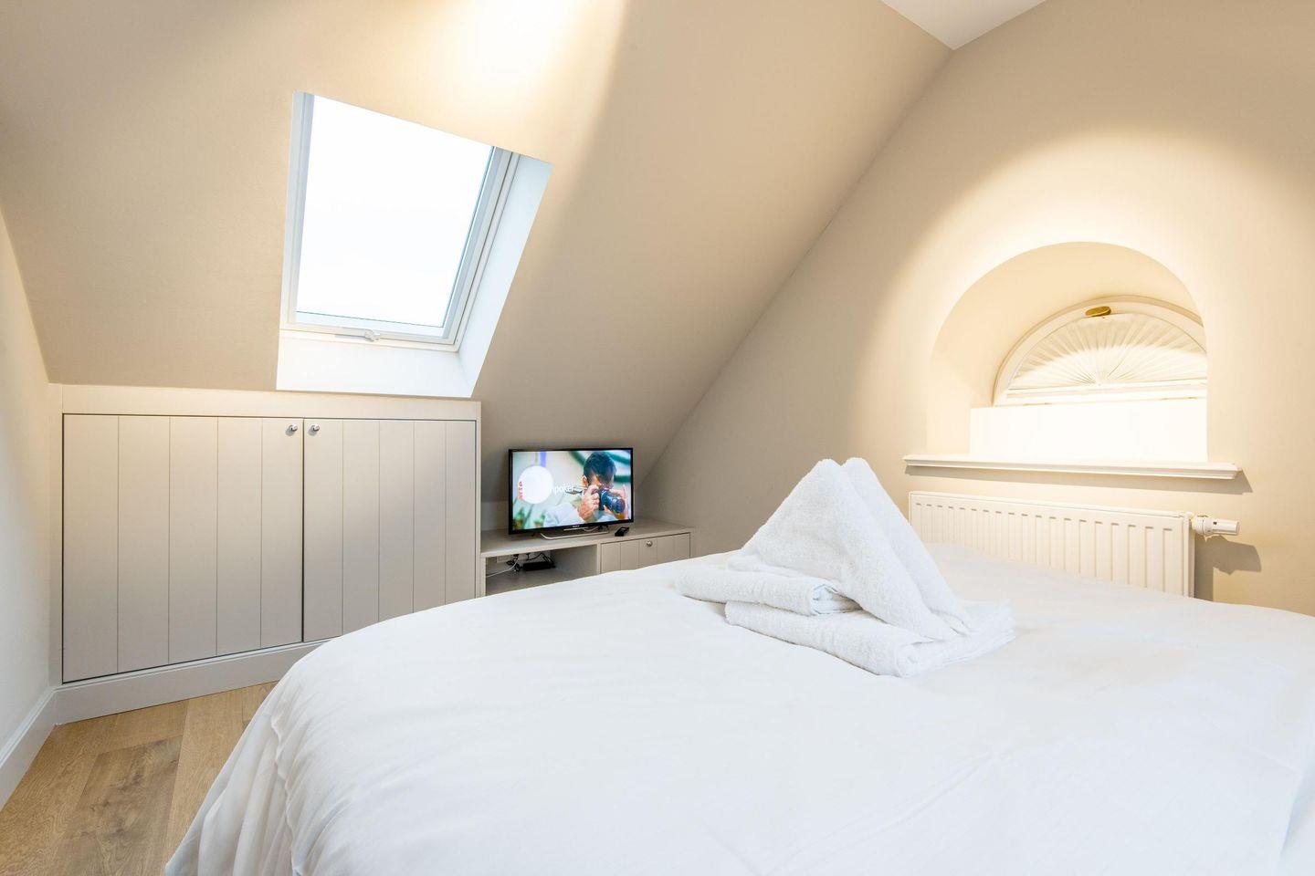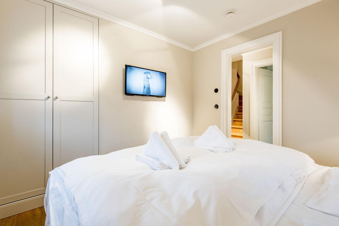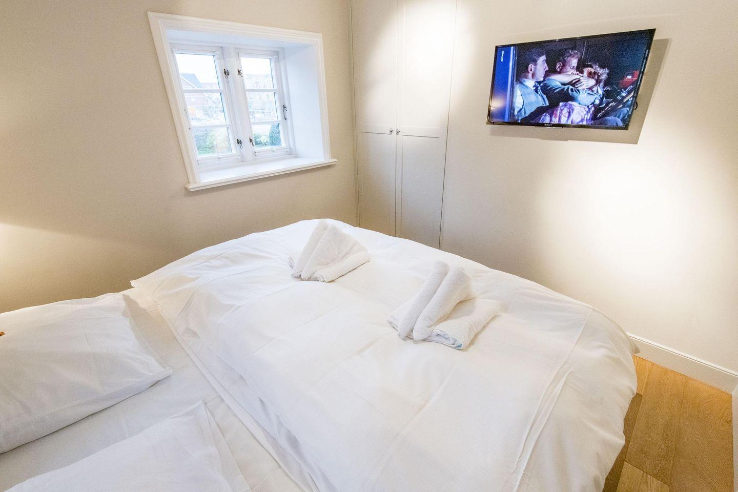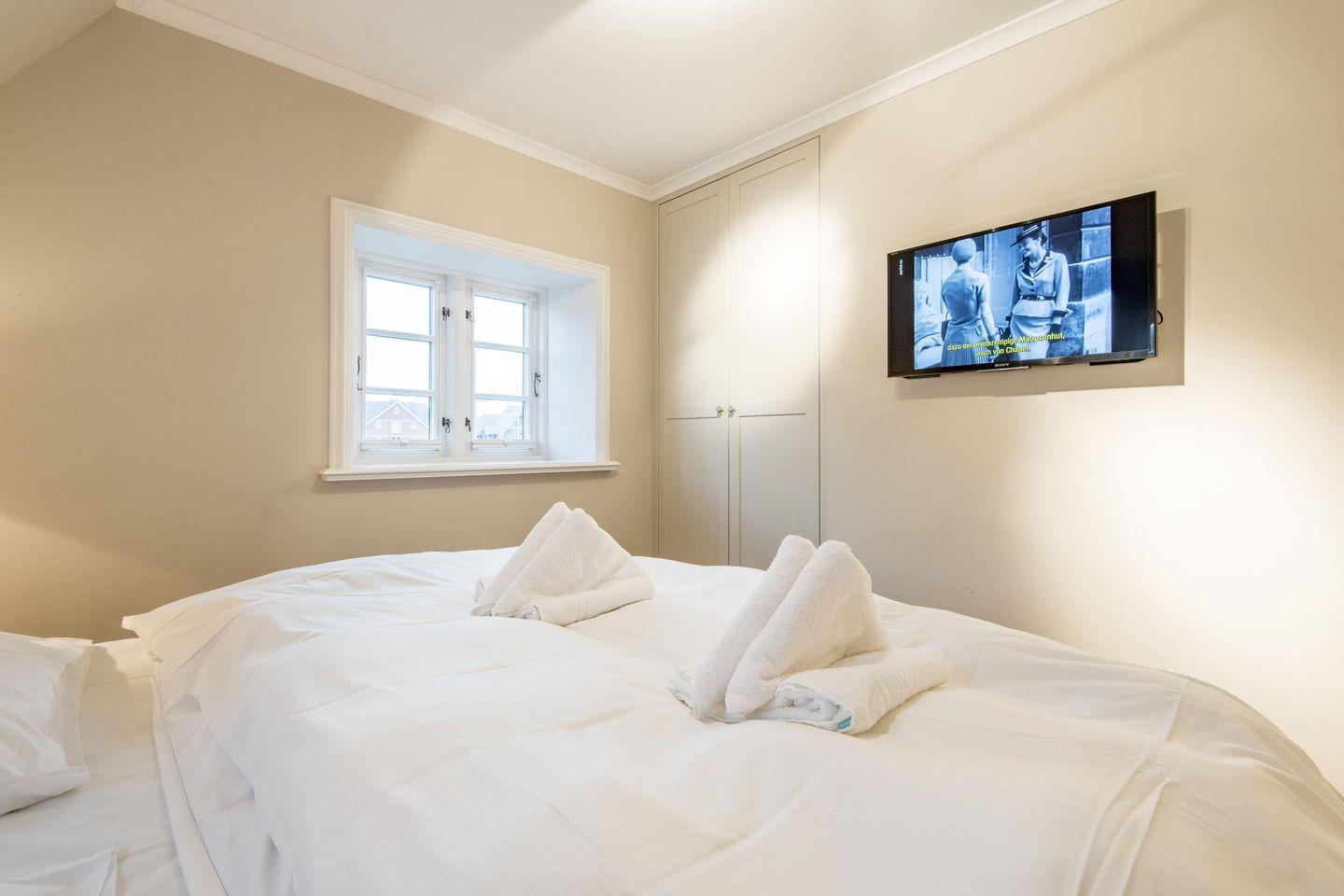 Das erste Schlafzimmer bietet ein großzügiges Doppelbett (180x200 cm), einen geräumigen Einbauschrank und einen TV. Das zweite Schlafzimmer, ebenfalls stilvoll eingerichtet, verfügt über ein komfortables Doppelbett (140x200 cm), einen Einbauschrank und einen TV. Beide Räume versprechen erholsame Nächte in luxuriösem Ambiente.