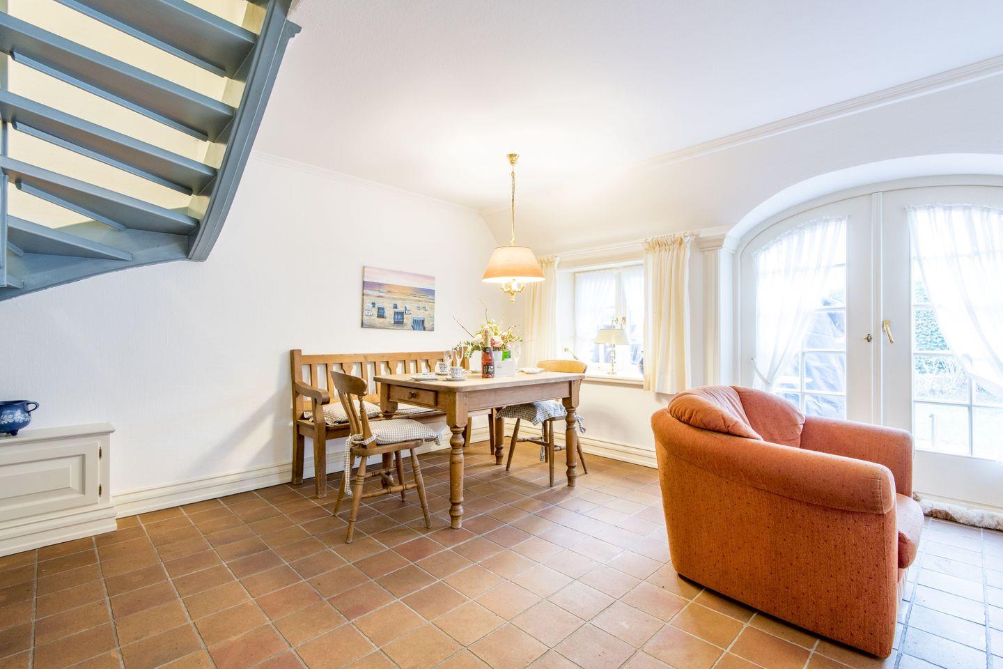 Der einladende Wohn-Essbereich verfügt über ein komfortables Sofa, einen Sessel sowie ein TV und bietet direkten Zugang zum idyllischen Garten mit sonniger Terrasse und einem Saison-Strandkorb (April-Oktober). Die geschmackvoll angelegten Pflanzen schaffen eine harmonische Kulisse, die zum Verweilen im Freien einlädt.