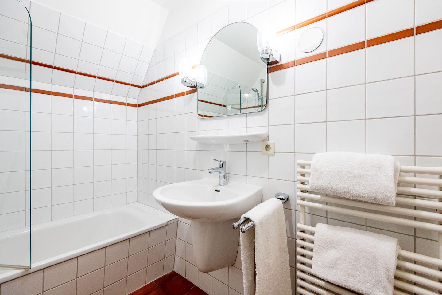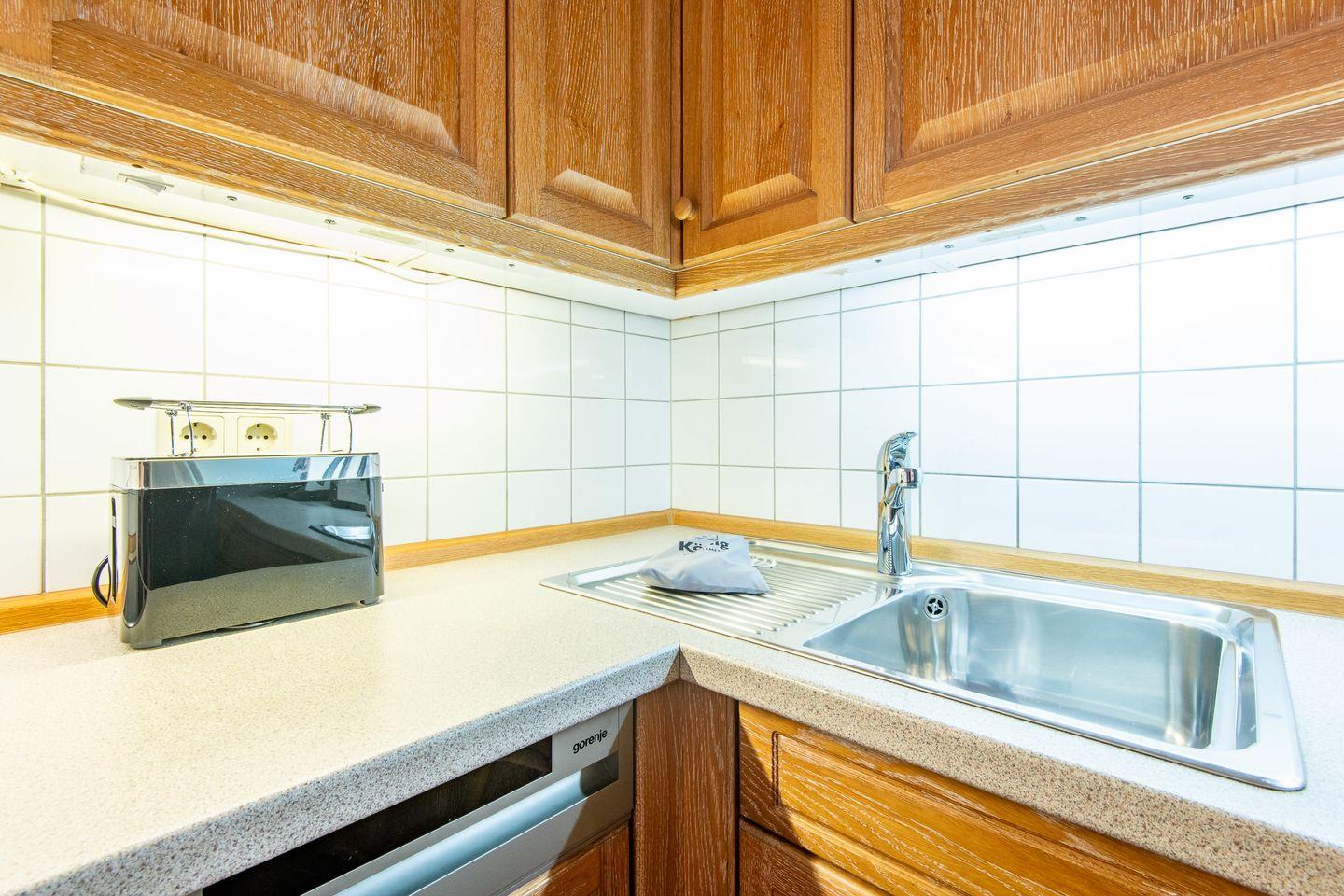Das Hauptschlafzimmer ist mit einem Doppelbett (2x 90x200 cm) und maßgefertigten Tischlereinbauten ausgestattet, die genügend Stauraum bieten. Das zweite Schlafzimmer verfügt über ein Einzelbett (90x190 cm) und ebenfalls über Tischlereinbauten. Das Badezimmer mit Badewanne lädt zu entspannenden Momenten ein.