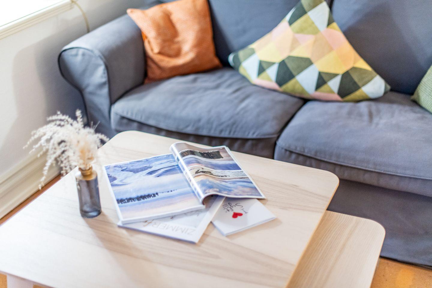 Der Wohn-Essbereich bietet eine gemütliche Sitzgruppe mit Sofa, Sessel und TV. Zur Wohnung gehört eine eigene möblierte Terrasse und ein schön angelegter Garten. Der Garten bietet reichlich Platz zum Entspannen, Spielen und Verweilen, und der zur Verfügung stehende Strandkorb (April bis Oktober) sorgt für friesisches Urlaubsflair.