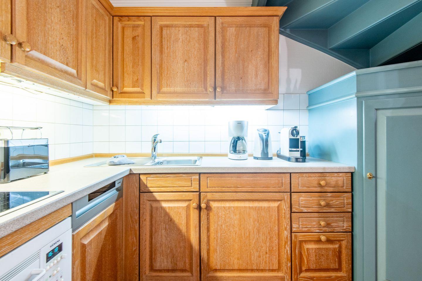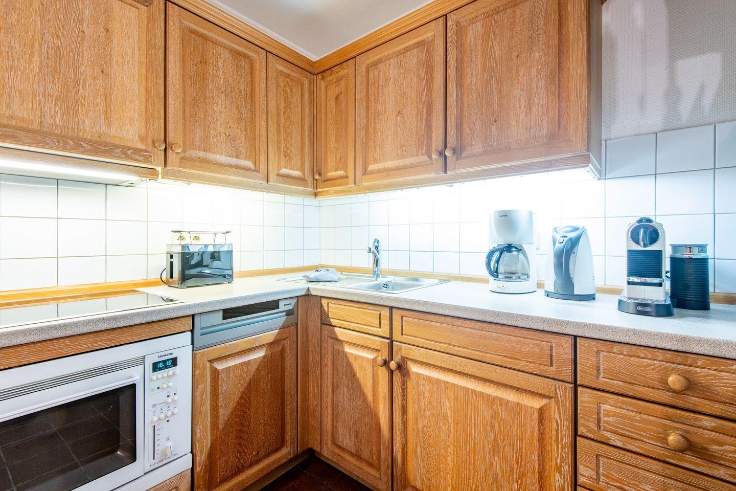Die separate, voll ausgestattete Küche bietet alles, was Sie für die Selbstversorgung benötigen: ein modernes Ceranfeld, Filterkaffeemaschine und eine Nespresso-Maschine. Hier lassen sich komfortabel alle Mahlzeiten für einen entspannten Urlaubstag zubereiten.