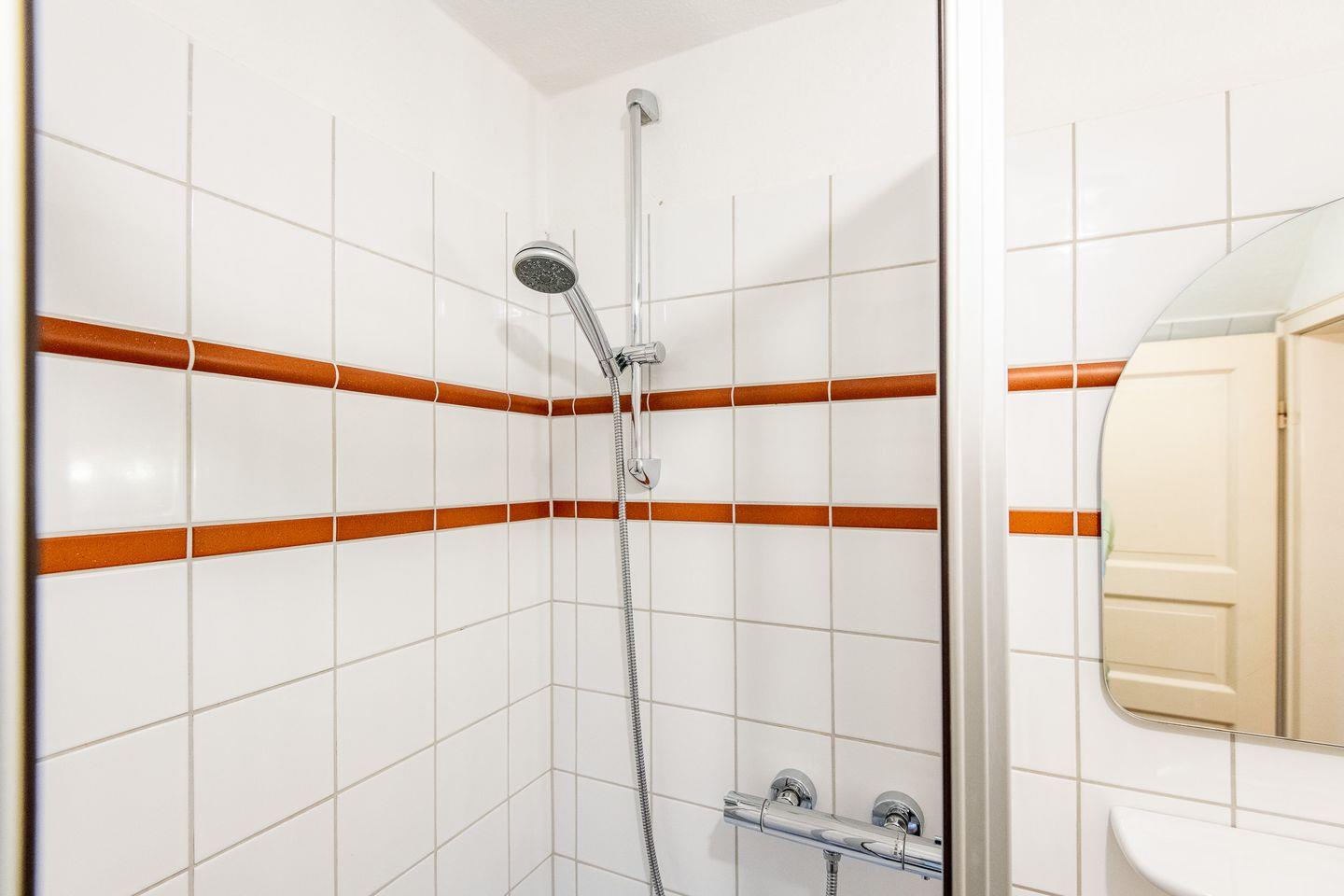 Das Schlafzimmer bietet ein komfortables Doppelbett (2x 90x200 cm) und maßgefertigte Tischlereinbauten, die praktischen Stauraum schaffen. Das Badezimmer mit Tageslicht verfügt über eine moderne Dusche.