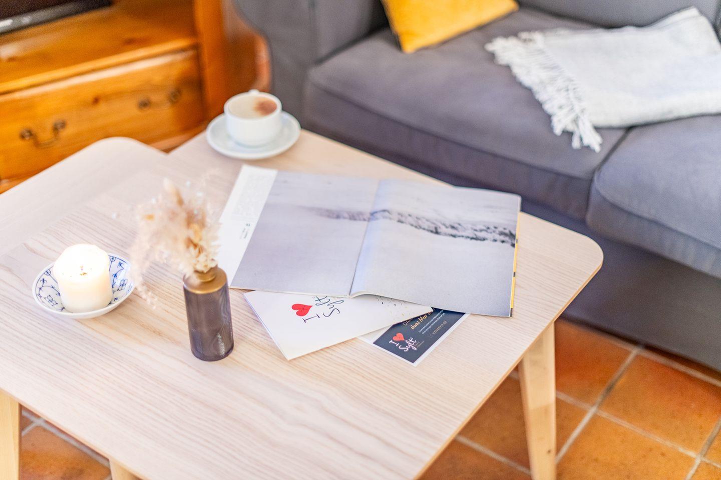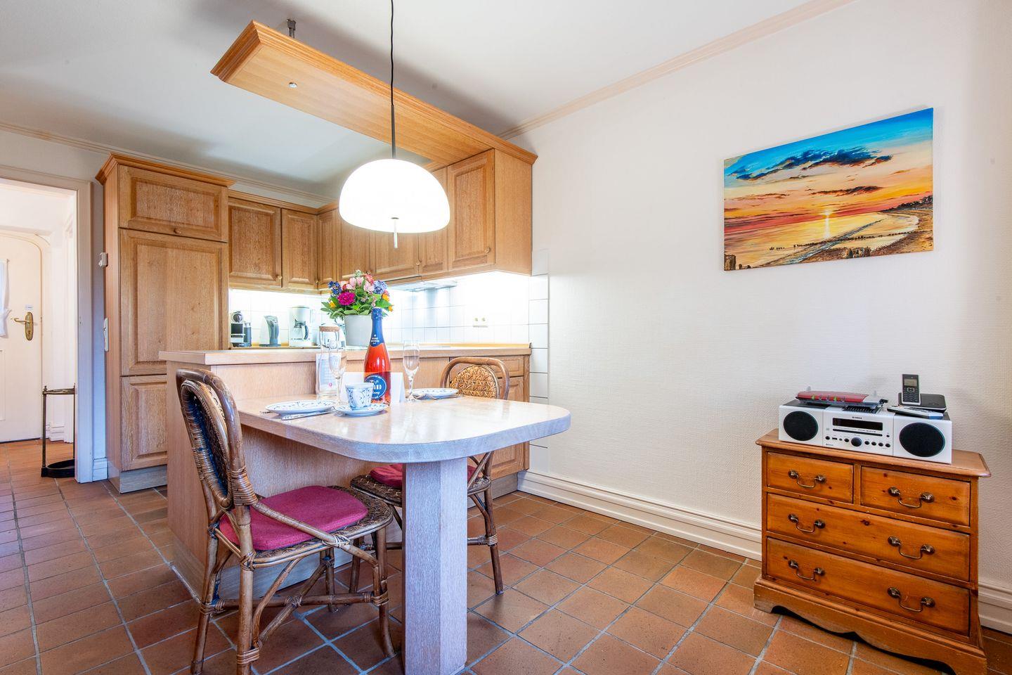 Der helle Wohn-Essbereich lädt mit einem gemütlichen Sofa, Sessel und TV zum Verweilen ein. Der direkte Zugang zur großzügigen und sonnigen Terrasse mit saisonalem Strandkorb (April bis Oktober) und stilvollen Gartenmöbeln sind der ideale Platz, um die frische Nordseeluft in privater Atmosphäre zu genießen.