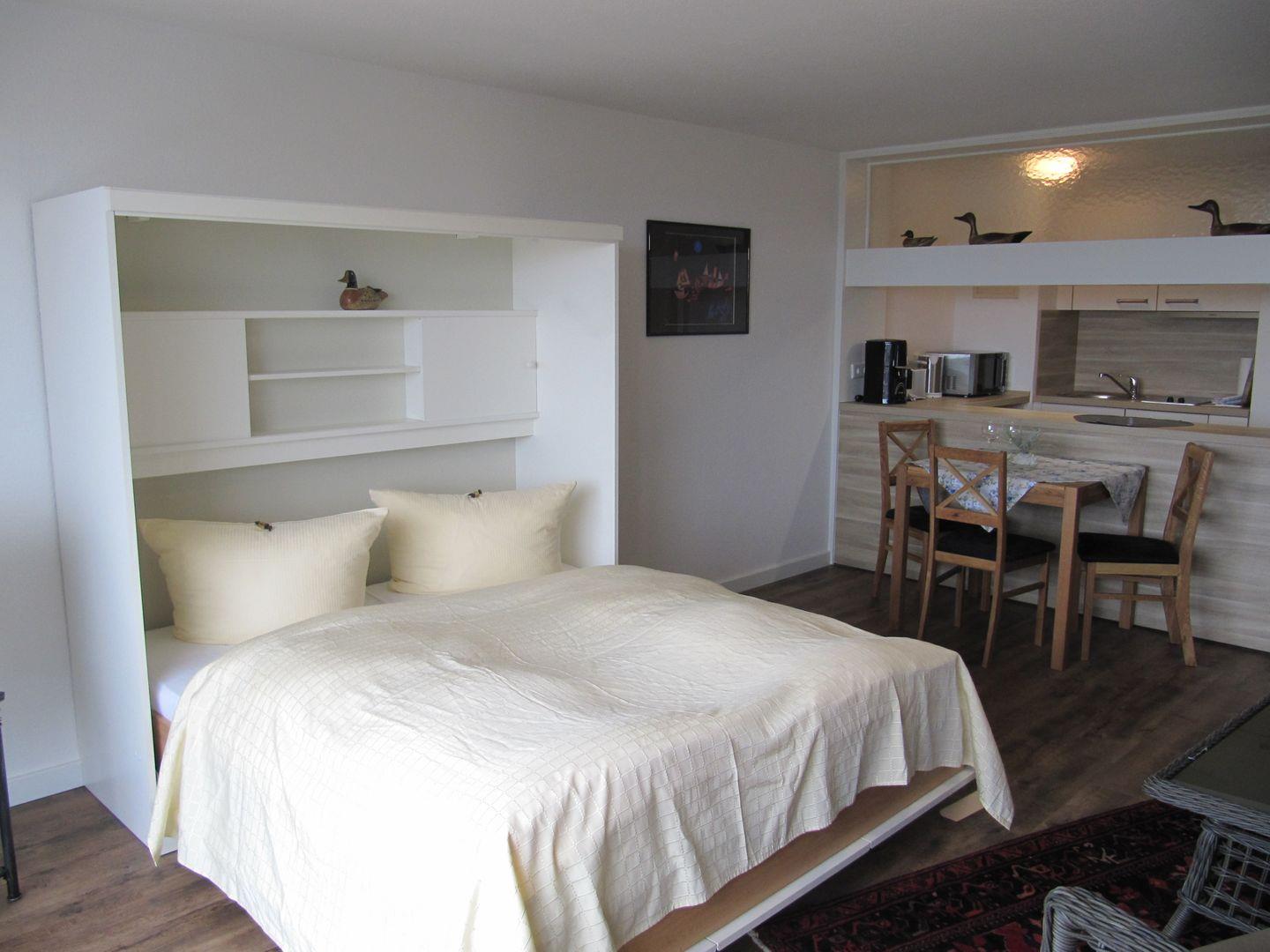 Das Appartement überzeugt durch seine offene Raumgestaltung. Die gut ausgestattete Küchenzeile mit einem Kühlschrank, Wasserkocher und einer Kaffeemaschine ermöglicht es Ihnen, kulinarische Köstlichkeiten selbst zuzubereiten. Das Wohnzimmer, das nahtlos in die Küche übergeht, lädt dazu ein, einen gemütlichen Abend vor dem Fernseher zu verbringen oder einfach die Zeit mit einem guten Buch zu genießen.