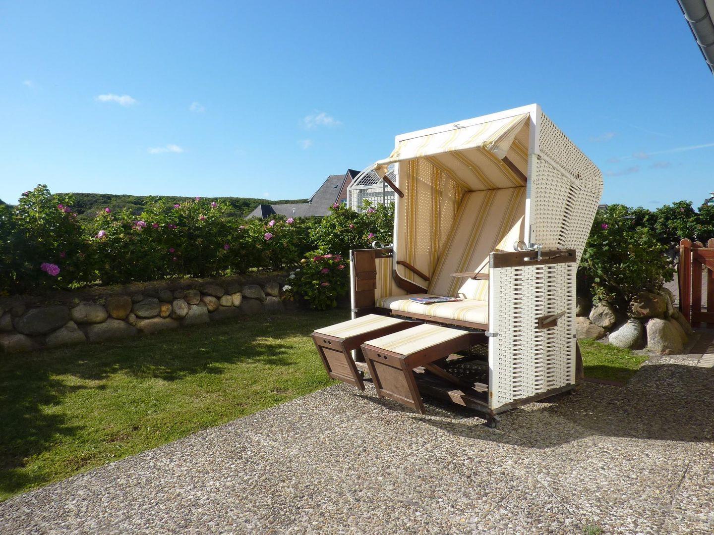 Genießen Sie entspannte Stunden auf der Terrasse, die mit Gartenmöbeln ausgestattet ist. Hier können Sie die frische Meeresbrise und die idyllische Umgebung bei einer Tasse Kaffee oder einem guten Buch genießen. Auch der hauseigene Strandkorb lädt ein, sich zurückzulehnen und die Sonne zu genießen. Ein Privatparkplatz sorgt für zusätzlichen Komfort, insbesondere wenn Sie mit dem Auto anreisen.