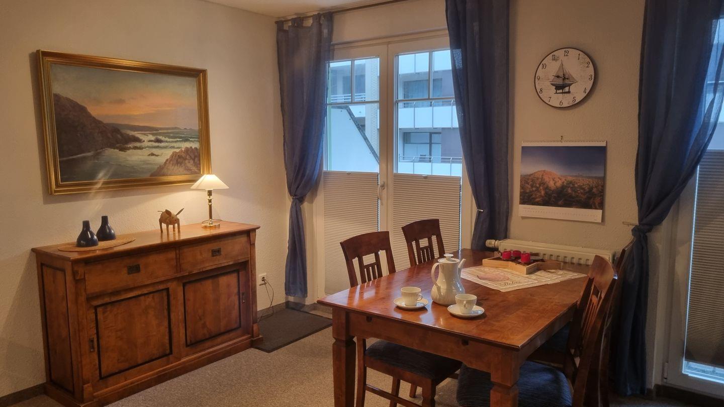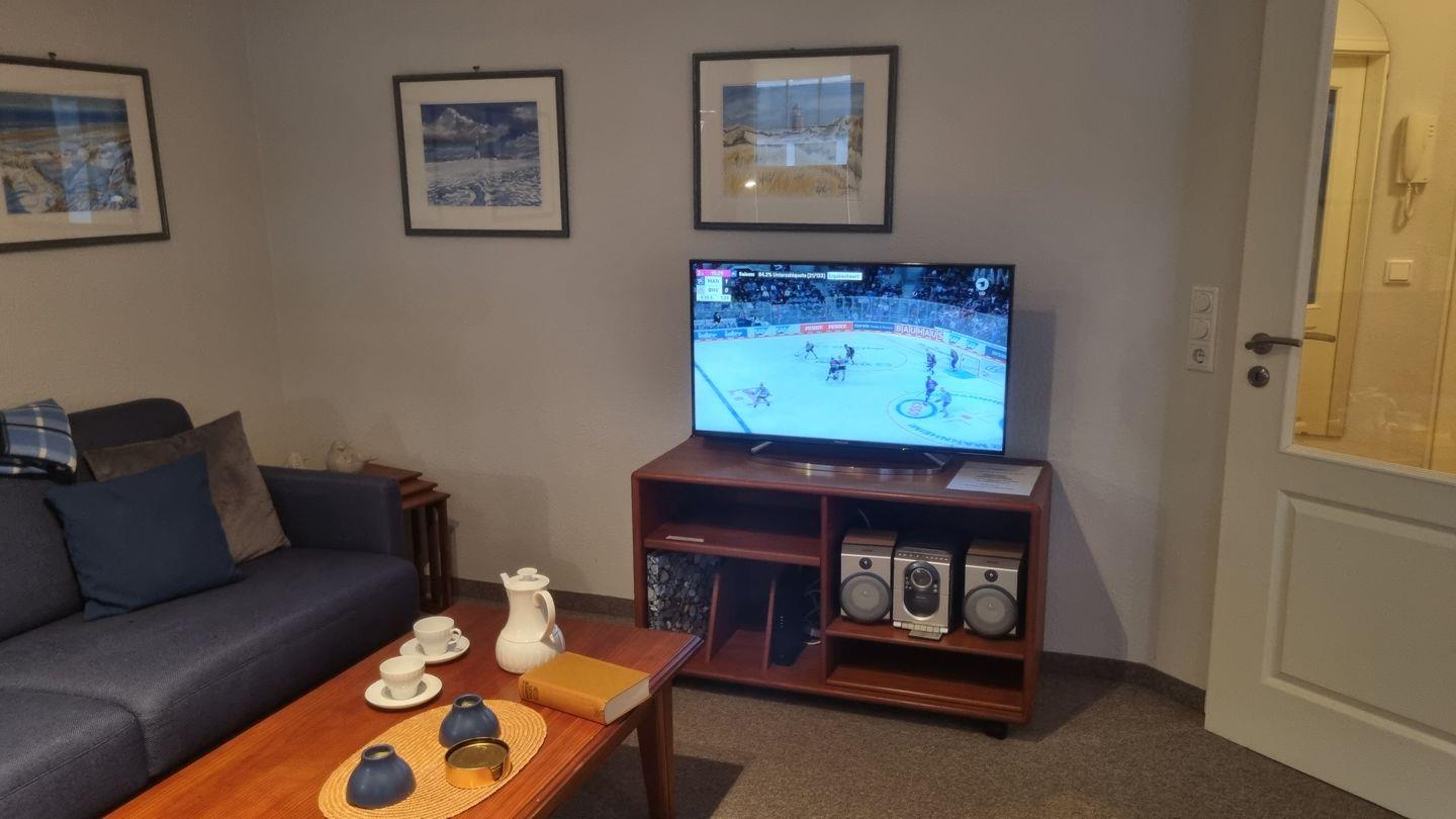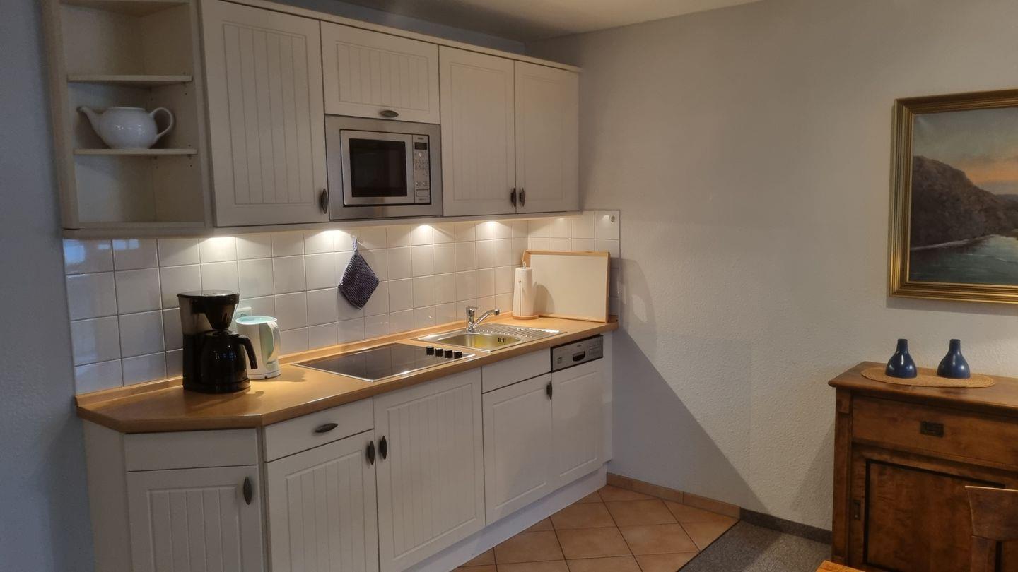 Die Ferienwohnung überzeugt durch eine offene Raumgestaltung, die Ihnen ein Gefühl von Weite und Freiheit vermittelt. Das Wohnzimmer verfügt über ein bequemes Sofa und ist mit einem großen Fernseher (35-44 Zoll) ausgestattet – ideal für gemütliche Filmabende nach einem erlebnisreichen Tag am Strand. Die moderne Küche ist komplett ausgestattet mit einem Cerankochfeld, einer Mikrowelle, einer Spülmaschine, einer Kaffeemaschine und weiteren nützlichen Küchenutensilien, sodass Sie nach Herzenslust kochen und genießen können. Ein Esstisch bietet Platz zum gemeinsamen Essen und Geselligkeit.