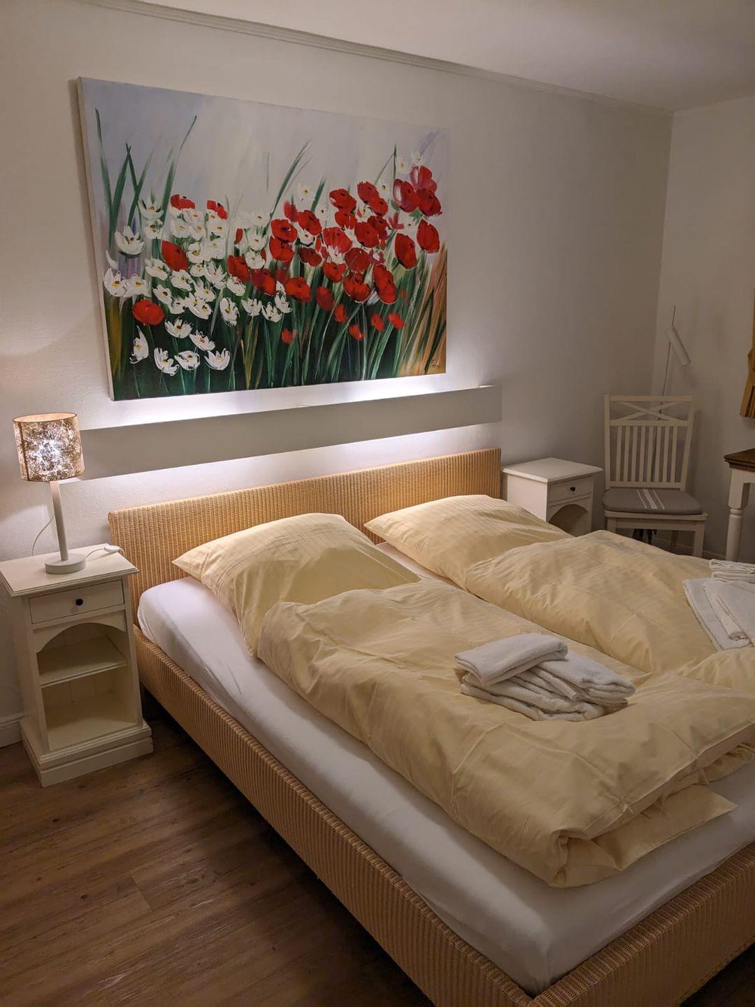 Die Ferienwohnung verfügt über zwei gemütliche Schlafzimmer, in denen Sie nach einem ereignisreichen Tag auf Sylt entspannen können. Jedes Zimmer ist stilvoll eingerichtet und bietet ausreichend Stauraum für Ihre persönlichen Dinge. Das offene Wohnkonzept verbindet den Wohnbereich mit einer voll ausgestatteten Küche, wo Sie Ihre kulinarischen Fähigkeiten unter Beweis stellen können. Die Küche ist mit modernen Geräten wie einem 4-Platten-Herd, einer Spülmaschine, einem Kühlschrank mit Gefrierfach und einer Mikrowelle ausgestattet. Für Kaffee-Liebhaber steht eine Kaffeemaschine bereit, und auch ein Wasserkocher und Toaster sind vorhanden.
