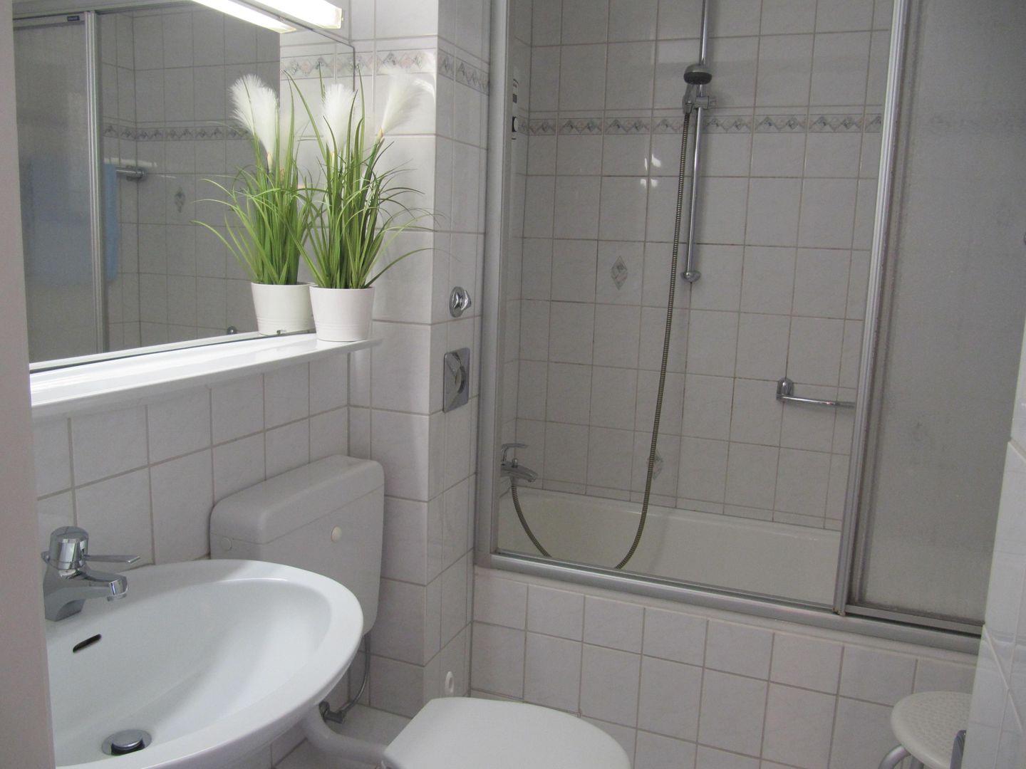 Das Badezimmer ist mit einer Badewanne ausgestattet, die für entspannende Wellness-Momente sorgt – die perfekte Ergänzung nach einem Tag voller Erkundungen auf Sylt. Weitere Annehmlichkeiten wie ein Haartrockner, ein Waschbecken und eine Garderobe schaffen zusätzlichen Komfort.