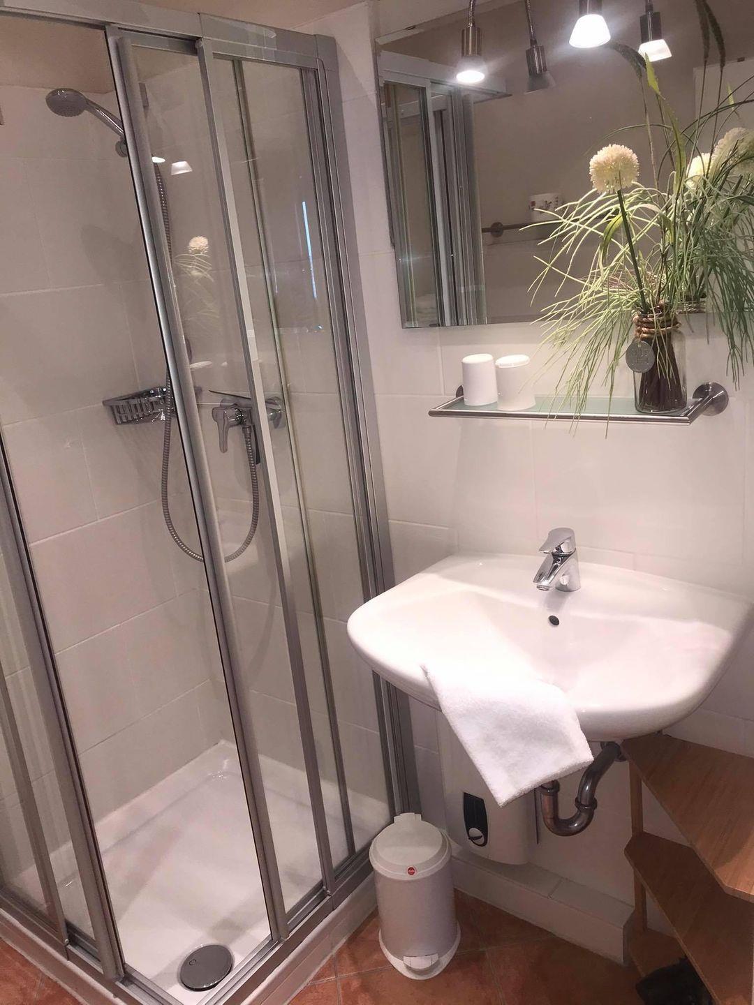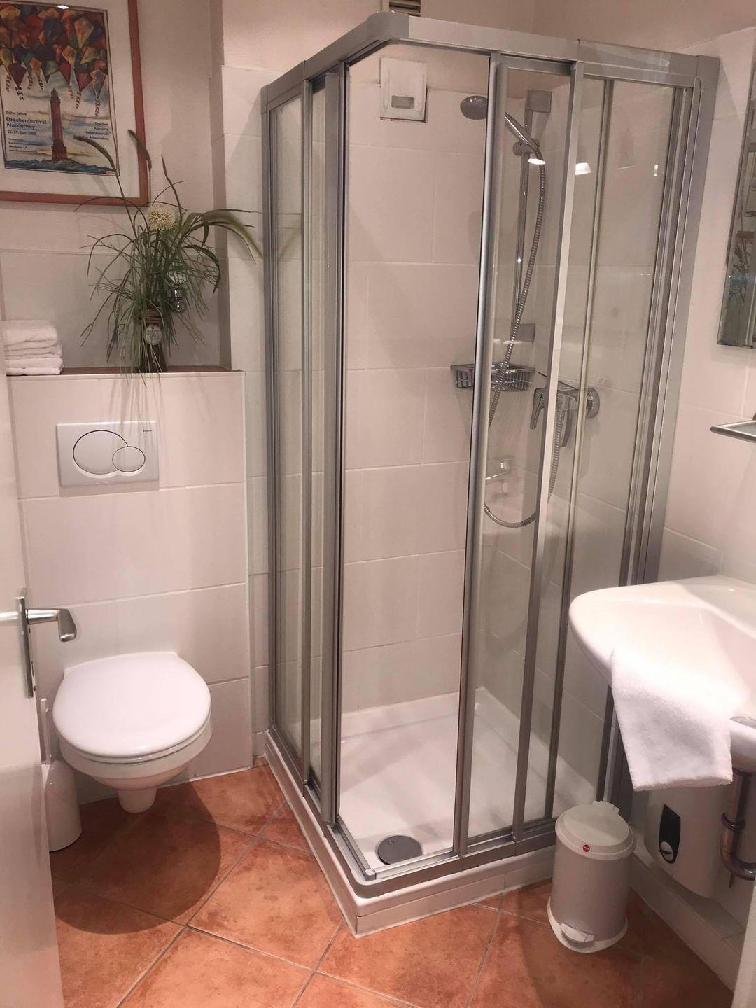 Bad mit Dusche , Wohnzimmer mit einem Doppelbett.
