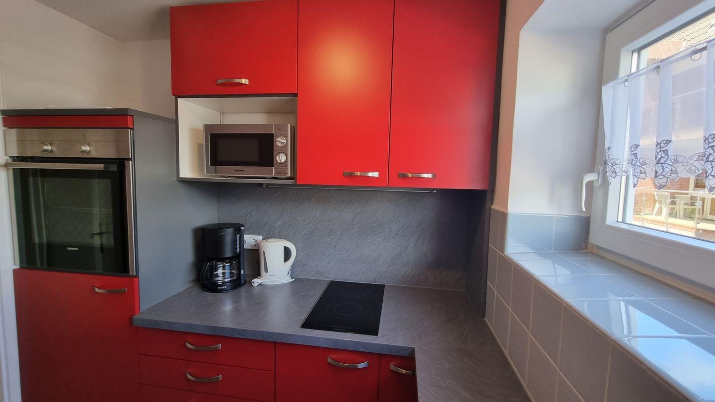 Die offene Küche ist ideal für Selbstversorger, die ihre Kochkünste ausprobieren möchten. Hier finden Sie alles Nötige ausgestattet: einen Backofen, Kühlschrank, Kaffeemaschine, Wasserkocher sowie Geschirr und Besteck. Ein einladender Esstisch lädt zum gemeinsamen Speisen ein. Das gemütliche Sofa im Wohnbereich rundet das harmonische Ambiente ab und bietet sich perfekt an, um nach einem Tag am Strand zu entspannen und den Abend bei einem guten Film auf dem Fernseher ausklingen zu lassen. Selbstverständlich ist die Wohnung auch mit kostenlosem WLAN ausgestattet, damit Sie jederzeit mit Familie und Freunden in Kontakt bleiben oder Ihre Urlaubsfotos in die sozialen Medien teilen können.