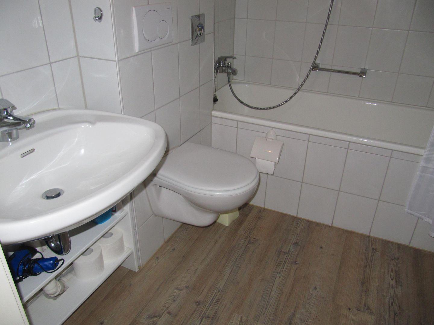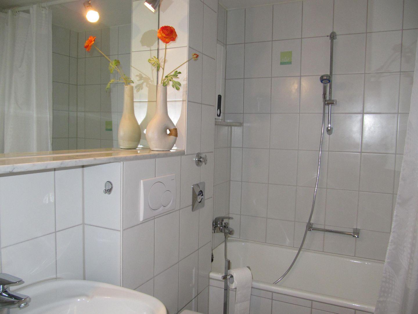 Das Badezimmer ist mit einer Badewanne ausgestattet, die Ihnen nach einem langen Tag erholsame Momente des Entspannens bietet. Darüber hinaus sind alle notwendigen Annehmlichkeiten wie Haartrockner und Waschbecken vorhanden – hier fühlen Sie sich wie zu Hause.