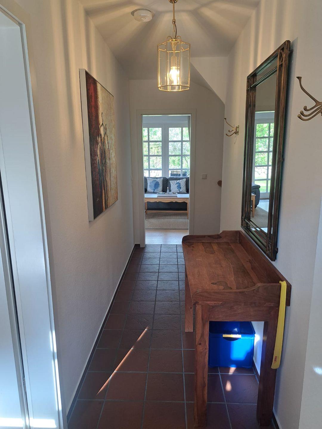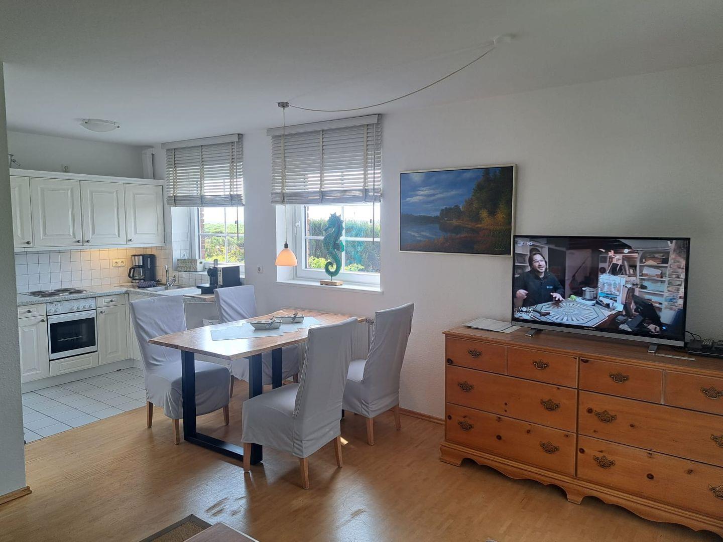 Das Wohnzimmer bietet einen einladenden Platz zum Entspannen. Genießen Sie die Zeit auf dem komfortablen Sofa oder erleben Sie einen Filmabend mit der HiFi-Anlage oder dem Fernseher. Von hier aus gelangen Sie direkt auf die Terrasse, die mit Gartenmöbeln ausgestattet ist. Verbringen Sie entspannte Stunden im Freien, genießen Sie die frische Meeresbrise und lassen Sie den Alltag hinter sich. Ein Strandkorb erwartet Sie auf der Terrasse und lädt zum Entspannen in der Sonne ein.