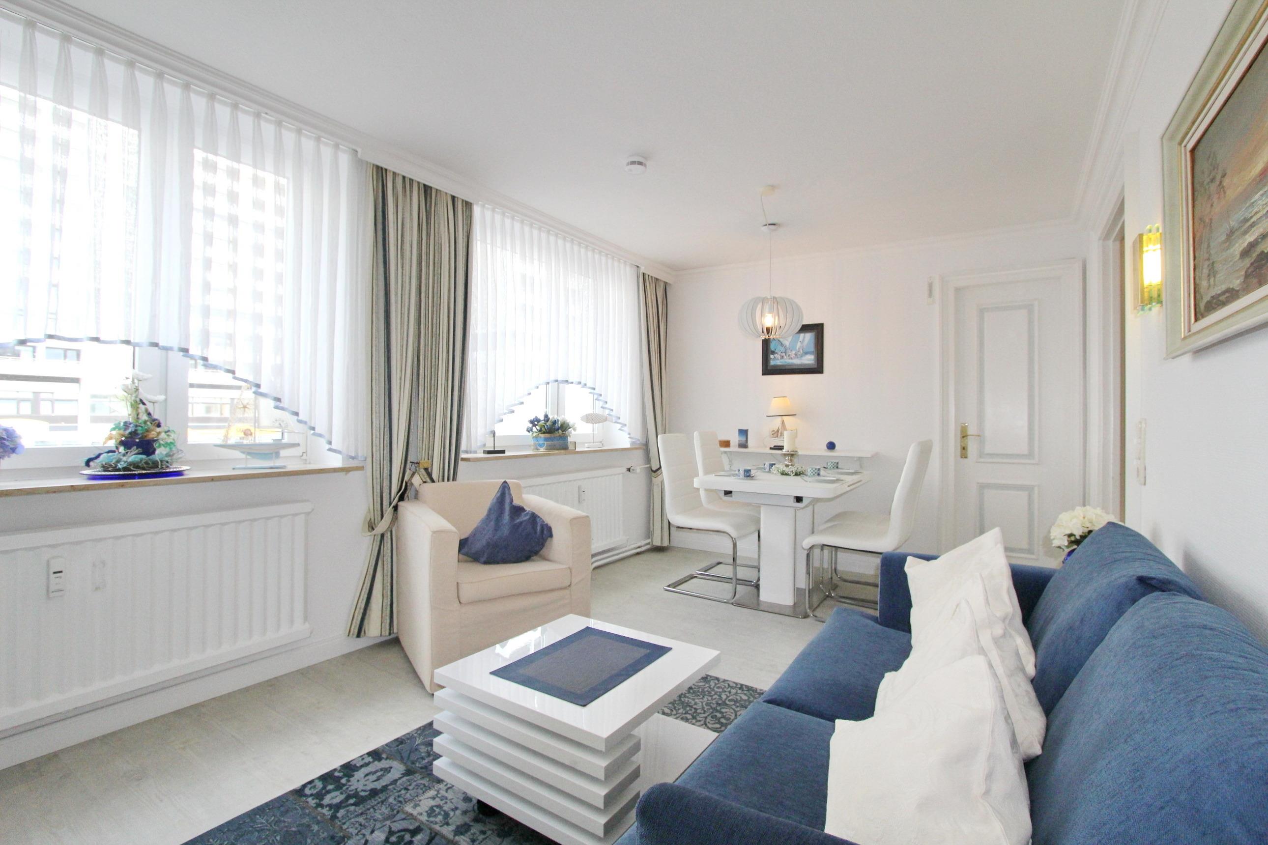 Maritim eingerichtete Dreizimmerwohnung in der 1. Etage in unmittelbarer Nähe zur Innenstadt und der Promenade von Westerland. Nur wenige Schritte trennen Sie von der Nordsee. Das Wohnzimmer verfügt über eine gemütliche Couch mit Sessel und einen Essplatz mit 4 Stühlen. Die komplette Fensterfront ist nach West ausgerichtet und lässt viel Licht in die Wohnung . Das 1. Schlafzimmer hat ein Doppelbett und einen begehbaren Kleiderschrank mit viel Stauraum. Im 2. Schlafzimmer befindet sich ein Etagenbett und ein Kleiderschrank. Die Küche ist separat und hat einen Backofen, Geschirrspüler und einen Herd mit 4 Ceranfeldkochstellen. Die umfangreiche Küchenausstattung ermöglicht es Ihnen sich selbst zu verpflegen. Das Badezimmer ist ausgestattet mit einer Dusche, einem Handtuchheizkörper und Fön. Besonders hervorzuheben ist die Waschmaschine im Bad zur Alleinnutzung. Den passwortfreien WLAN-Hotspot im Haus (WEG-AD3 - Passwortfrei - ohne Gewähr) können sie gerne kostenfrei nutzen. Die Größe dieser Nichtraucherwohnung ist ca. 50 m². Haustiere sind nicht gestattet. Der Stellplatz zur Wohnung ist separat buchbar (dieser befindet sich ca. 100m vom Objekt entfernt in der Elisabethstr./hinter Steffi Moden, Parkplatz Knoche) und kostet 10,00 Euro pro Tag.