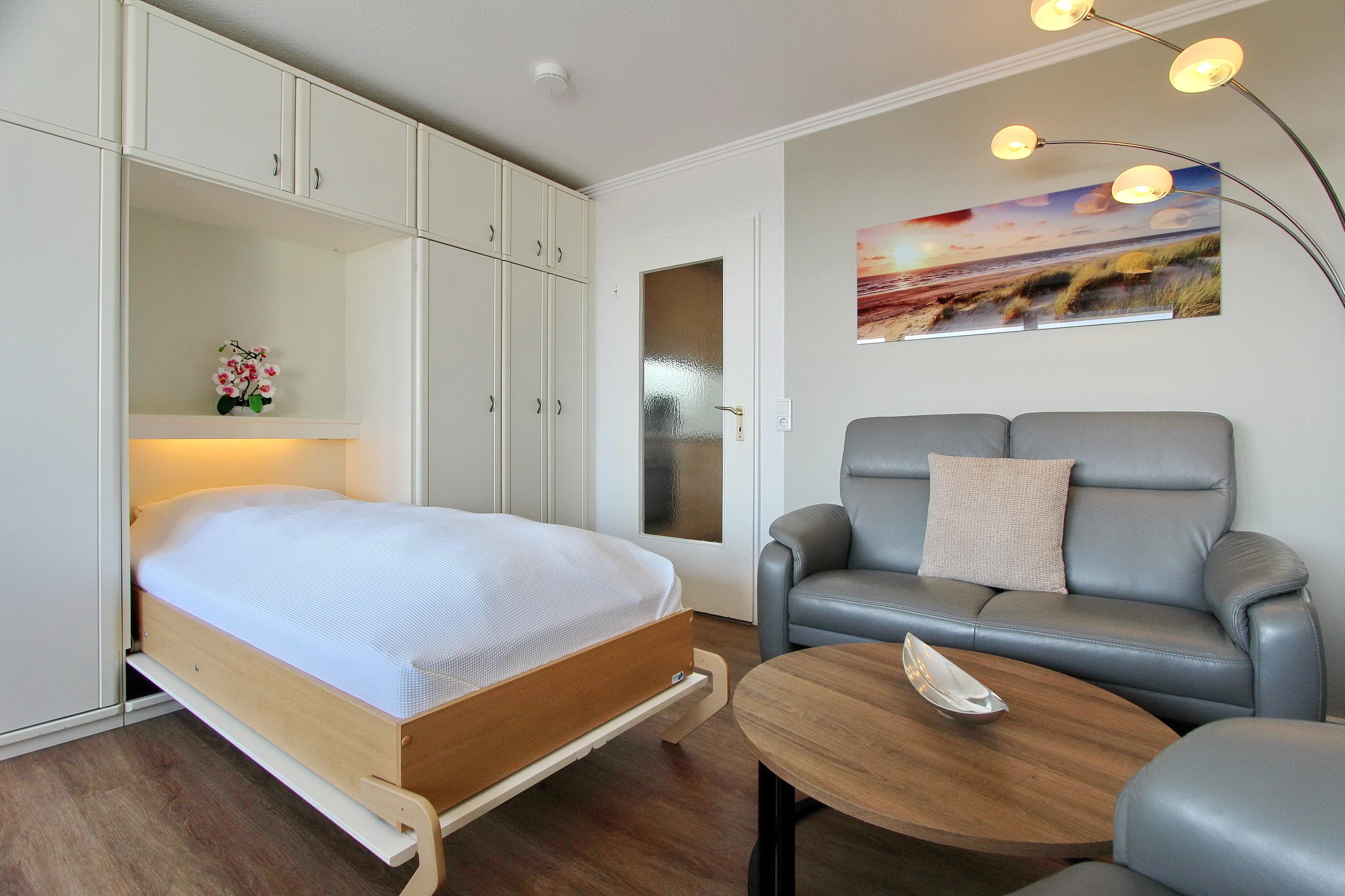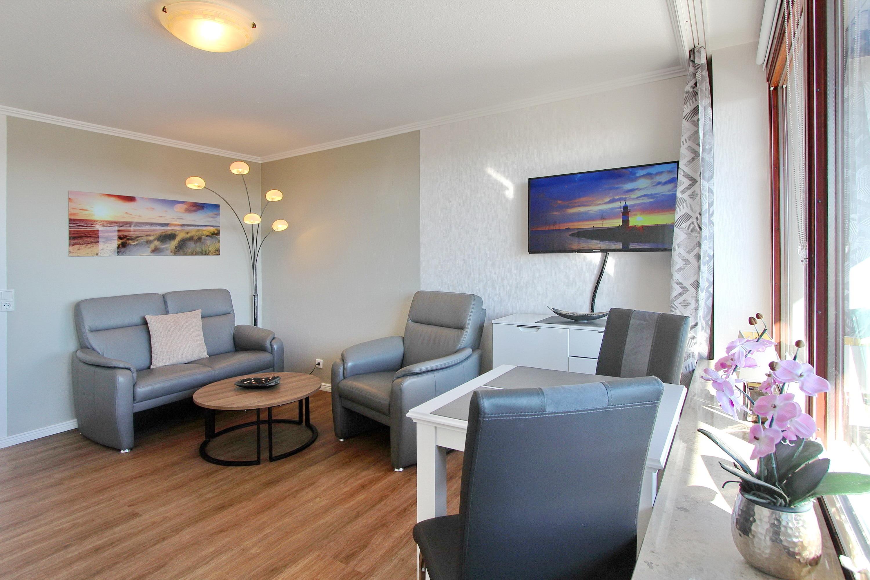 Diese mit viel Liebe zum Detail eingerichtete Einzimmerwohnung in der 5. Etage im Haus am Meer, liegt nur wenige Schritte vom Strand und Meer entfernt. Der hell und freundlich dekorierte Wohn-/Schlafraum verfügt über einen Ostbalkon mit Balkonmöbel mit Sitzauflagen laden zum Verweilen ein. Wenn die Sonne scheint, können sie hier, vollkommen geschützt, das Frühstück genießen und das Treiben auf der Friedrichstraße beobachten. Diese Nichtraucherwohnung ist mit Einzelschrankbetten, einem Essplatz am Fenster mit 2 Stühlen, sowie einer gemütlichen Sitzgruppe mit Couch und Sessel ausgestattet. In der ganzen Wohnung wurde hochwertiger Holzfussboden verlegt. Das moderne Badezimmer hat eine Dusche mit flachem Einstieg, einen Fön, Kosmetikspiegel und einen Handtuchtrockner. In der Küchenzeile im Flur mit Backofen, Ceranfeld und Geschirrspüler ist alles vorhanden um sich selbst zu verpflegen. Zur technischen Ausstattung dieser Wohnung gehört ein Smart- TV von Panasonic sowie ein kostenfreier WLAN-Anschluss (WEG Haus am Meer - Passwortfrei - ohne Gewähr). Diese Nichtraucherwohnung hat eine Größe von: ca. 30 m². Hunde sind ausdrücklich willkommen.