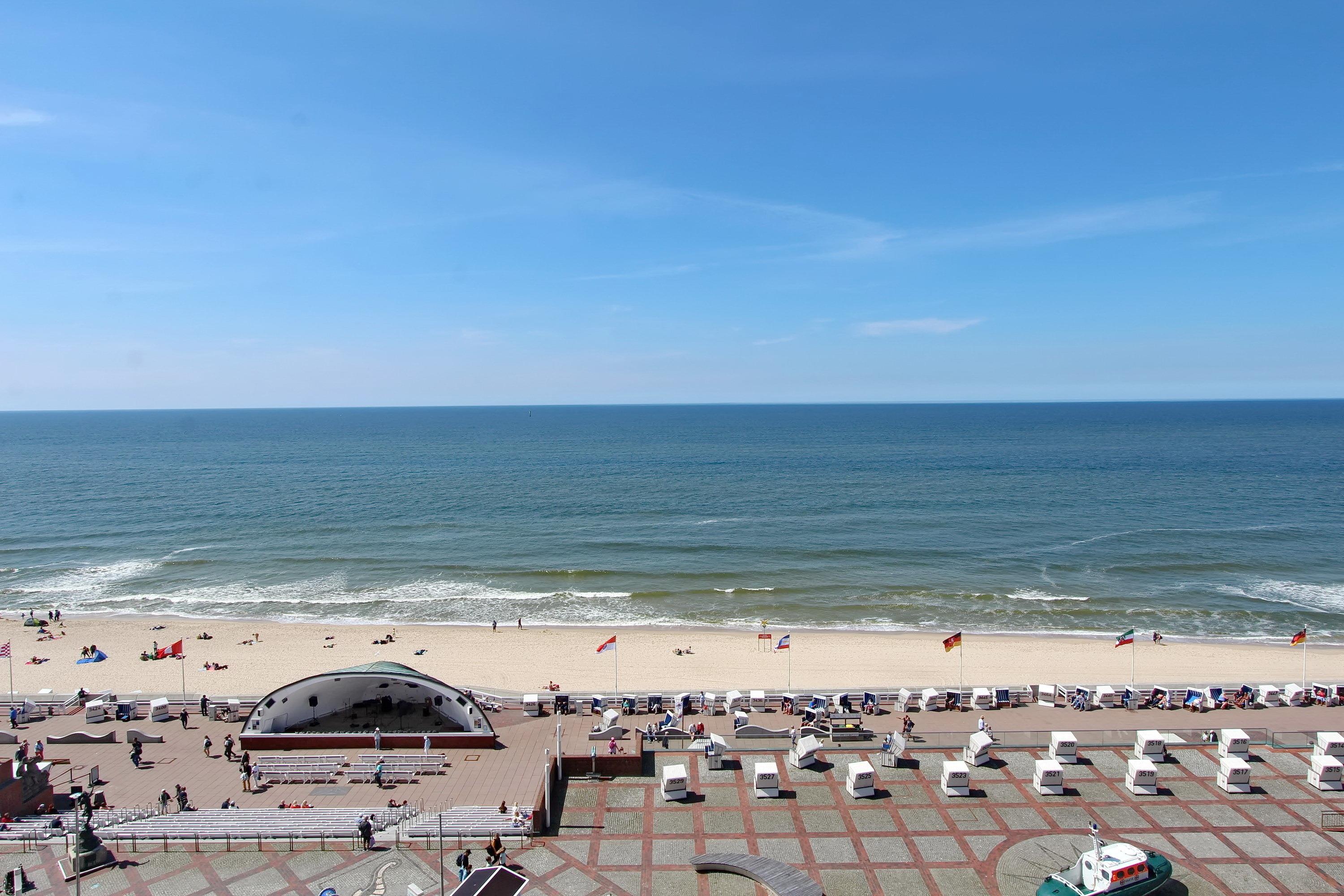 Wunderschöne Einzimmerwohnung in der 6. Etage im Haus Metropol mit herrlichem Blick über Strand und Nordsee. Der Wohn-/Schlafraum mit vorgelagertem, großen Westbalkon ist hell und freundlich eingerichtet. Ein Doppelschrankbett, Essplatz mit 2 Rattanstühlen am Fenster sowie eine komfortable, ansprechende Sitzgruppe und Fernsehsessel mit Fußhocker sind vorhanden. Das Badezimmer hat eine Dusche. Im Flur befindet sich eine Einbauküche mit Ceranfeld, Mikrowelle und Geschirrspüler. Zur technischen Ausstattung gehört: ein Flachbildfernseher und ein Radio mit CD Spieler. Ein freies WLAN Netzwerk (WEG Haus Metropol - Passwortfrei - ohne Gewähr) steht ihnen kostenfrei zur Verfügung. Wohnungsgröße: ca. 42 m².