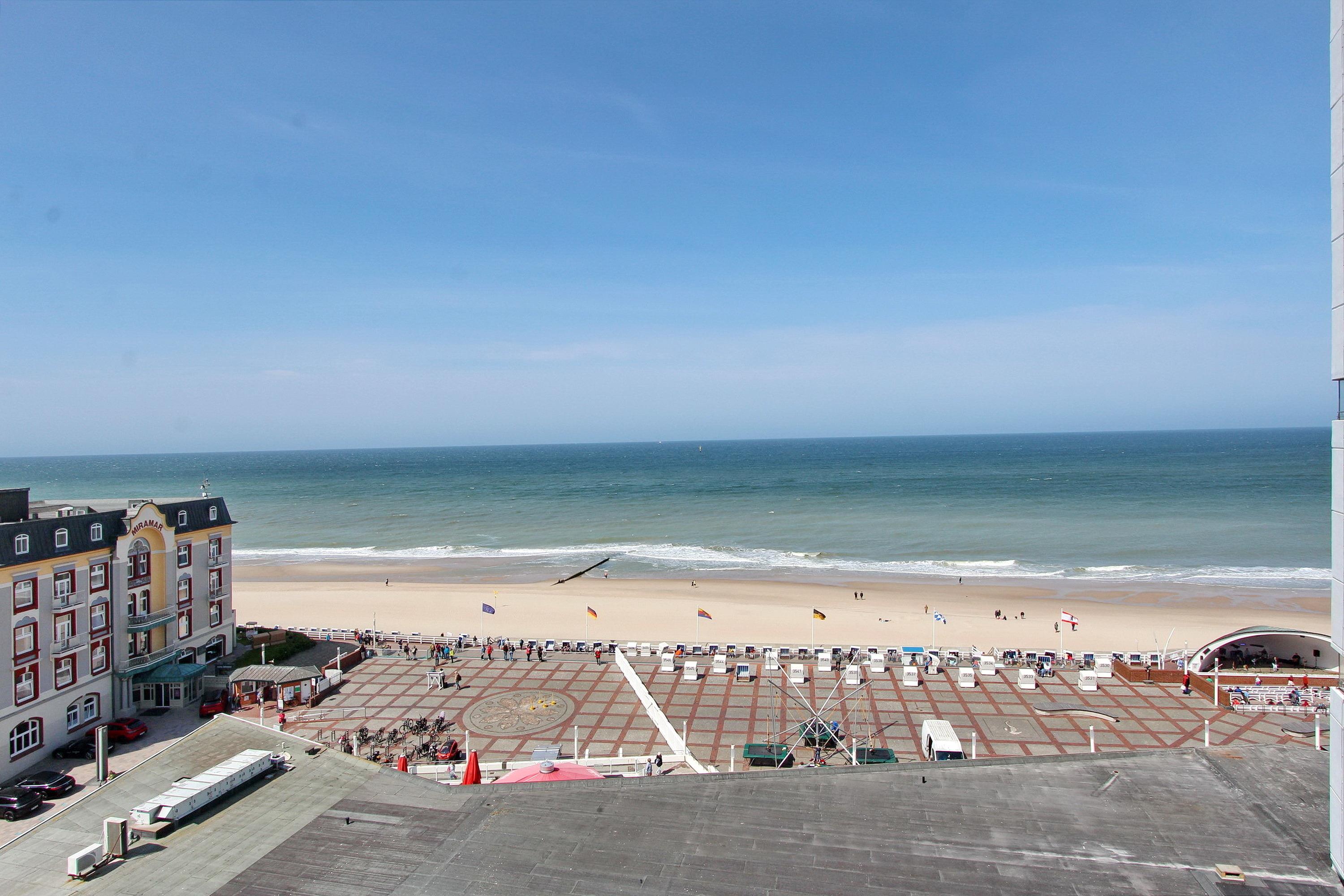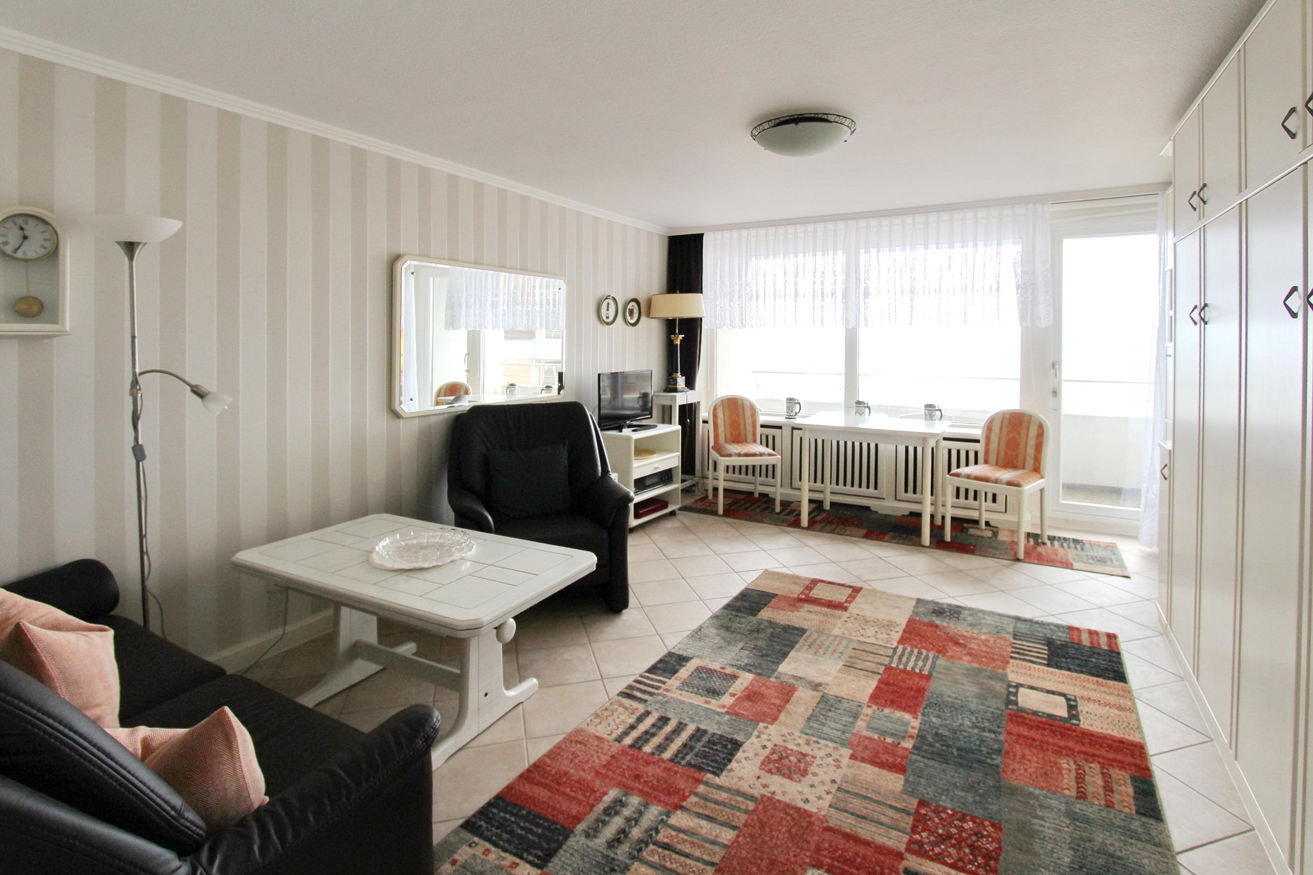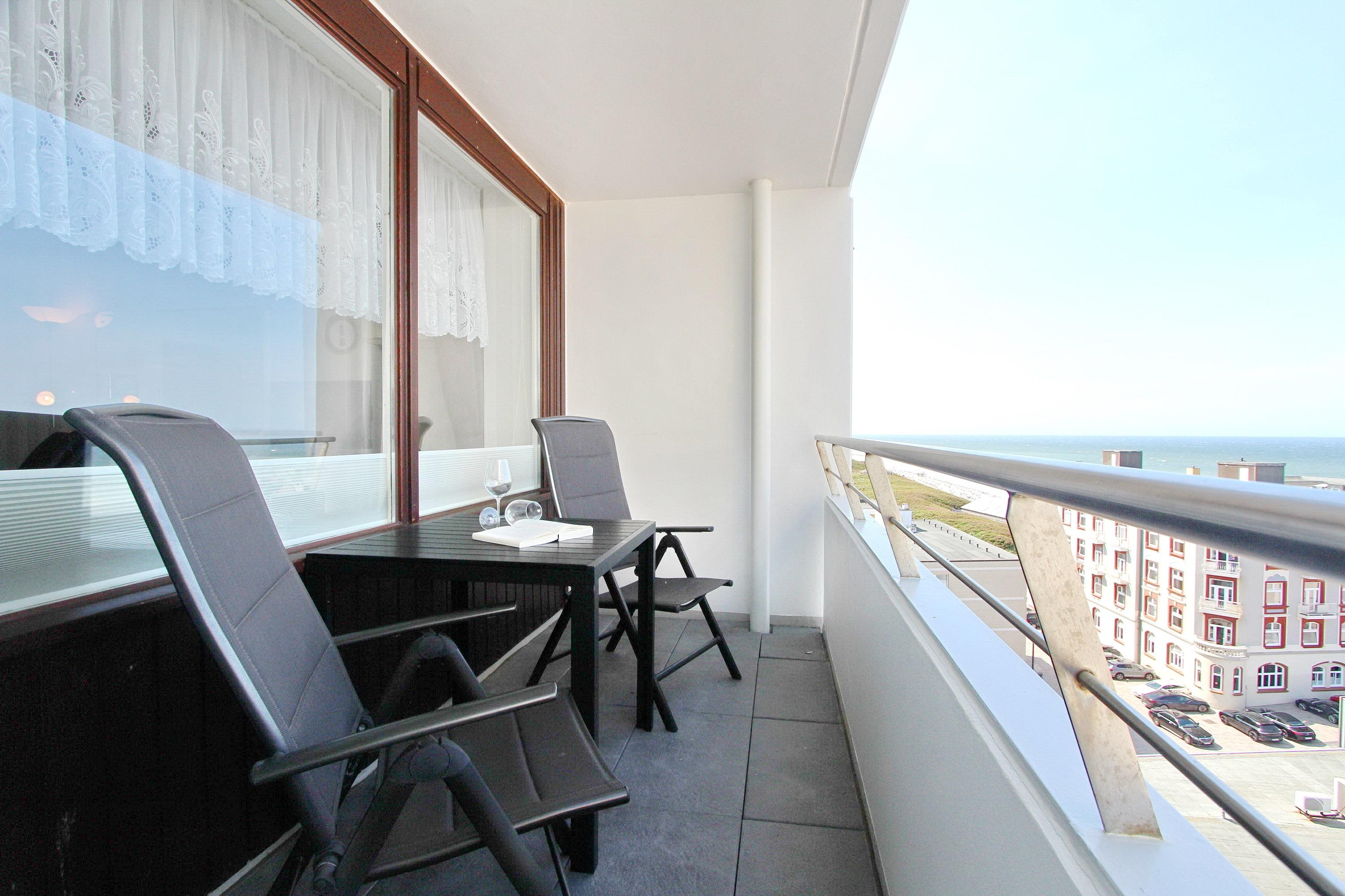 In der 7. Etage des Haus am Meer befindet sich diese Einzimmerwohnung zur Westseite. Sie hat einen tollen Blick auf die Nordsee und die Promenade ... sogar die Musiker in der Musikmuschel können sie noch sehen. Der kombinierte Wohn-/Schlafraum mit vorgelagertem Westbalkon (Balkonmöbel mit Auflagen sind vorhanden) verfügt über Einzelschrankbetten, einen Fliesenboden, einen Essplatz mit 2 Stühlen am Fenster und eine Couchgarnitur mit Fernsehsessel. Das moderne Badezimmer hat eine Dusche mit niedrigem Einstieg, einen Duschhocker und viel Abstellfläche für ihre persönlichen Dinge. In der Küchenzeile mit Backofen und 3 Herdplatten können sie sich selbst verpflegen. Zur technischen Ausstattung gehört: ein Flachbildfernseher und ein Radio. Kosten-und passwortfreier Zugang zum WLAN Hot Spot des Gebäudes (WEG Haus am Meer - Passwortfrei - ohne Gewähr). Wohnungsgröße: ca. 34 m².