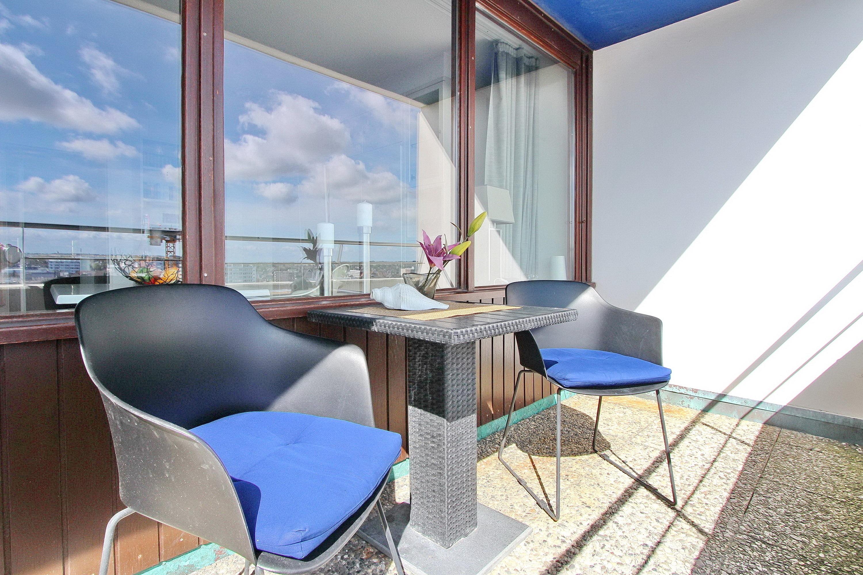 Diese gemütliche Einzimmerwohnung befindet sich in der 7. Etage des Haus am Meer. Nur wenige Schritte sind es bis zum Strand und der Westerländer Promenade. Der kombinierte Wohn-Schlafraum ist modern und ansprechend eingerichtet und verfügt über einen Balkon zur Ostseite mit Möbeln und Sitzauflagen. Einzelschrankbetten, ein Essplatz am Fenster mit 2 DAW Chair Designerstühlen, sowie eine komfortable Sitzgruppe mit einem Sessel stehen ihnen zur Verfügung. In der Wohnung wurde Laminatboden verlegt. Das Badezimmer hat eine Dusche, einen Fön und einen beheizten Handtuchtrockner. In der separaten Küche mit offenem Esstresen, Geschirrspüler, zusätzlicher Nespressomaschine, Ceranfeld und Mikrowelle, können sie sich selbst verpflegen. Zur technischen Ausstattung dieser Nichtraucherwohnung gehört: ein Flachbildfernseher und ein Radio mit CD Spieler. Der Zugang zum WLAN Hot Spot (WEG Haus am Meer - Passwortfrei - ohne Gewähr) ist kostenfrei. Wohnungsgröße: ca. 38 m².