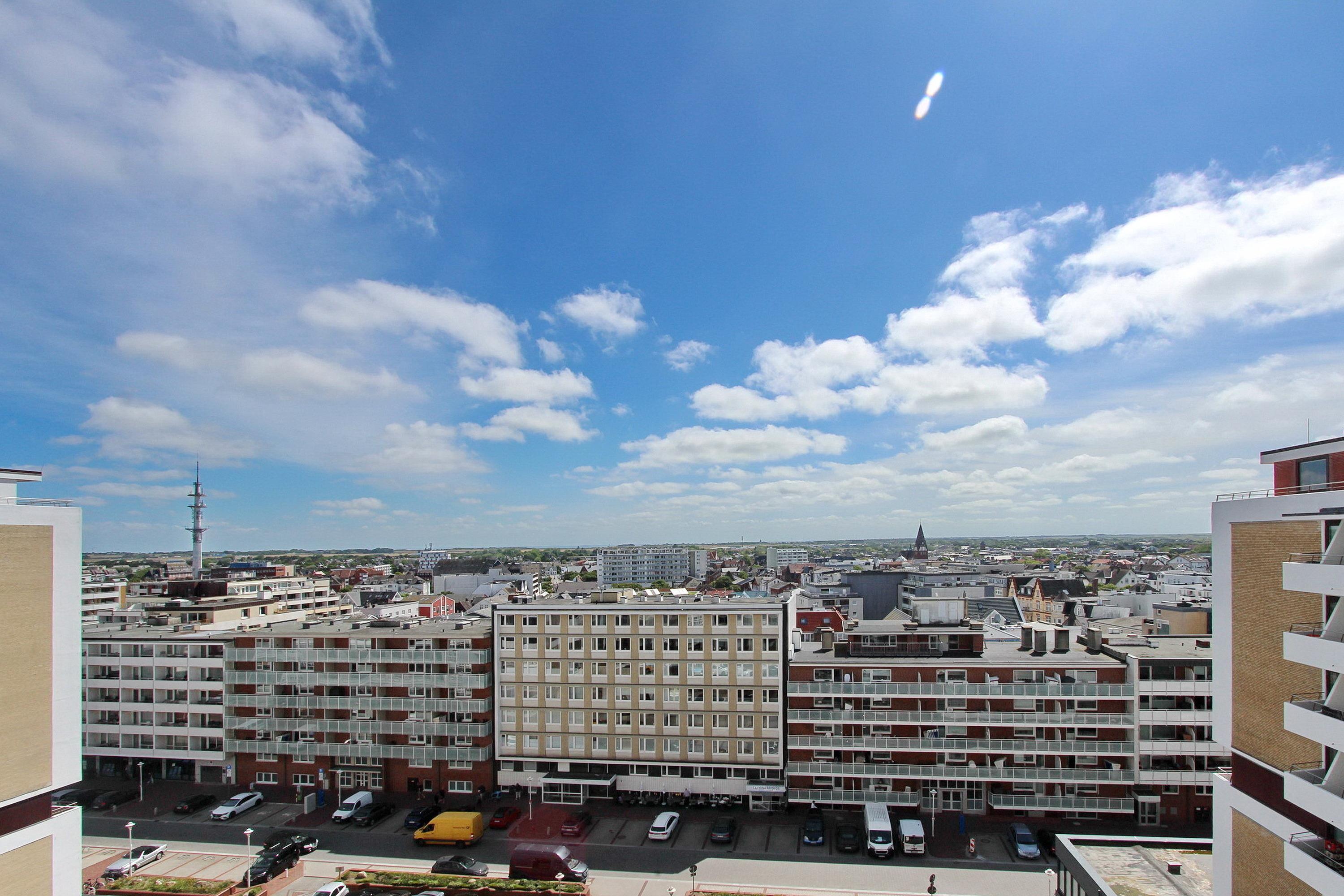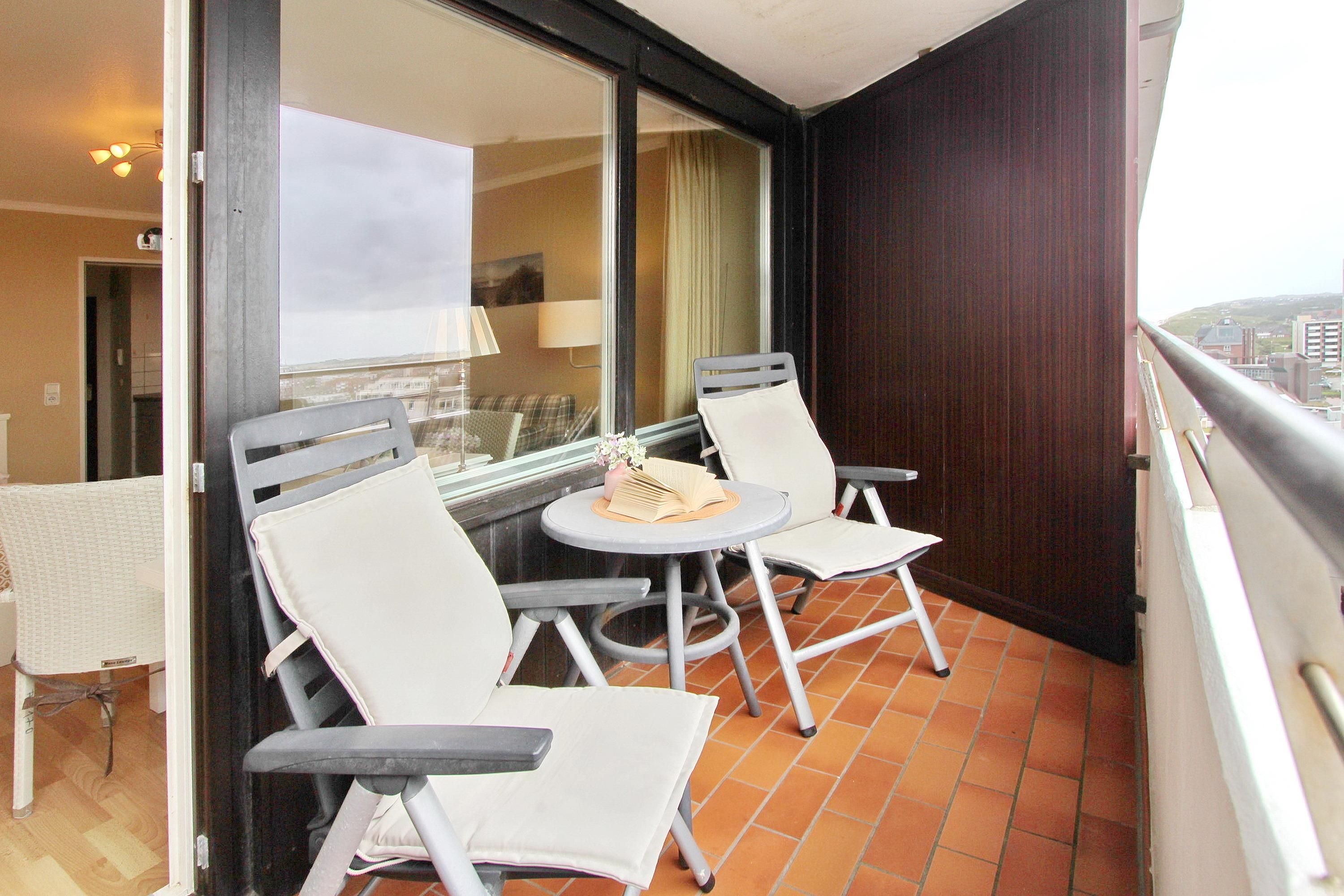 Hell und freundlich eingerichtete Einzimmerwohnung in der 7. Etage im Haus Metropol mit wunderschönem Weitblick über die Insel und die Stadt. Vom Ostbalkon mit Balkonmöbeln (der Firma Kettler) können Sie bei schönem Wetter sogar das Wattenmeer sehen. Der kombinierte Wohn-/Schlafraum verfügt über ein feststehendes Doppelbett mit 2 Matratzen, einen Kleiderschrank, eine Couch und einen Essplatz mit 2 Stühlen am Fenster. Designfussboden in Holzoptik und hochwertige Schreinereinbauten verleihen dem Raum Wärme und Gemütlichkeit. Das stimmige Farbkonzept in Erdtönen trägt ebenfalls dazu bei. Das Badezimmer hat eine Dusche und im Flur gibt es eine moderne Einbauküche mit Mikrowelle, Geschirrspüler und 2 Platten-Ceranfeld. Hier können sie kleine Mahlzeiten zubereiten. Diese Nichtraucherwohnung ist ausgestattet mit einem Smart-Flachbildfernseher und einem Radio. Ein freies WLAN Netzwerk (WEG Haus Metropol - Passwortfrei - ohne Gewähr) steht ihnen kostenfrei zur Verfügung. Wohnungsgröße: ca. 30 m².