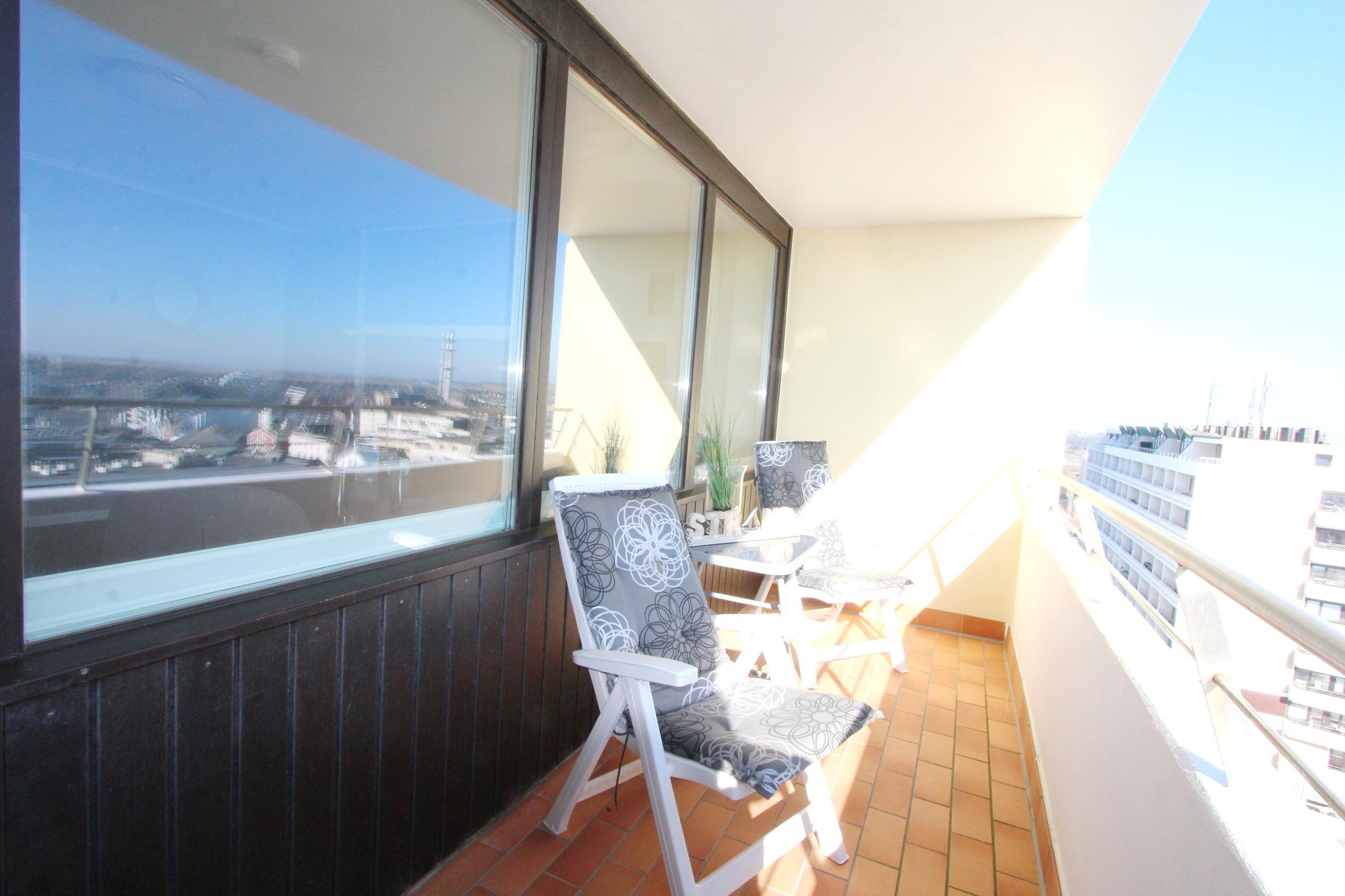 Einzimmerwohnung in der 9. Etage im Haus Metropol mit herrlichem Weitblick über die Insel und die Stadt Westerland. Bei klarem Wetter können sie bis zum nordfriesischen Wattenmeer und dem Festland schauen. Der kombinierte Wohn-/Schlafraum hat einen vorgelagerten großen Ostbalkon mit Balkonmöbeln und Auflagen. Ein Doppelschrankbett, ein Essplatz mit 2 Stühlen am Fenster, eine Couch und 2 Fernsehsessel mit Fusshockern und viel Schrankfläche, für Ihre persönlichen Dinge, steht ihnen zur Verfügung. Im Wohnraum wurde Designboden verlegt. Das Badezimmer hat eine Dusche, einen Duschhocker und einen Handtuchtrockner. In der separaten Küche mit Mikrowellen Backkombination, Ceranfeld mit 4 Herdplatten, Geschirrspüler und zusätzlicher Senseo Padmaschine können sie sich selbst verpflegen. Zur technischen Ausstattung dieser Wohnung gehört: ein Flachbildfernseher und ein Radio mit CD Player. Das freie WLAN Netzwerk Hotspot (WEG Haus Metropol - Passwortfrei - ohne Gewähr) steht ihnen kostenfrei zur Verfügung. Wohnungsgröße ca. 38 m².