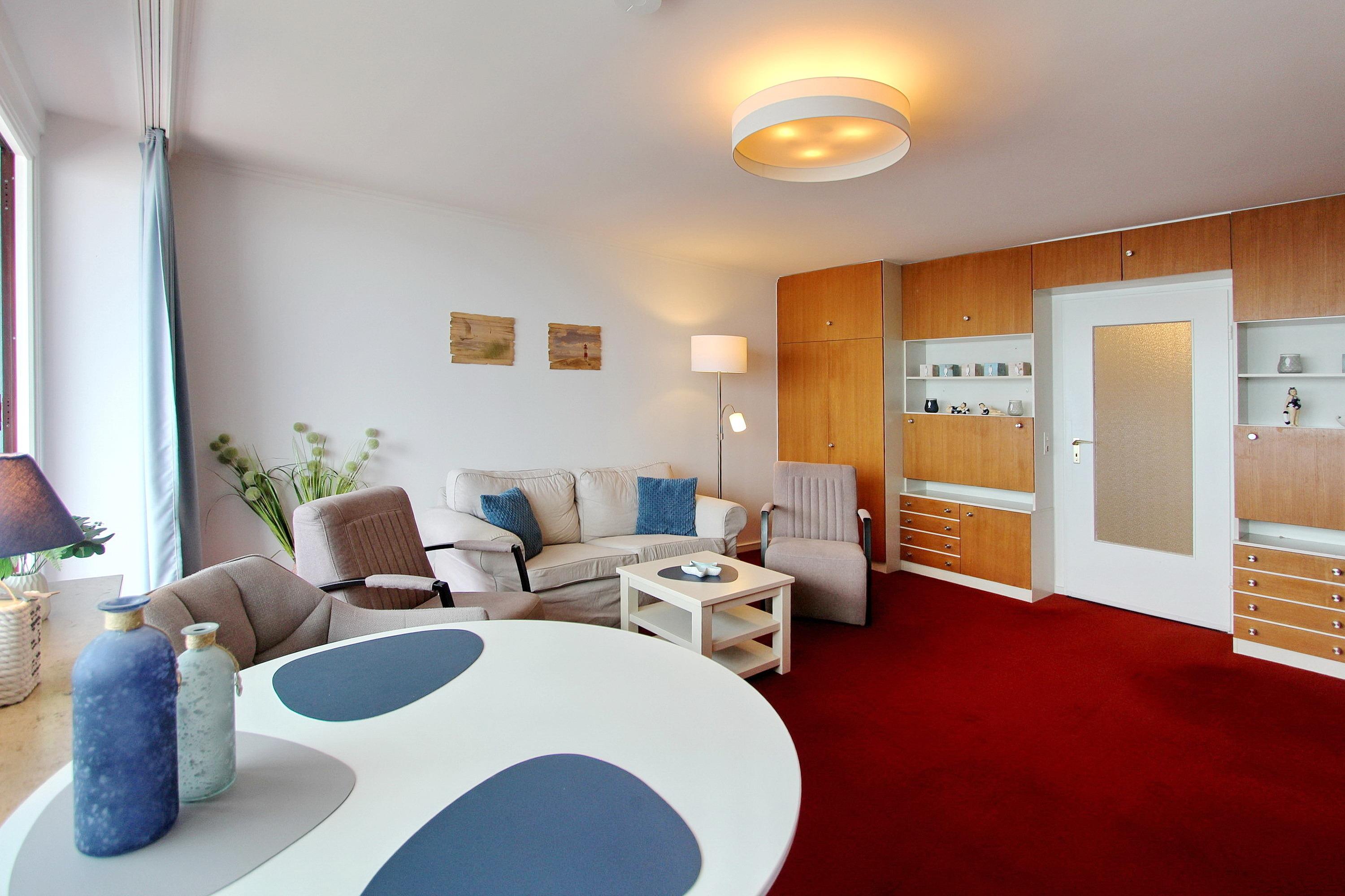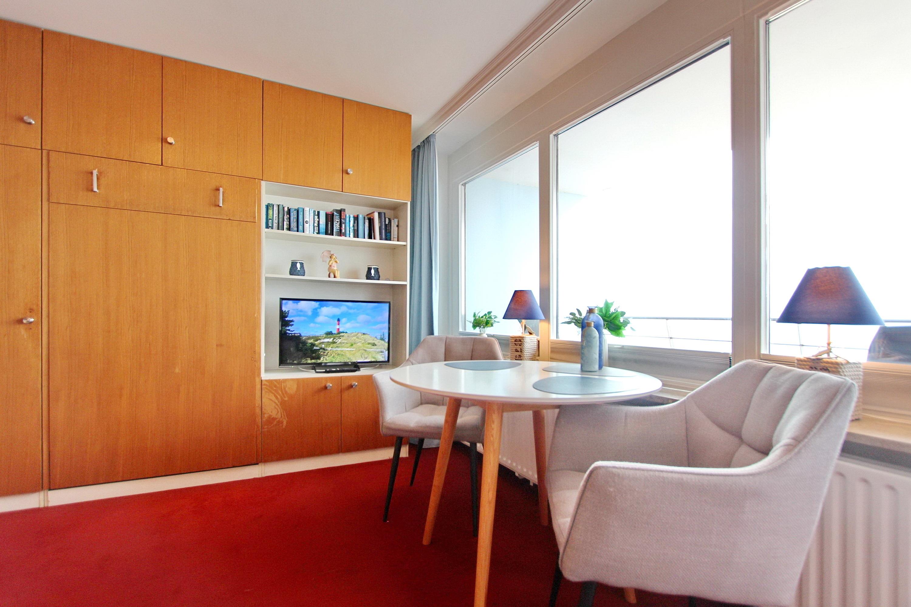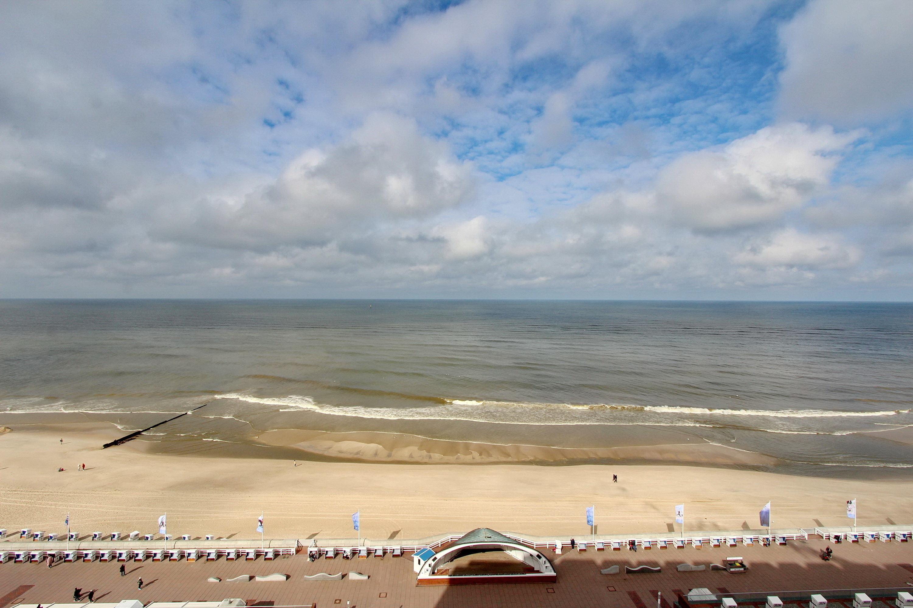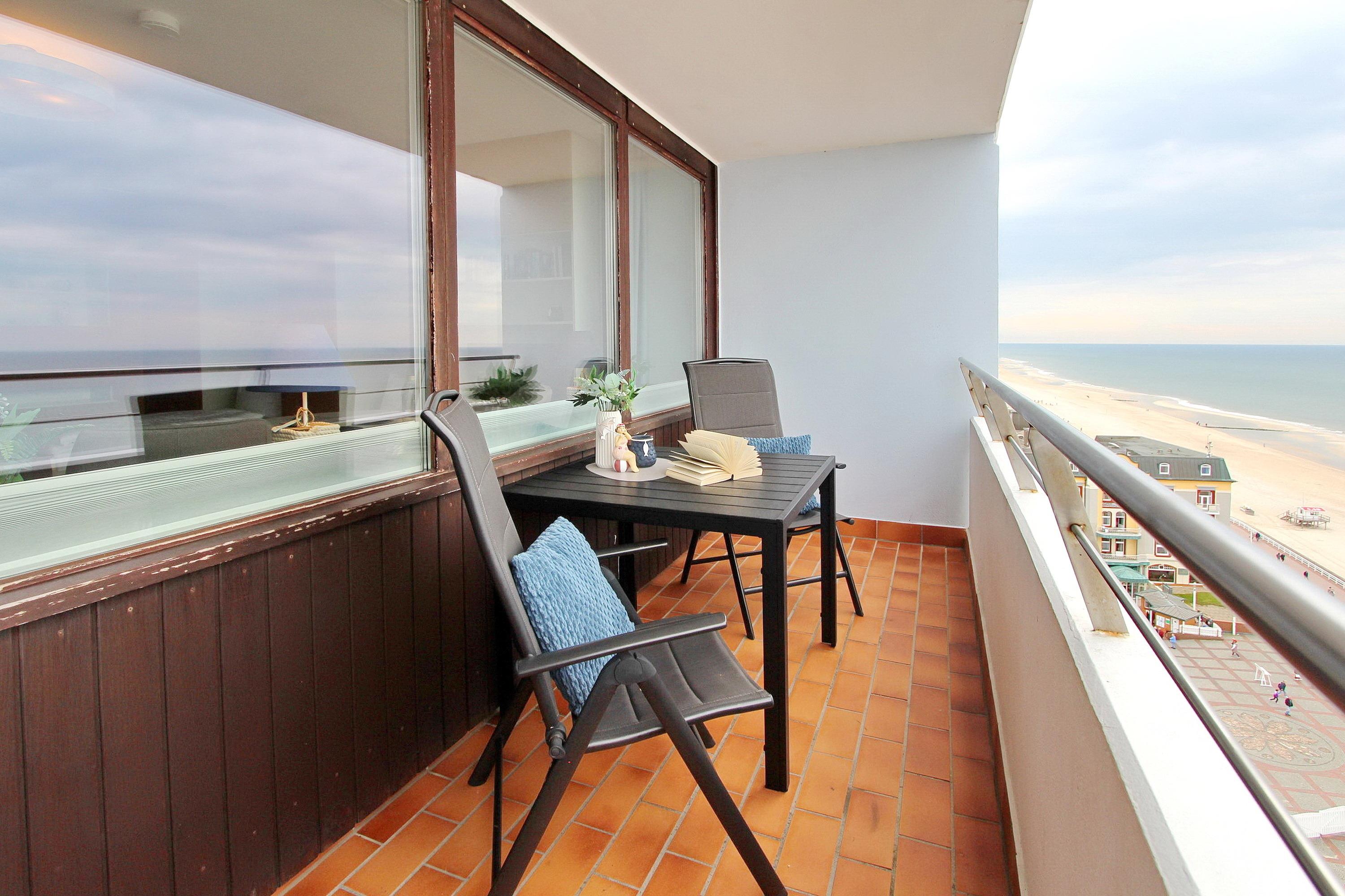 Einzimmerwohnung in der 11. Etagen im Haus Metropol mit einem herrlichen Blick über den Strand und die Nordsee. Der Wohn-/Schlafraum hat einen vorgelagerten Westbalkon mit Balkonmöbeln, zwei Einzelschrankbetten (mit Lücke zwischen den einzelnen Betten), einen Essplatz mit 2 Stühlen am Fenster und ein Sofa für 2 Personen. Zwei Sessel sind ebenfalls vorhanden. Der Mix aus alten und neuen Einrichtungselementen verleiht der Wohnung einen speziellen Look. Das Badezimmer hat eine Dusche (mit niedrigem Einstieg), einen Hocker, sowie einen Fön. In der separaten Küche mit Mikrowelle können Sie sich selbst verpflegen. Zur technischen Ausstattung gehört: ein 32 Zoll Flachbildfernseher von Panansonic und ein Radio mit CD Player. Ein freies WLAN Netzwerk (WEG Haus Metropol - Passwortfrei - ohne Gewähr) steht ihnen kostenfrei zur Verfügung. Wohnungsgröße: ca. 42 m².