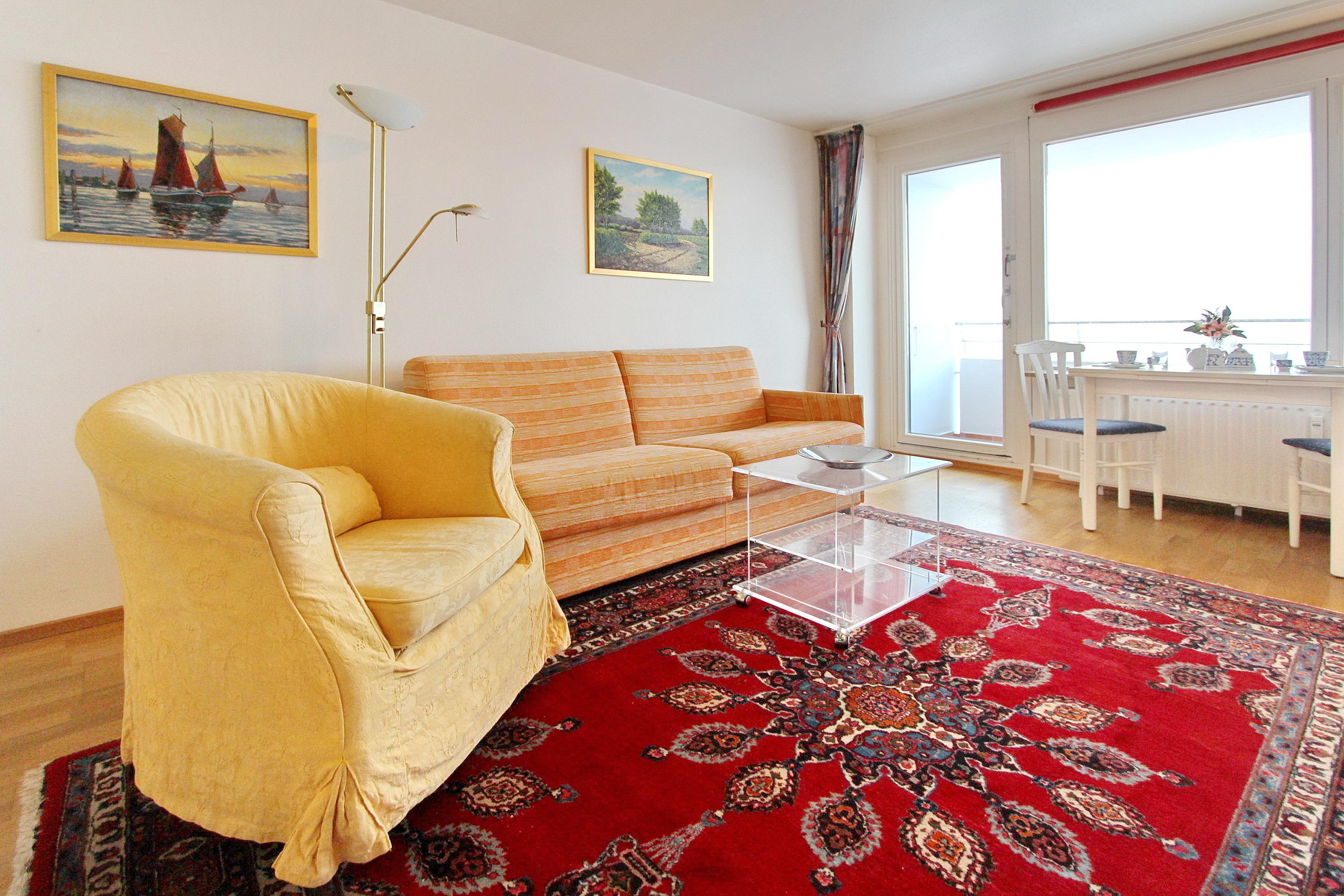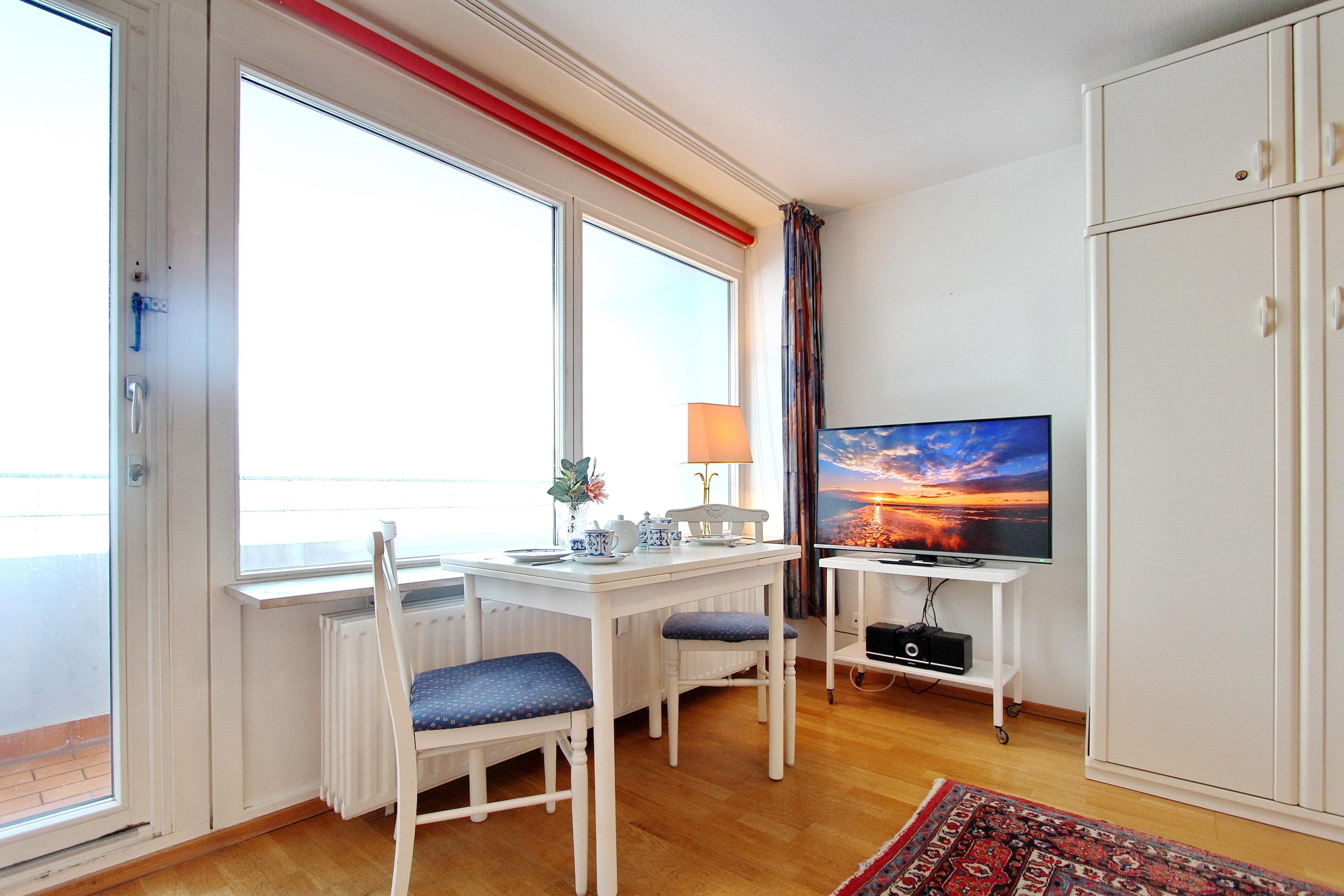 Ansprechende 1-Zimmer-Wohnung im Herzen von der Inselmetropole Westerland im Haus Metropol. Sie können von der vorgelagerten Loggia einen traumhaften Blick auf die Nordsee und den Strand genießen. Der kombinierte Wohn-/Schlafraum verfügt über eine Schrankwand mit integrierten Einzelschrankbetten, einer gemütlichen 2-Siter-Couch mit Sessel und einem Essplatz am Fenster mit 2 Stühlen. Die Küchenzeile im Vorflur beinhaltet einen Herd mit 4 Platten, einem Backofen und einen Kühlschrank mit Gefrierfach. Duschbad/WC mit Halbrunddusche. Flachbild-TV. Radio. Nichtraucherwohnung. Haustiere nicht erlaubt. Wohnungsgröße ca. 34 m². Ein freies WLAN-Netzwerk (WEG Haus Metropol - Passwortfrei - ohne Gewähr) steht Ihnen kostenfrei zur Verfügung.