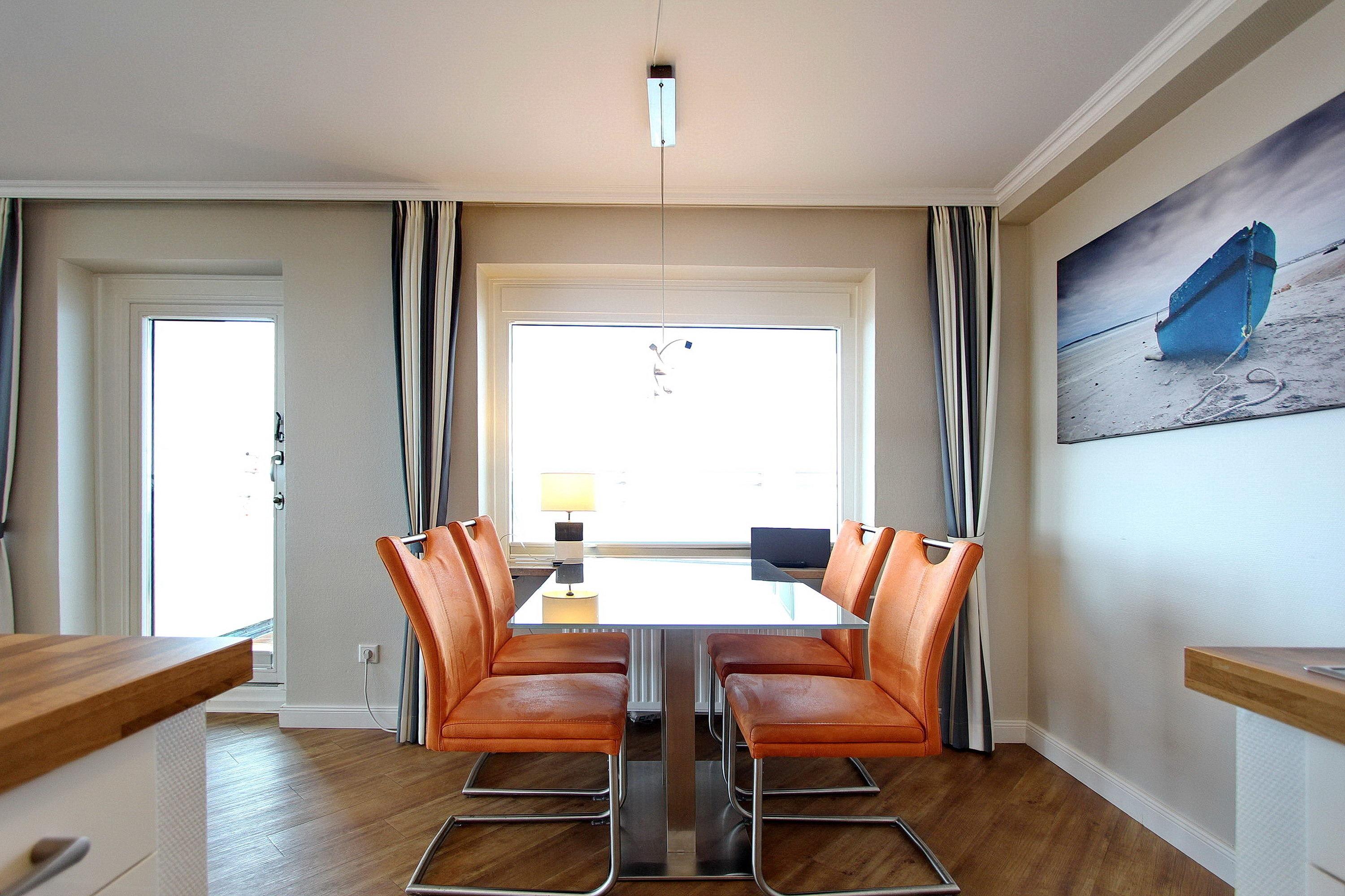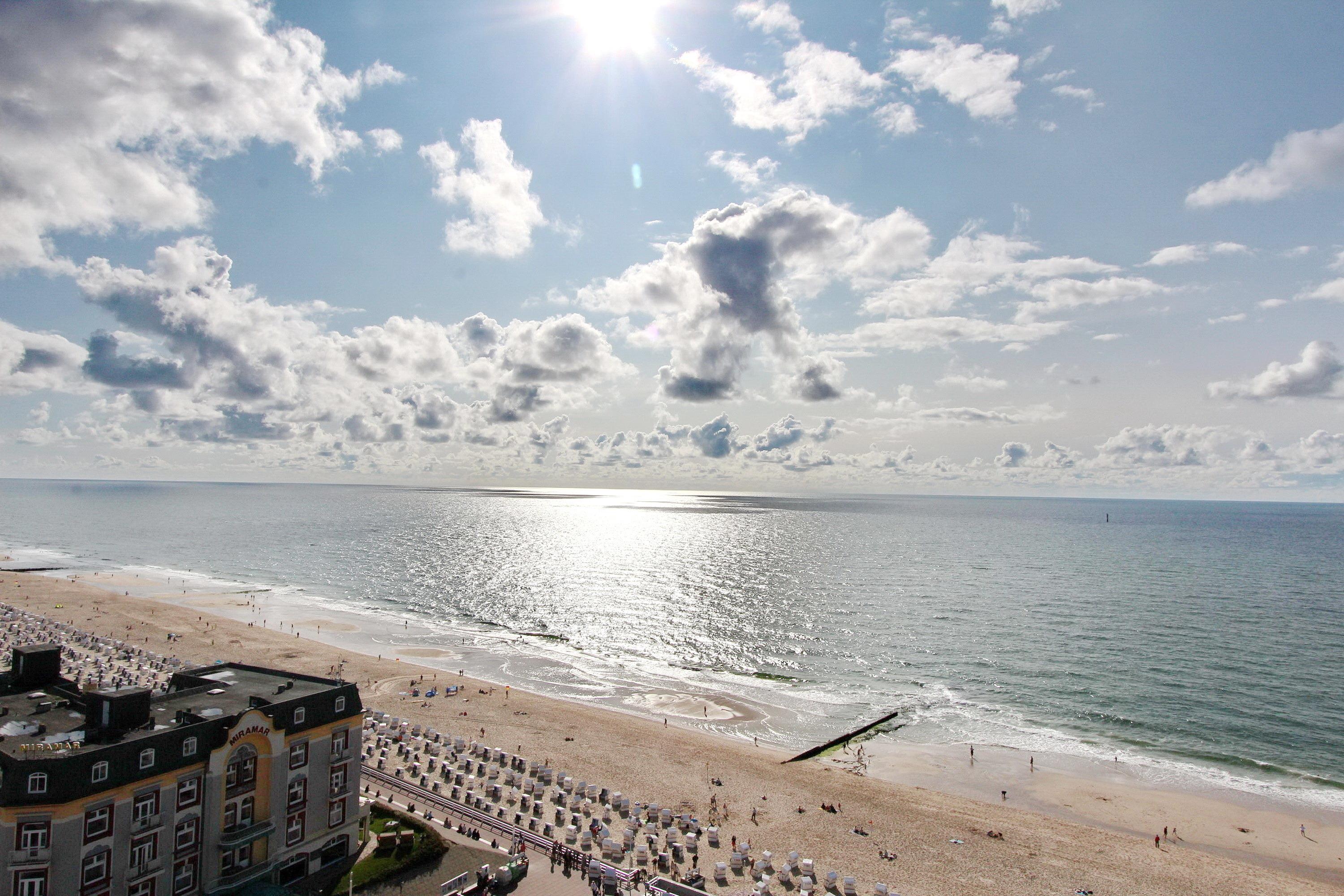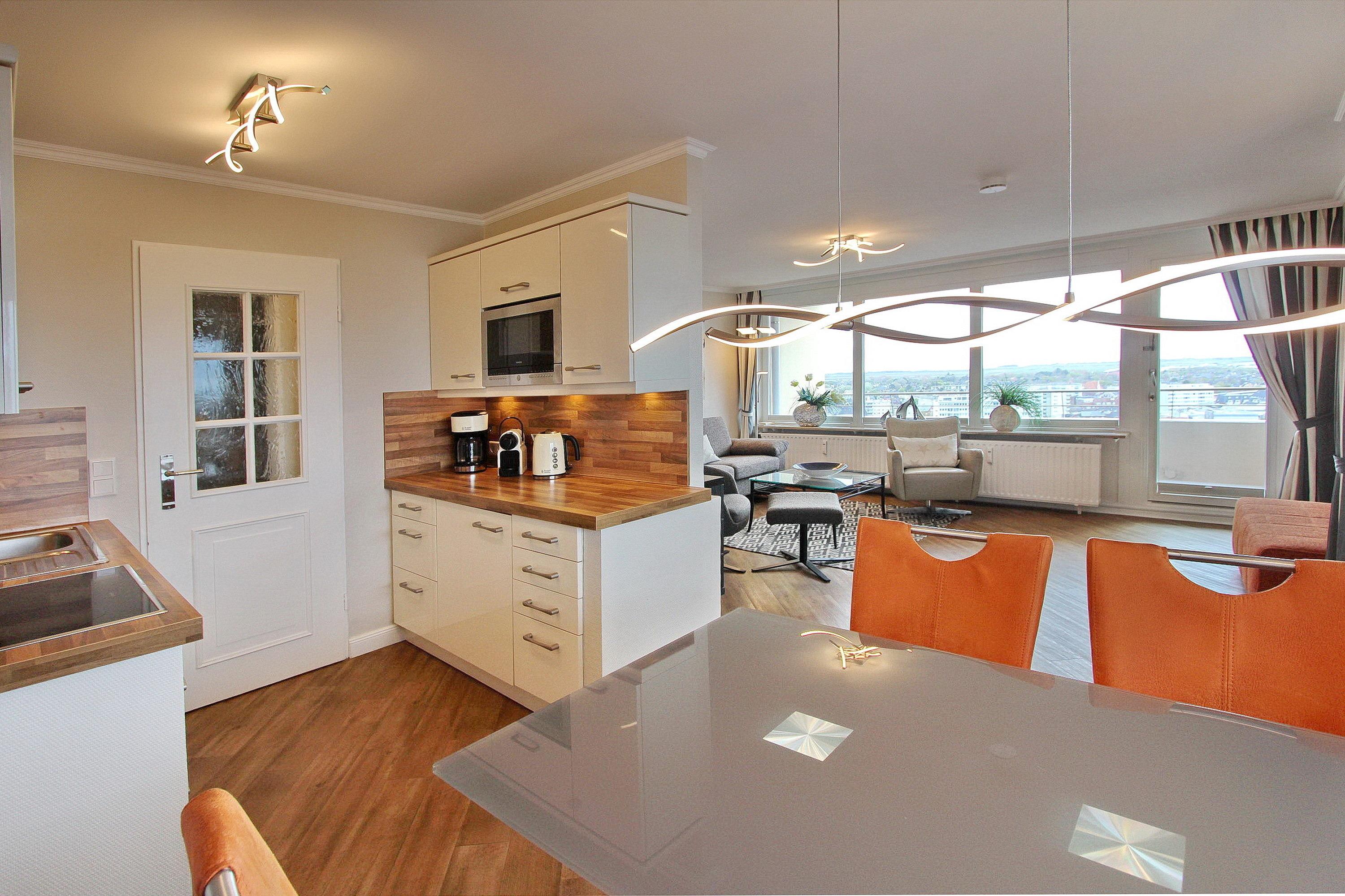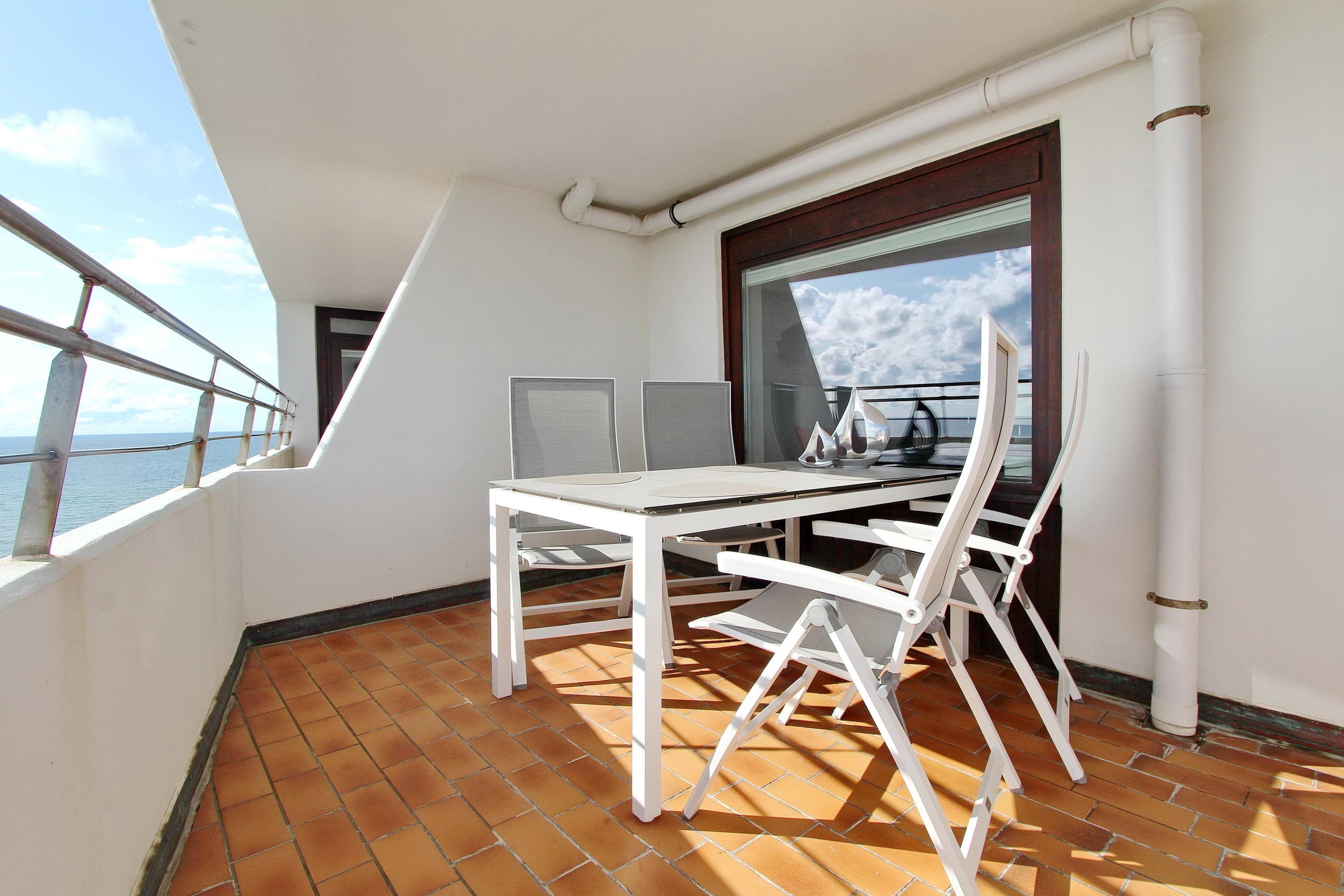 Aus dieser großen 2 Zimmerwohnung in der 13. Etage im Haus Metropol genießen Sie einen herrlichen Weitblick über die Insel und die Stadt Westerland. Bei klarem Wetter können Sie bis zum nordfriesischen Wattenmeer schauen. Das hell und freundlich eingerichtete Wohnzimmer mit vorgelagertem Süd- und Ostbalkon (inkl. Balkonmöbeln und Auflagen) ist mit Laminatboden einer Couch und 2 Sesseln, sowie einer Schlafcouch ausgestattet. Der Essplatz mit 4 Stühlen befindet sich neben der offenen Küche und dem Balkon zur Südseite mit Meeresblick. In der Küche gibt es einen Geschirrspüler, ein Ceranfeld und eine Mikrowelle. Selbst ein Eierkocher, eine Küchenmaschine von Bosch, ein Milchaufschäumer sowie eine zusätzliche Nespressomaschine sind vorhanden. Stilvoll decken Sie den Tisch mit Geschirr von Thomas Trend und Gläsern von Nachtmann. Das Schlafzimmer hat ein Doppelbett, einen zusätzlichem Flachbildfernseher und einen vorgelagerten Ostbalkon. Im Badezimmer gibt es eine Dusche und ein Bidet. Fön, Handtuchtrockner und Kosmetikspiegel sind ebenfalls vorhanden. Zur technischen Ausstattung gehören: zwei Flachbildfernseher (43 Zoll und 30 Zoll) und eine Sony Bluetoothanlage mit CD Player. Ein freies WLAN Netzwerk (WEG Haus Metropol - Passwortfrei - ohne Gewähr) steht ihnen kostenfrei zur Verfügung. Diese Nichtraucherwohnung hat eine Größe von ca.74 m².
