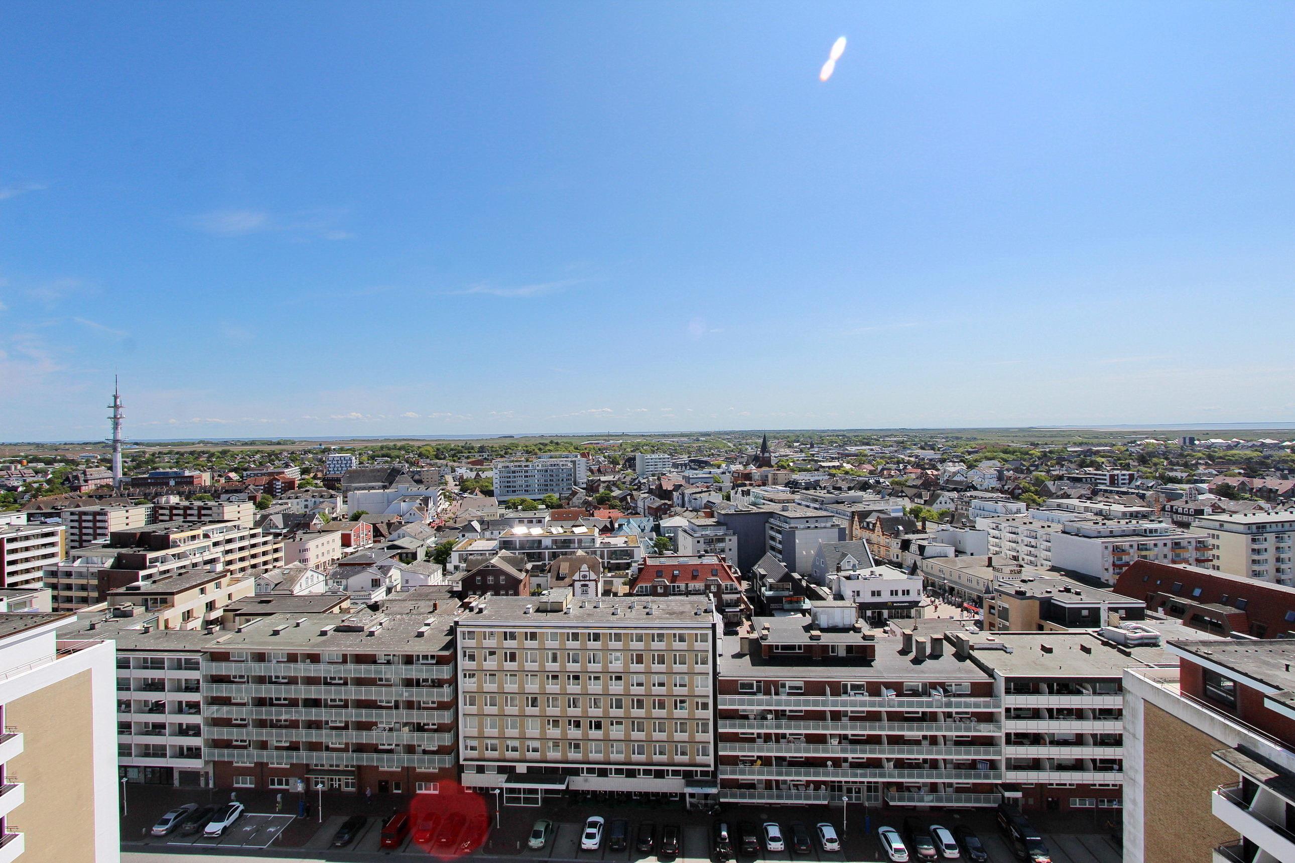 Gepflegte 1-Zimmer-Wohnung im Herzen von Westerland - sie befindet sich in der 13. Etage im Kurzentrum von Westerland mit herrlichem Weitblick über die City bis hin zum Wattenmeer. Auf dem vorgelagertem Ost-Balkon können Sie ungehindert den Sonnenaufgang genießen. Das Schwimmbad Sylter Welle, der Hauptstrand und die beiden Fußgängerzonen befinden sich in unmittelbarer Nähe. Der kombinierte Wohn-/Schlafraum verfügt über 2 Einzel-Schrankbetten, 2 gemütlichen Sesseln und einem Essplatz mit 2 Stühlen. In der, im Vorflur befindlichen, Küche finden Sie eine Geschirrspülmaschine, ein Ceran-Kochfeld mit 2 Platten, eine Mikrowelle und ein Kühlschrank mit Gefrierfach. Helles Duschbad/WC mit Handtuchheizkörper. Nichtraucherwohnung. Haustiere nicht gestattet. Wohnungsgröße ca. 30 m². Ein Hotspot im Haus (WEG Haus Metropol - Passwortfrei - ohne Gewähr) ermöglicht Ihnen einen kabellosen und kostenfreien Zugang zum Internet.