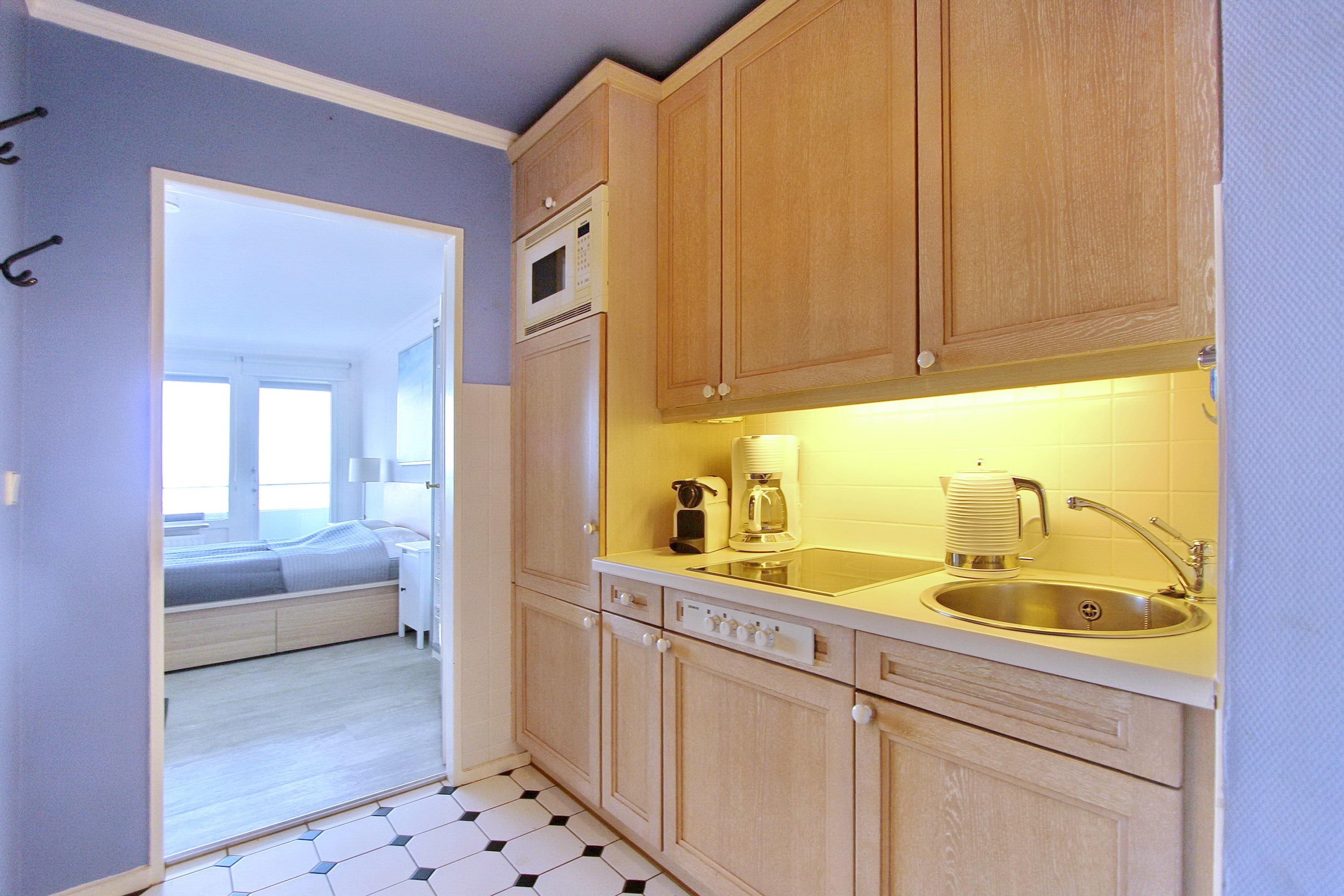Hell und freundlich eingerichtetes 1 Zimmer Appartement in der 1. Etage im Haus am Meer mit Blick auf die Nordsee. Bequeme Loungemöbel auf dem Balkon laden zum Verweilen ein. Das Wohn-Schlafzimmer, mit vorgelagertem Westbalkon mit Meeresblick, verfügt über ein feststehendes Doppelbett mit 2 Matratzen, 2 Nachttischschränkchen und 2 Leselampen. Eine Couch, ein Kleiderschrank und ein Sideboard für die Unterbringung ihrer persönlichen Dinge ist ebenfalls vorhanden. Der Essplatz am Fenster mit 2 Stühlen bietet ihnen die Möglichkeit beim Essen auf die Nordsee zu schauen. Das im Frühjahr 2021 renovierte Badezimmer verfügt über eine große Dusche mit niedrigem Einstieg, Handtuchtrockner und Fön. Die Küchenzeile mit Mikrowelle und Ceranfeld, sowie zusätzlicher Nespresso Maschine, befindet sich im Flur. Zur technischen Ausstattung gehört: ein Smart-Flachbildfernseher, ein DVD Player, eine Smartphone Ladestation, ein Radiowecker und eine Bluetooth Anlage mit CD Spieler von Sony. Ein kostenloser WLAN Zugang (WEG Haus am Meer - Passwortfrei - ohne Gewähr) steht ihnen zur Verfügung. Vierbeinige Sylturlauber sind ausdrücklich willkommen in dieser ca. 34 m² großen Wohnung.