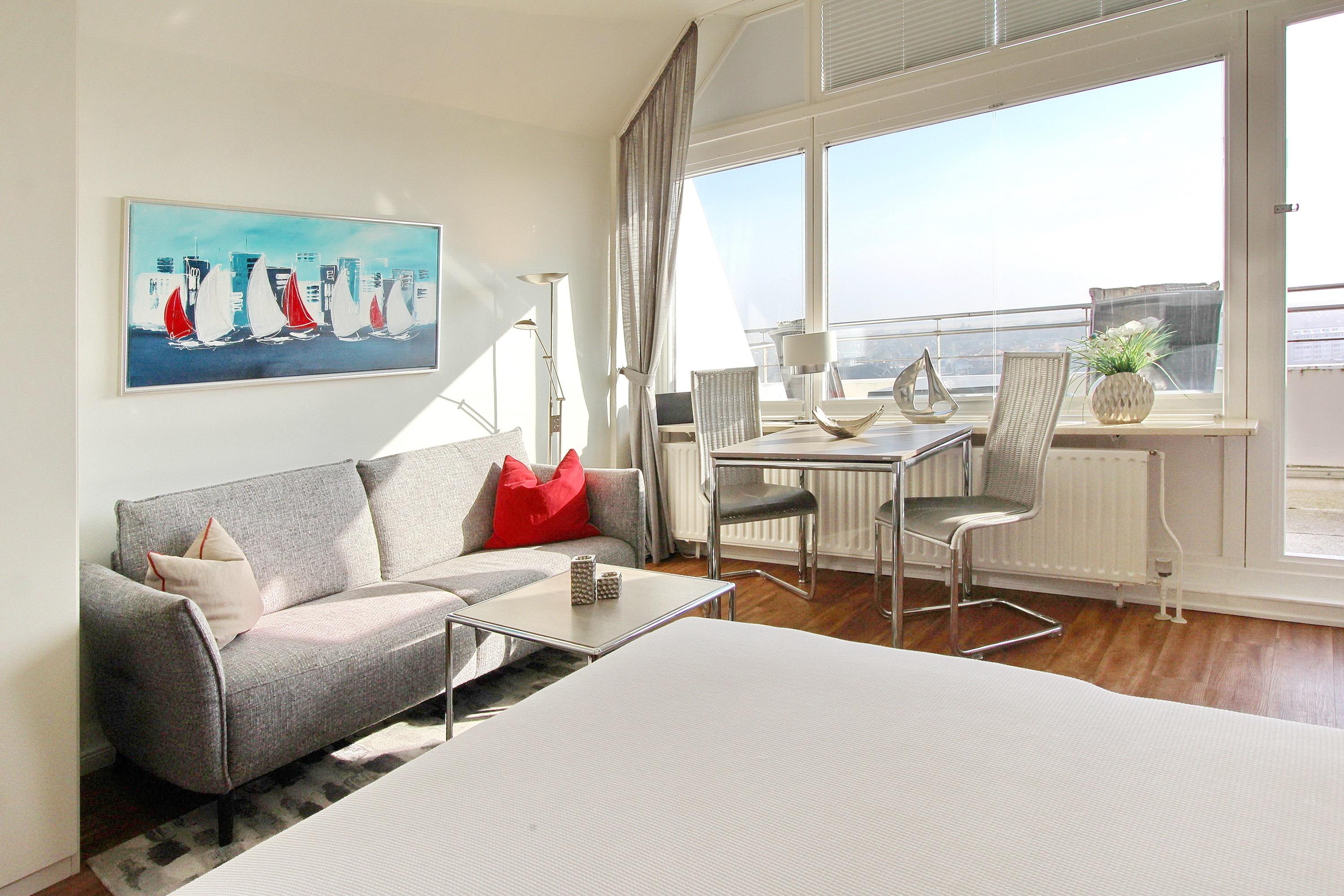 Penthousewohnung in der 14. Etage des Haus Metropol mit herrlichem Weitblick über die Insel und die Stadt. Der Wohn-/Schlafraum mit vorgelagertem Ostbalkon und Balkonmöbeln verfügt über ein komfortables Boxspringbett, eine bequeme 2 Sitzer Couch, einen Kleiderschrank mit viel Stauraum und eine Kommode. Der Essplatz mit 2 Stühlen steht direkt am Fenster und von dort aus können Sie den wunderbaren Sonnenaufgang genießen. Das helle Badezimmer hat eine Dusche. Im Flur gibt es eine Küchenzeile mit 2 Platten Ceranfeld, eine Mikrowellen-Backkombination, einen Geschirrspüler und eine zusätzliche Nespressomaschine. Stilvoll decken Sie den Tisch mit Geschirr von Thomas Trend. Zur technischen Ausstattung dieser Nichtraucherwohnung gehört: ein Radio mit CD Player und ein Flachbildfernseher. Der freie WLAN Hotspot (WEG Haus Metropol - Passwortfrei - ohne Gewähr) steht ihnen ebenfalls kostenfrei zur Verfügung. Das Penthouse ist nur über eine Treppe erreichbar, da der Aufzug in der 13. Etage endet. Wohnungsgröße: ca. 30 m².