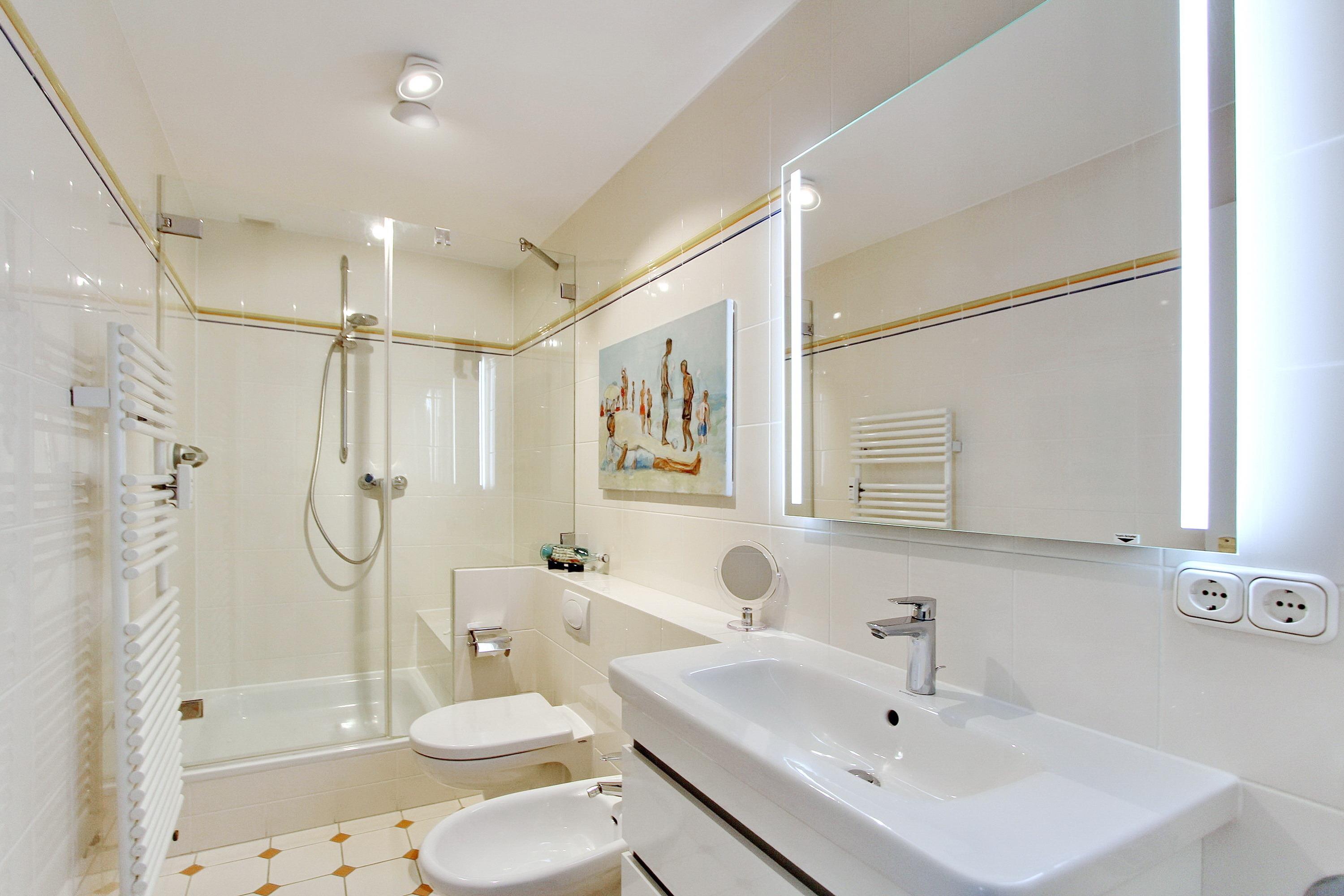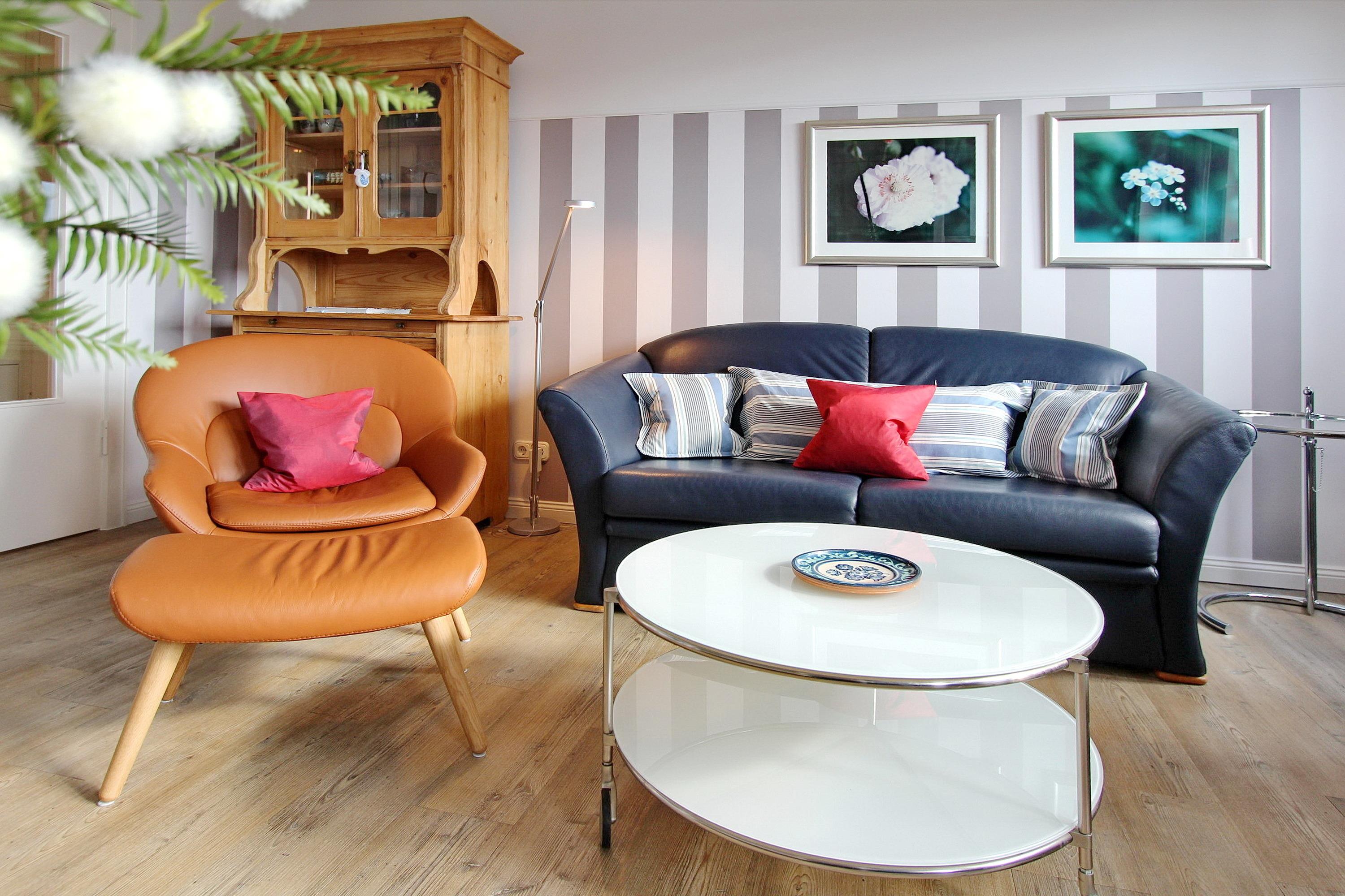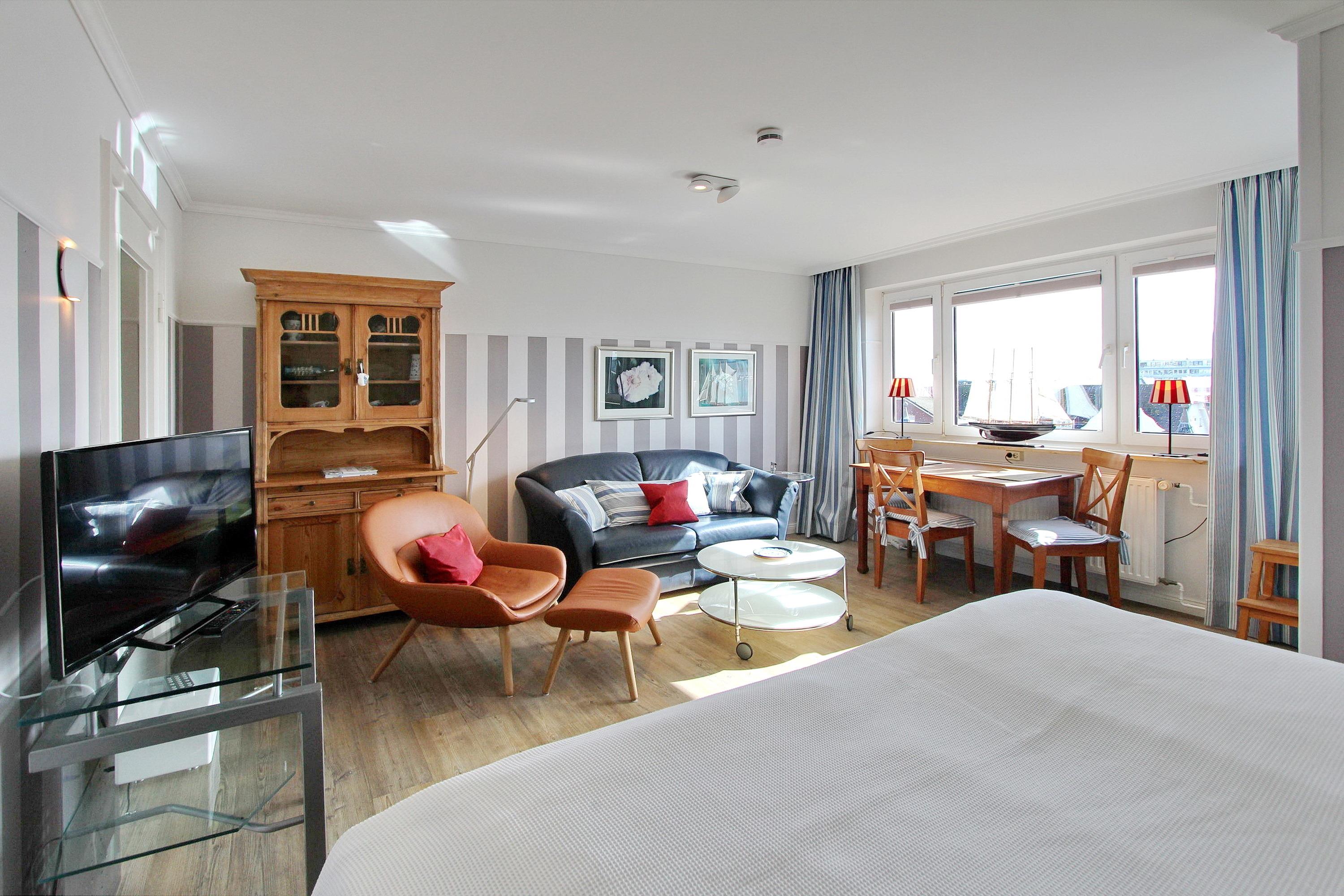 Liebevoll, hell und freundlich, eingerichtete 1 Zimmer Wohnung in der 4. Etage in unmittelbarer Nähe zum Strand und der Westerländer Promenade. Der kombinierte Wohn-Schlafraum verfügt über ein neues Boxspringbett mit höchstem Schlaf-sowie Ein-und Ausstiegskomfort, einen Essplatz am Fenster mit 3 Stühlen und eine Ledercouch und Sessel für gemütliche Fernseh- oder Leseabende. Im Einbaukleiderschrank haben Sie ausreichend Platz für Ihre persönlichen Dinge. Die offene Einbauküche mit Fenster ist mit einer Mikrowelle, einem Ceranfeld, einer zusätzliche Nespressomaschine und einem Geschirrspüler ausgestattet. Selbstverpfleger können sich hier ein köstliches Frühstück oder kleine Mahlzeiten zubereiten. Der Holzlaminatboden gibt dem Raum Wärme und Gemütlichkeit. Das großzügige Badezimmer verfügt über eine Dusche und ein Bidet. Zu ihrer Unterhaltung steht ihnen ein Smart-Flachbildfernseher, ein DVD Player, eine Stereoanlage mit Bluetooth und Kopfhörer, sowie eine umfangreiche Auswahl an DVDs, Büchern und Spielen zur Verfügung. Ein Hotspot im Haus ermöglicht ihnen kabellosen und kostenlosen Zugang ins Internet (WEG-AD3 - Passwortfrei - ohne Gewähr). Diese Wohnung ist eine Nichtraucherwohnung. Haustiere sind ausdrücklich willkommen. Wohnungsgröße: ca. 35 m².