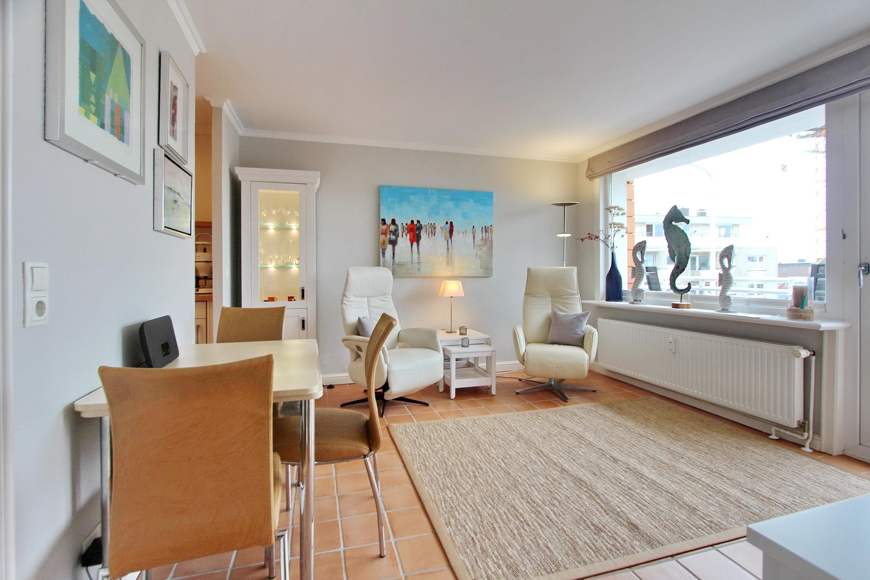 Mit ca. 40 m² bietet die Nichtraucherwohnung alles, was Sie für einen komfortablen Aufenthalt benötigen. Das helle Wohnzimmer lädt zum Entspannen ein, ausgestattet mit besonders gemütlichen elektrischen Sesseln, in denen Sie nach einem erlebnisreichen Tag am Meer wunderbar relaxen können. Der Essplatz mit zwei Stühlen ist ideal für gemeinsame Mahlzeiten oder einen kleinen Kaffee zwischendurch.