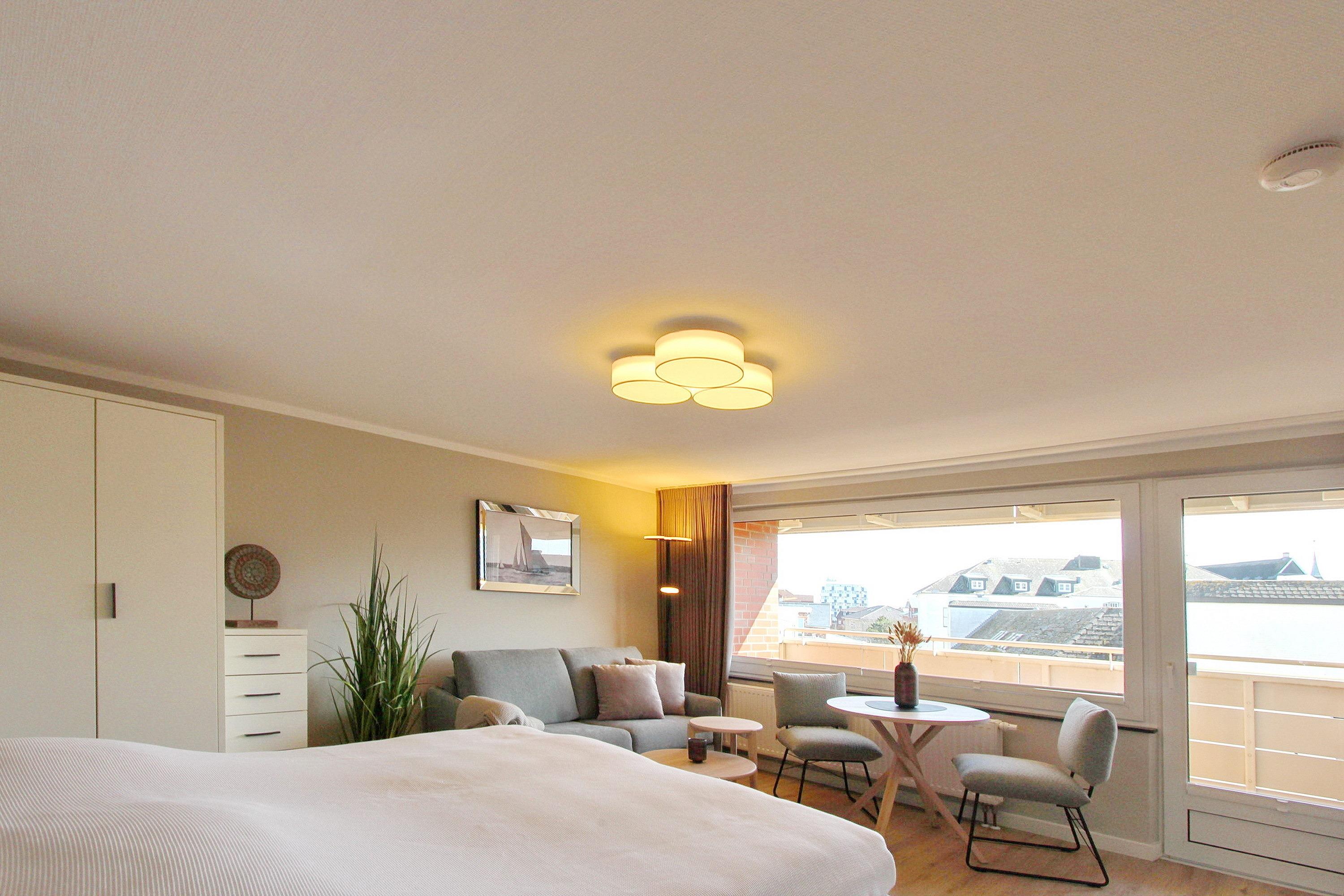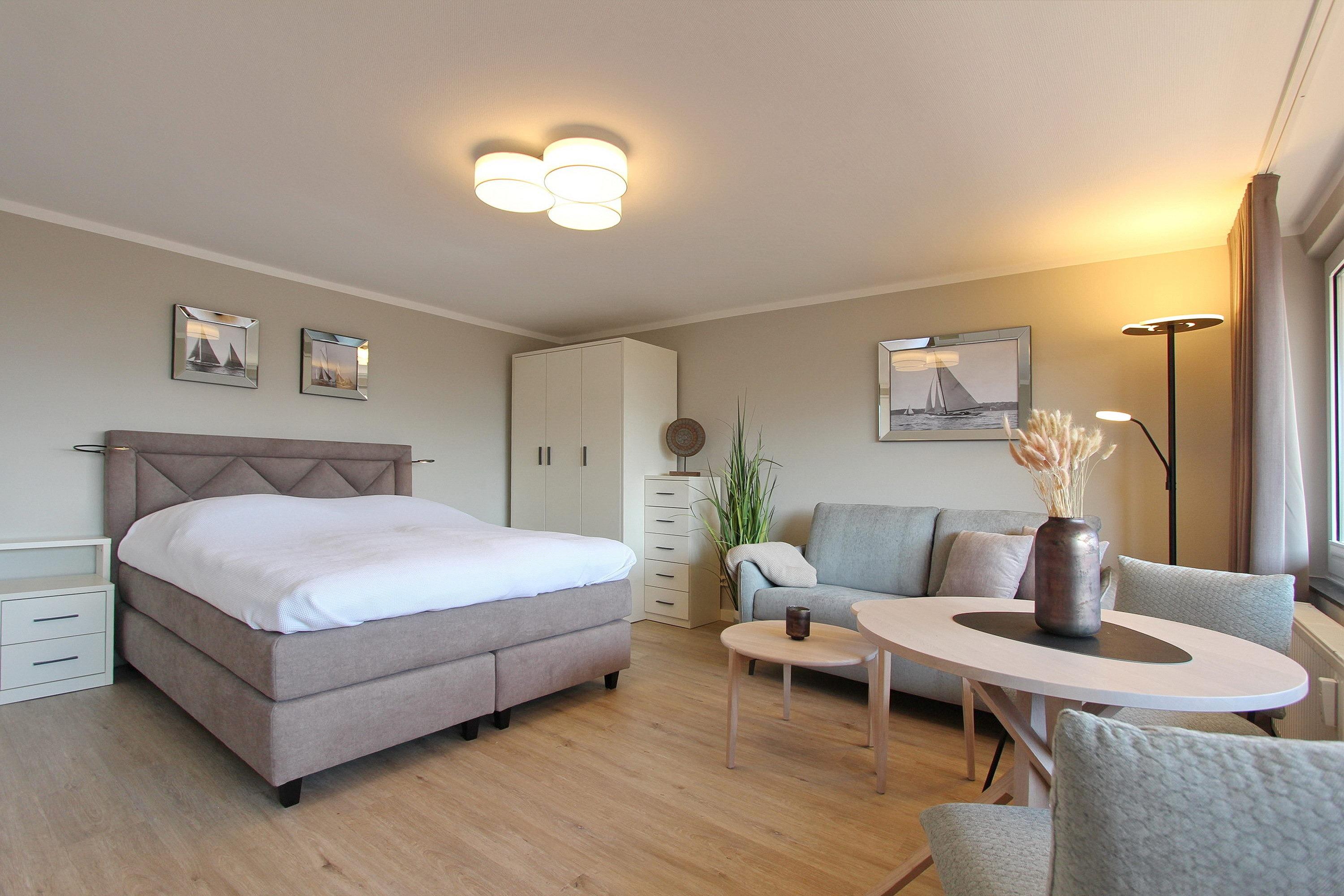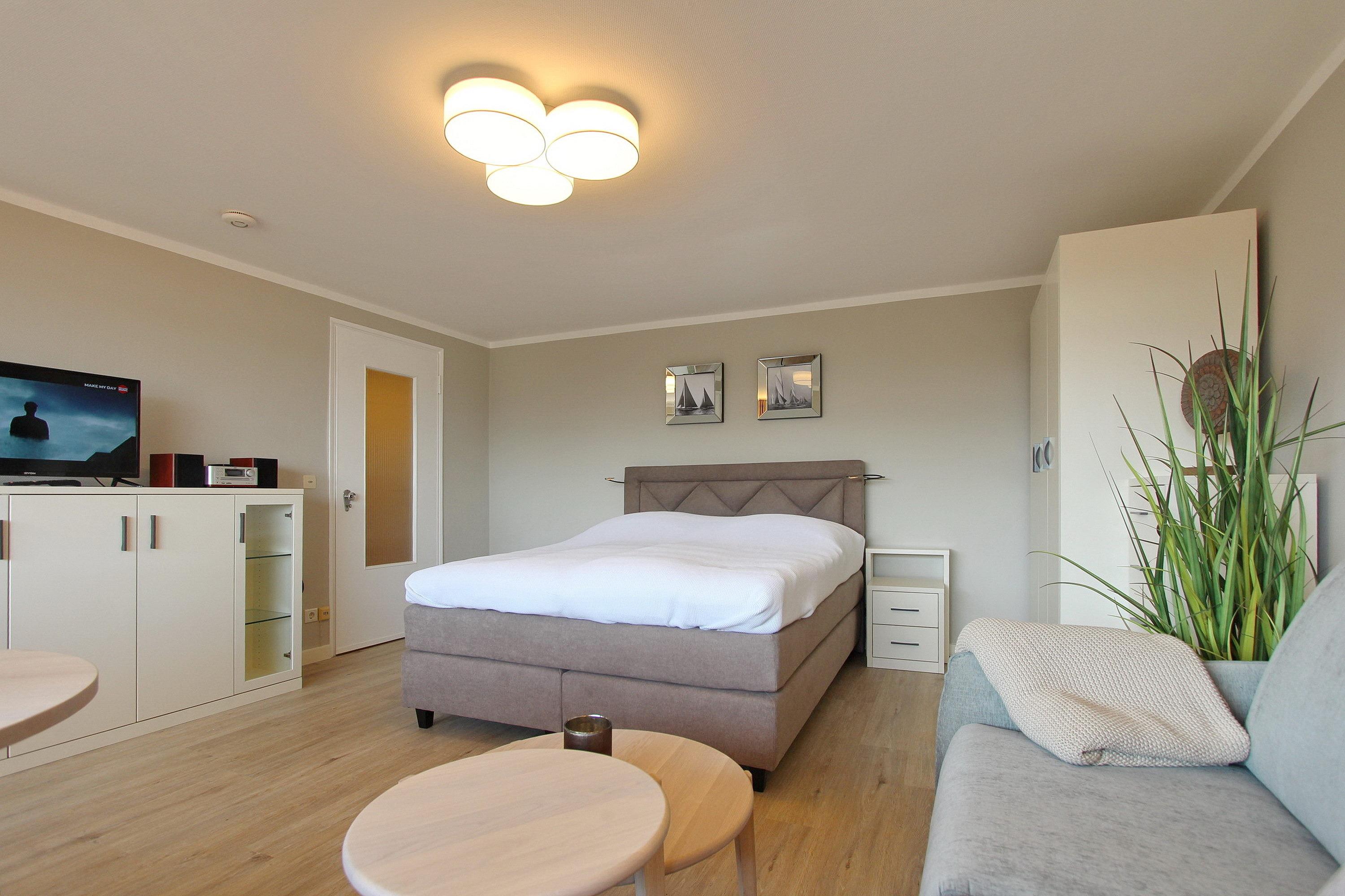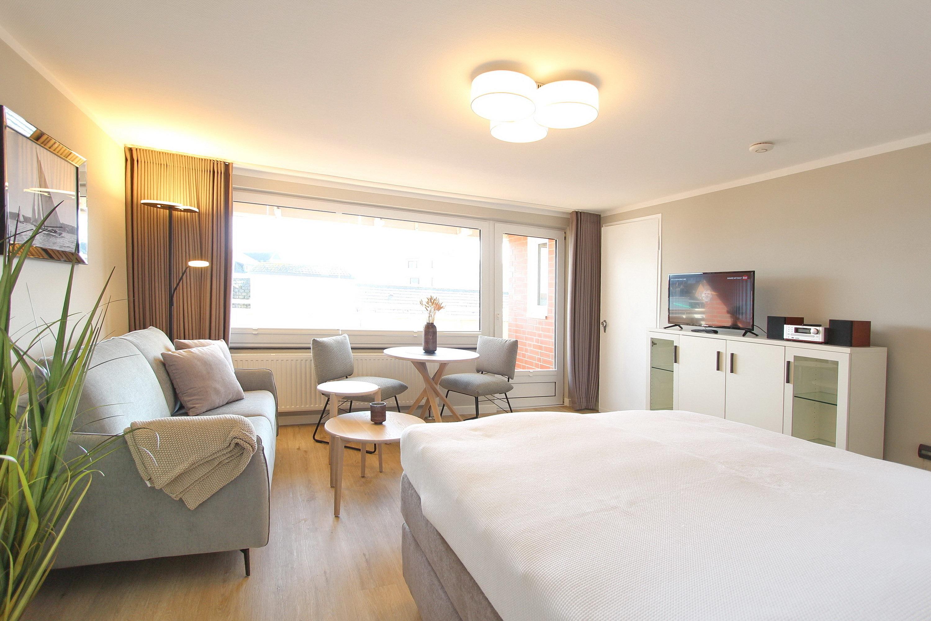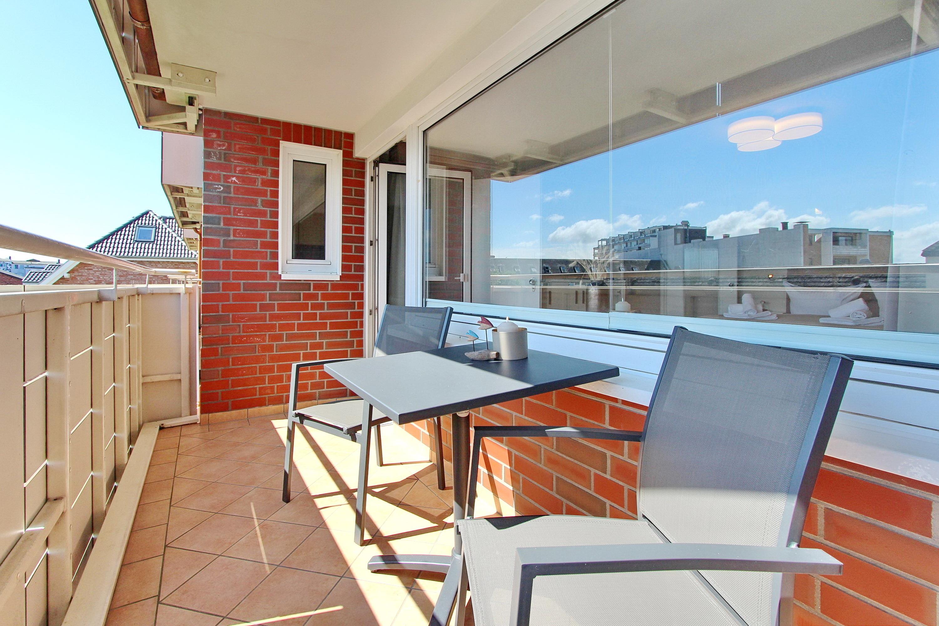 Das zur Vermietung angebotene Einzimmerappartement befindet sich in einer attraktiven Lage im Zentrum von Westerland. Sowohl der Strand als auch die Fußgängerzone sind in wenigen Gehminuten zu erreichen. Das Appartement befindet sich in der dritten Etage und bietet einen großzügigen Balkon mit Balkonmöbeln. Der Wohn- und Schlafbereich ist in einem kombinierten Raum untergebracht und verfügt über ein komfortables Boxspringbett mit einer Breite von 1,60 m für zwei Personen. Zudem befinden sich eine Couch mit passendem Tisch sowie ein Essplatz in dem Raum. In der neuen separaten Küche finden Sie ein Cerankochfeld mit 4 Platten, einen Backofen und eine Geschirrspülmaschine. Das Badezimmer verfügt über eine Dusche. Der Eigentümer stellt den Gästen einen eigenen Internetanschluss zur Verfügung, der kostenfrei genutzt werden kann. Das Appartement ist eine Nichtraucherwohnung und hat eine Größe von 33m². Haustiere sind nicht erlaubt.