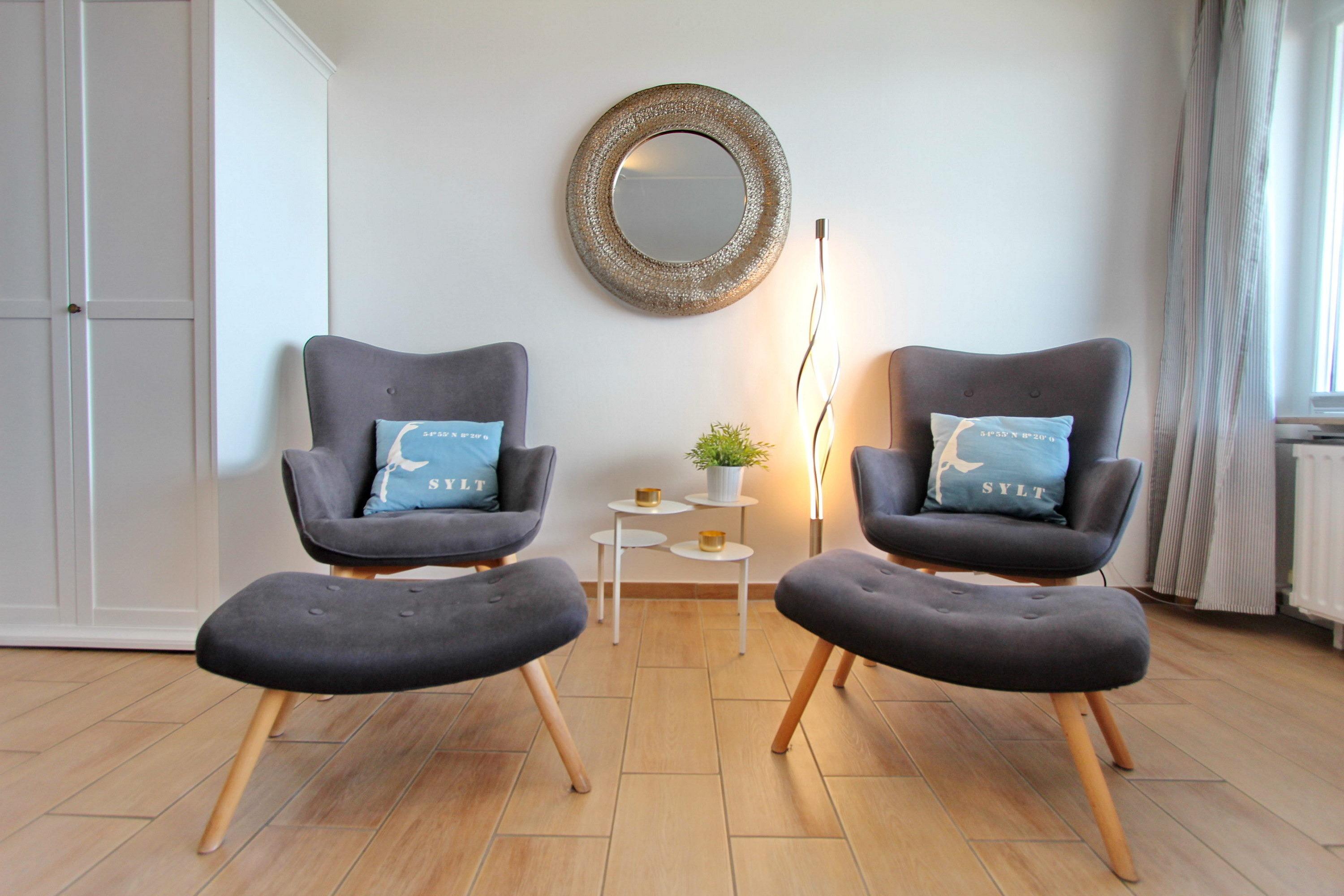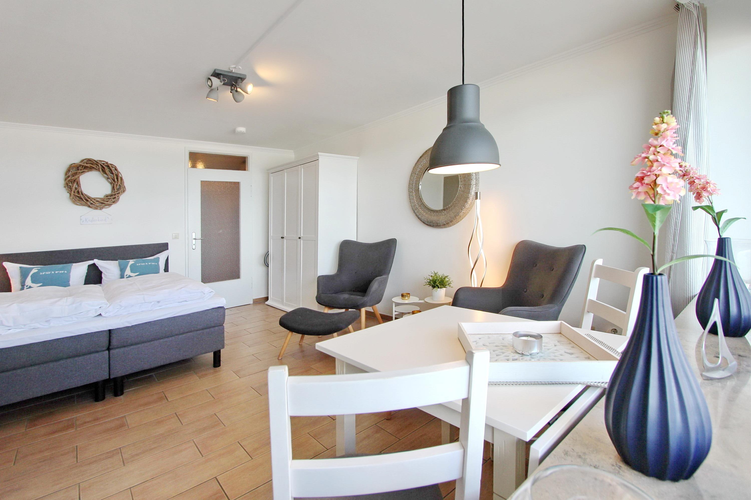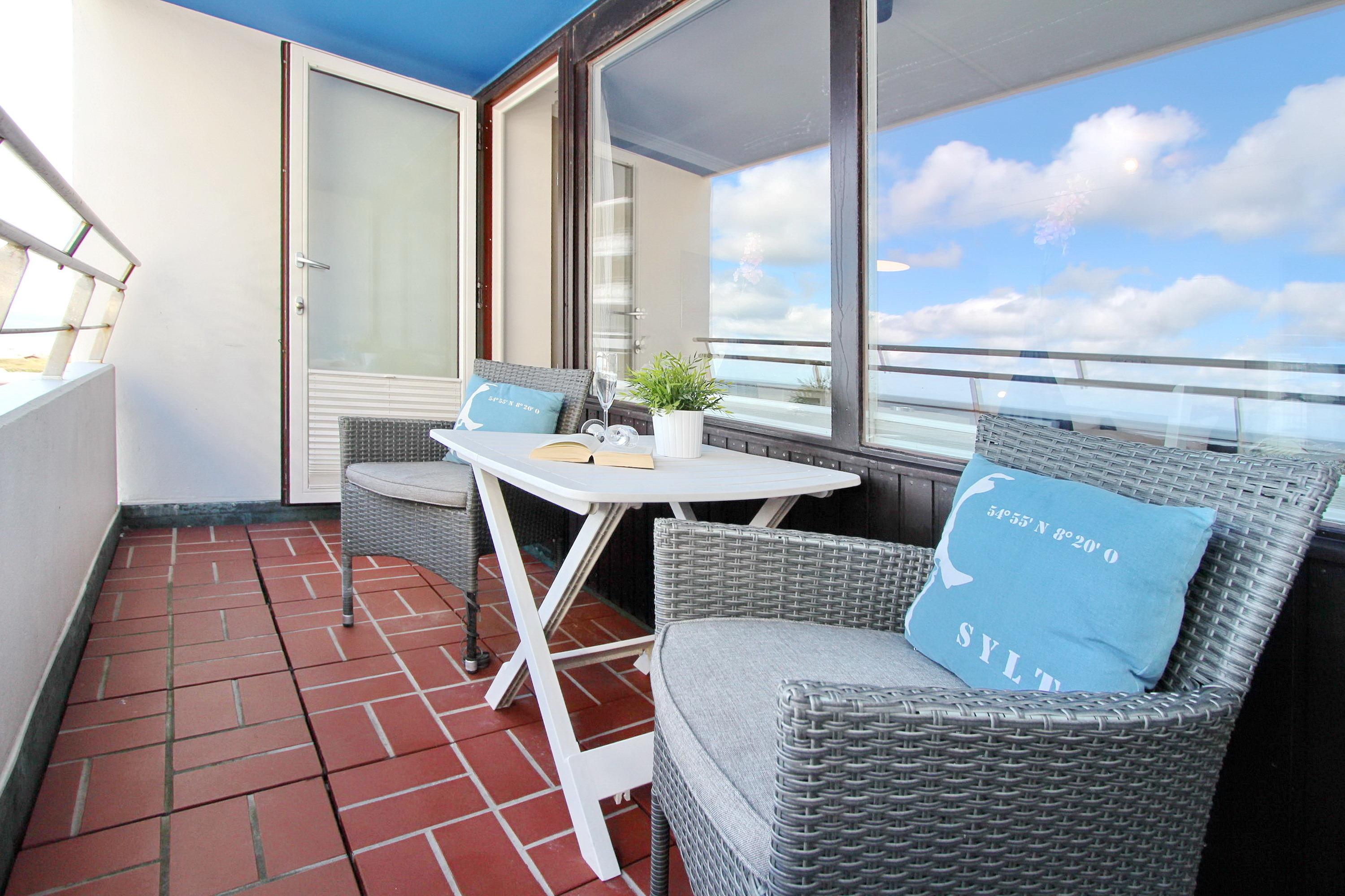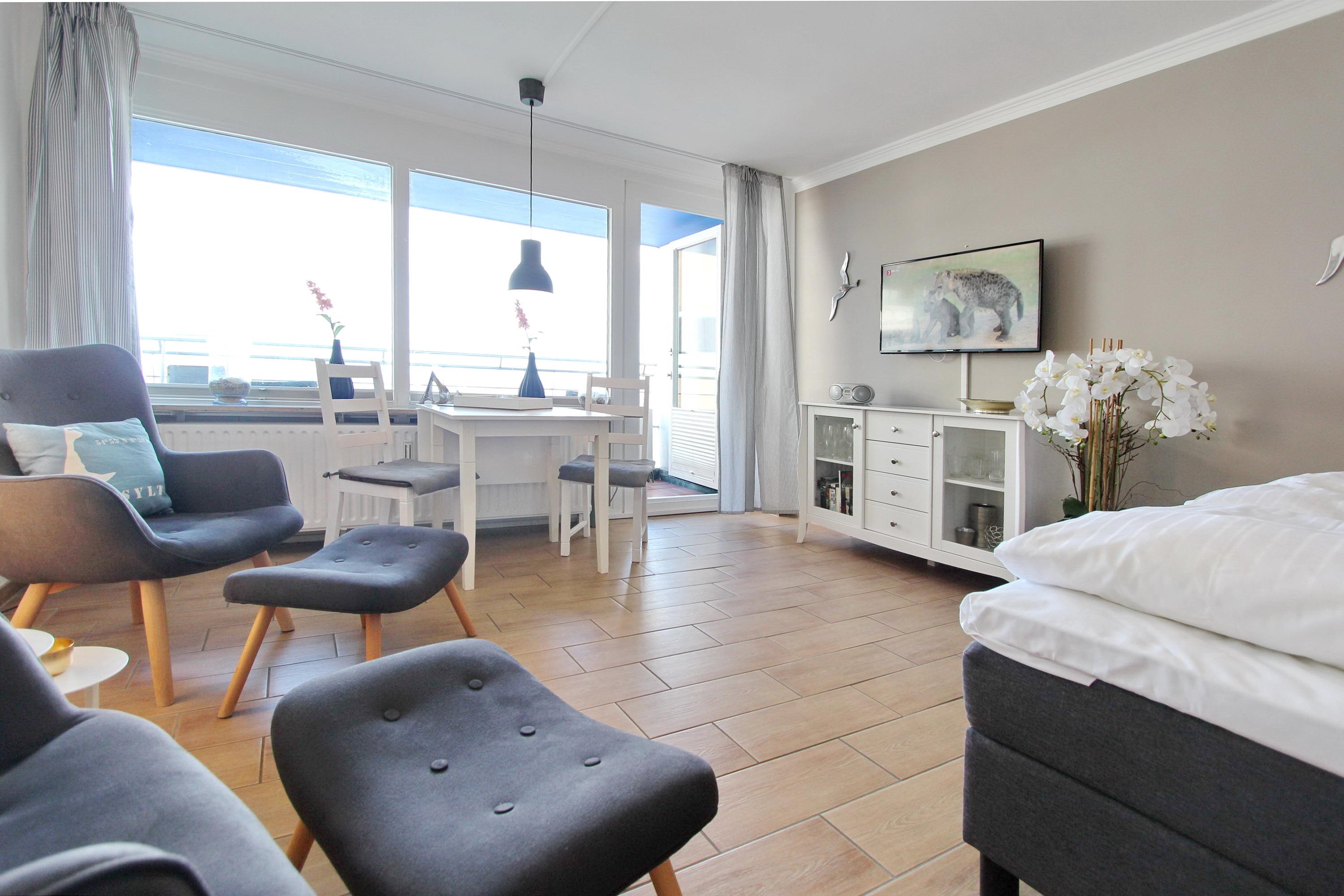 Wohlfühloase im Beach House Look im Haus Sylter Welle in der 8. Etage. Diese Einzimmerwohnung verfügt über ein feststehendes Boxspringbett mit 1 durchgehenden Topper, 2 Fernsehsessel mit Fußhockern, einen Essplatz mit 2 Stühlen am Fenster, eine Kommode und einen Kleiderschrank. Stauraum für Ihre persönlichen Dinge ist reichlich vorhanden. Auf dem Westbalkon mit direktem Meeresblick gibt es einen Tisch und 2 Hochlehnerstühle. Hier können Sie jeden Abend den Sonnenuntergang genießen. Das Badezimmer verfügt über eine breite Dusche mit niedrigem Einstieg, einen Handtuchtrockner, Fön, einen Duschhocker und einen mobilen Haltegriff. Um sich selbst zu verpflegen gibt es im Flur eine kleine Küchenzeile mit Backofen, Geschirrspülmaschine und 2-Platten-Ceranfeld. Im Flur und Bad wurden Fliesen verlegt, der Wohnraum hat einen Designboden in Holzoptik. Auf Teppiche wurde ganz verzichtet. Zur technischen Ausstattung dieser Nichtraucherwohnung gehört: ein Flachbildfernseher von Panasonic und eine Radio mit CD Player. Den kostenfreien WLAN Zugang (WEG Haus Sylter Welle - Passwortfrei - ohne Gewähr) können Sie gerne nutzen. Wohnungsgröße: ca. 34 m².