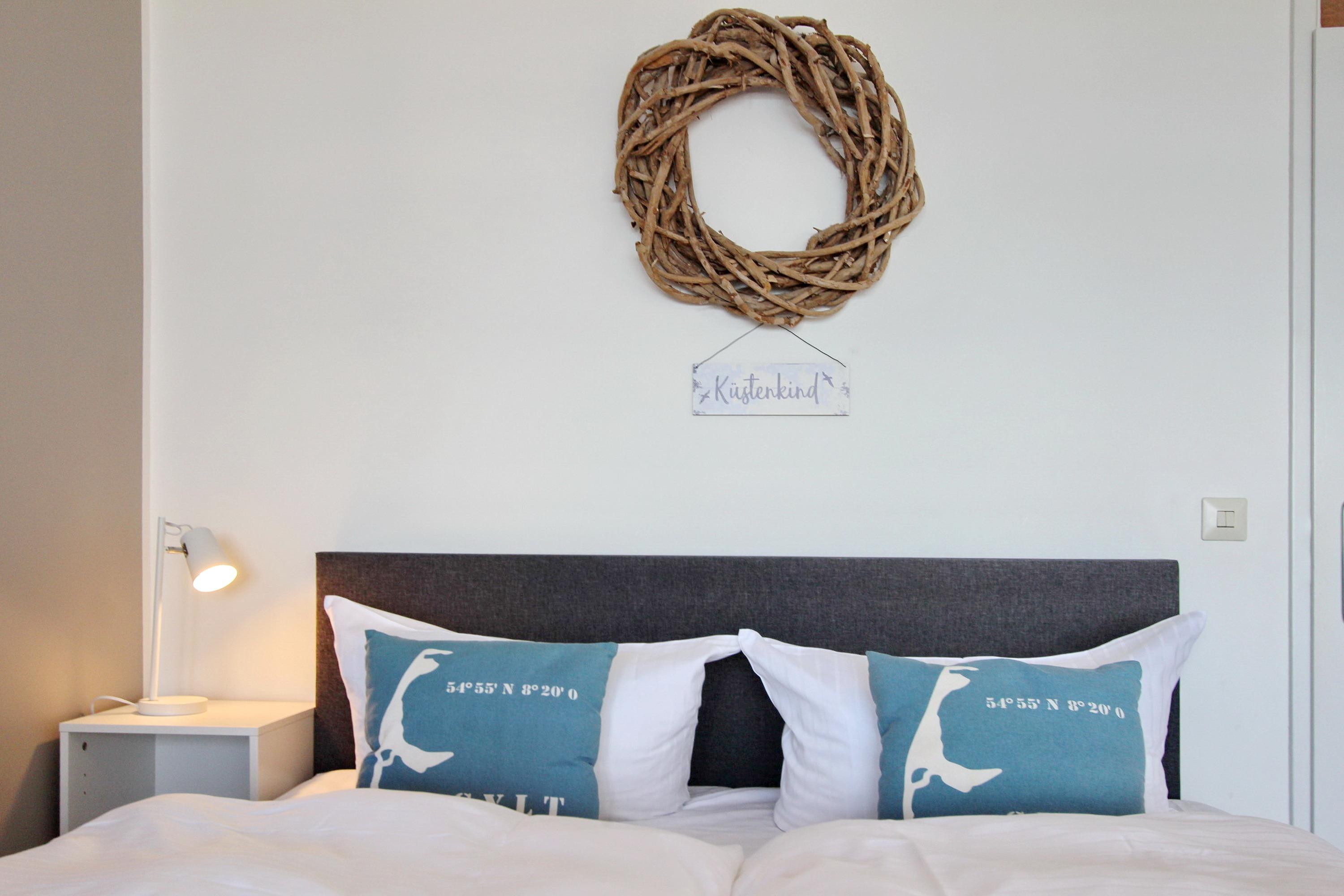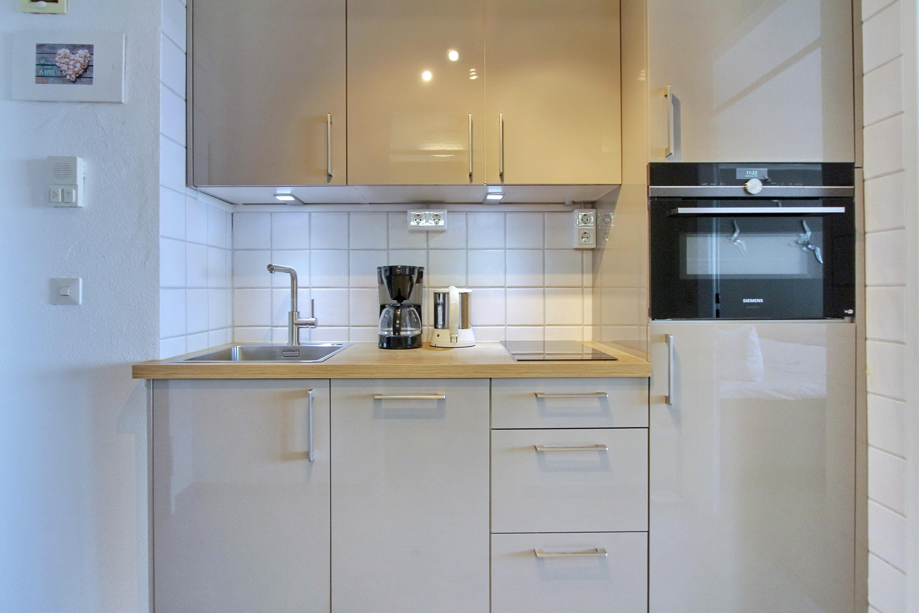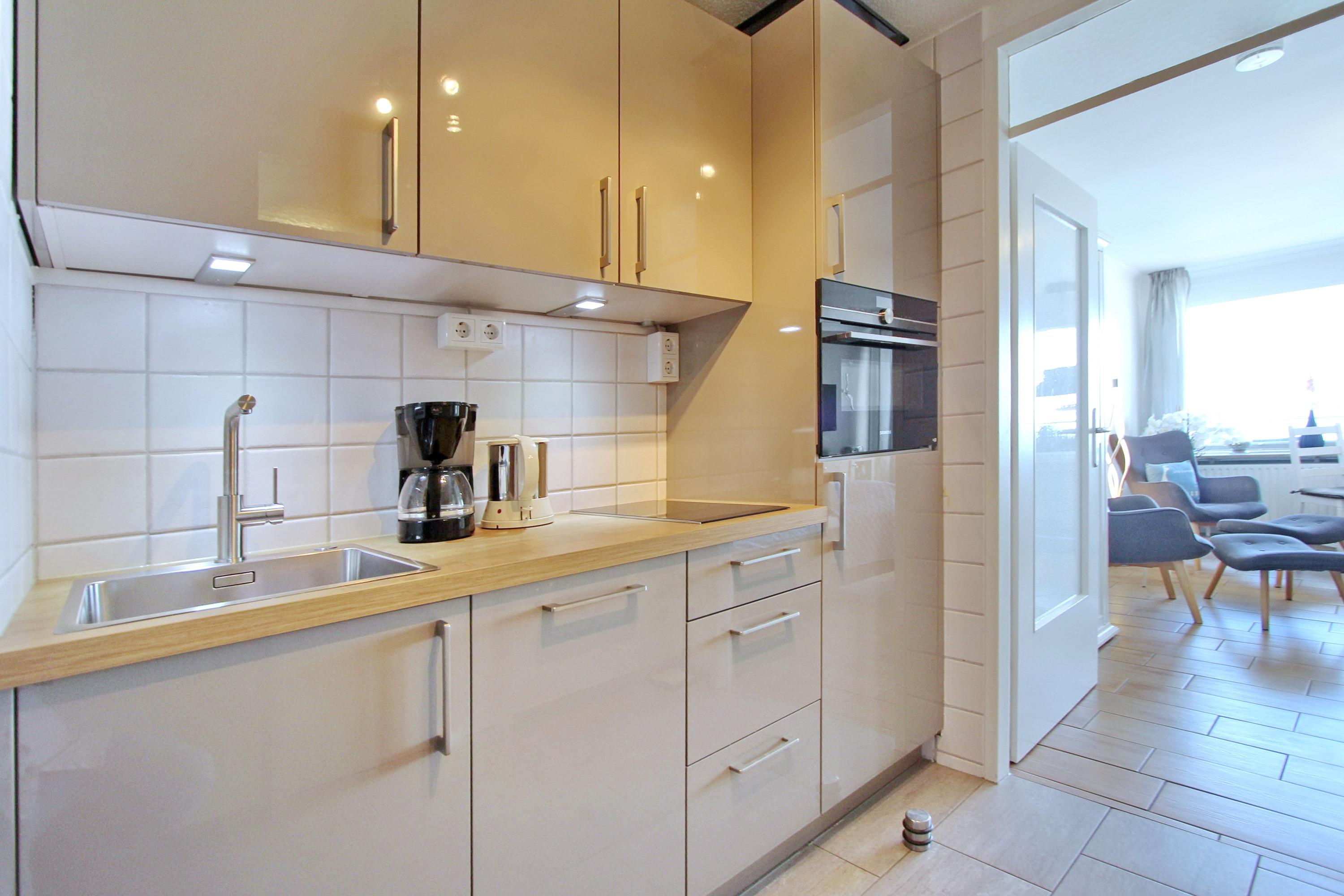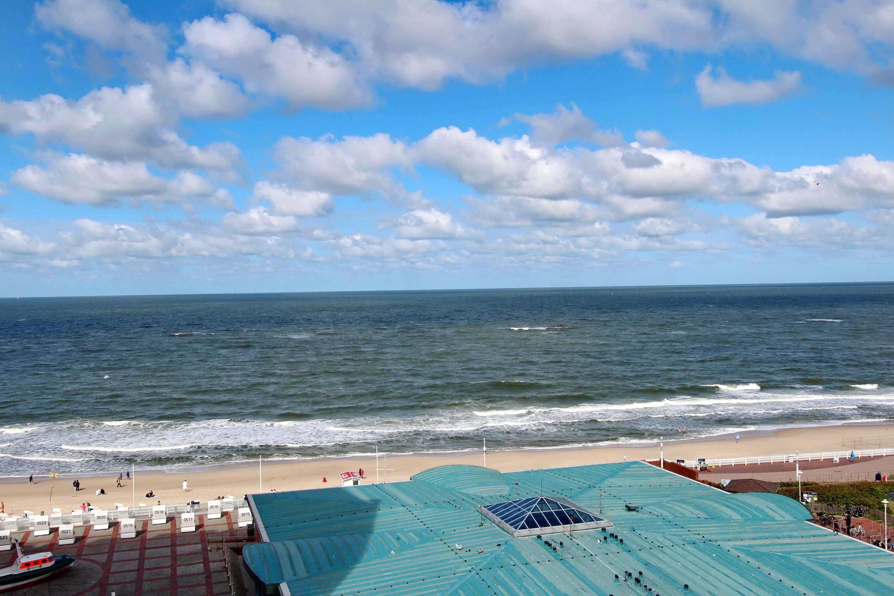 Wohlfühloase im Beach House Look im Haus Sylter Welle in der 8. Etage. Diese Einzimmerwohnung verfügt über ein feststehendes Boxspringbett mit 1 durchgehenden Topper, 2 Fernsehsessel mit Fußhockern, einen Essplatz mit 2 Stühlen am Fenster, eine Kommode und einen Kleiderschrank. Stauraum für Ihre persönlichen Dinge ist reichlich vorhanden. Auf dem Westbalkon mit direktem Meeresblick gibt es einen Tisch und 2 Hochlehnerstühle. Hier können Sie jeden Abend den Sonnenuntergang genießen. Das Badezimmer verfügt über eine breite Dusche mit niedrigem Einstieg, einen Handtuchtrockner, Fön, einen Duschhocker und einen mobilen Haltegriff. Um sich selbst zu verpflegen gibt es im Flur eine kleine Küchenzeile mit Backofen, Geschirrspülmaschine und 2-Platten-Ceranfeld. Im Flur und Bad wurden Fliesen verlegt, der Wohnraum hat einen Designboden in Holzoptik. Auf Teppiche wurde ganz verzichtet. Zur technischen Ausstattung dieser Nichtraucherwohnung gehört: ein Flachbildfernseher von Panasonic und eine Radio mit CD Player. Den kostenfreien WLAN Zugang (WEG Haus Sylter Welle - Passwortfrei - ohne Gewähr) können Sie gerne nutzen. Wohnungsgröße: ca. 34 m².