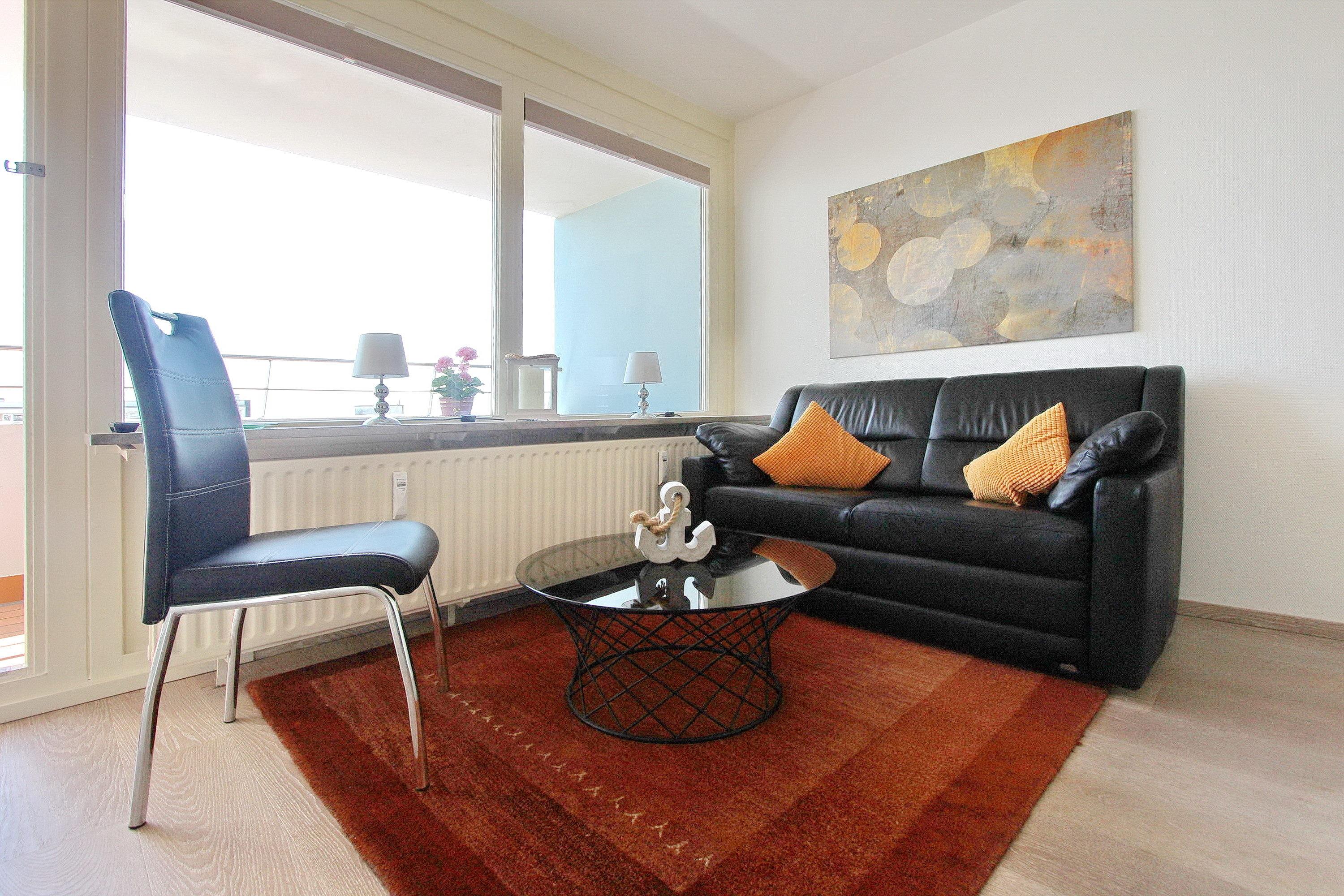 Diese hell und freundlich eingerichtete 1 Zimmer Wohnung befindet sich in der 4. Etage des Haus Metropol. Der kombinierte Wohn-/Schlafraum mit Laminatboden hat einen vorgelagerten großen Ostbalkon mit Lounge-Balkonmöbeln. Einzelschrankbetten und ausreichen Stauraum für ihre Habseligkeiten stehen ihnen zur Verfügung. In die Schrankwand integriert ist ein ausziehbarer Esstisch (der nur bei Bedarf ausgeklappt werden kann) mit 2 Stühlen. Eine bequeme Ledercouch steht direkt am Fenster. Das helle Badezimmer verfügt über eine Dusche. Im Flur befindet sich eine kleine Einbauküche mit Ceranfeld, Backofen und Geschirrspüler. Zur technischen Ausstattung dieser Nichtraucherwohnung gehört: ein Flachbildfernseher. Ein freies WLAN Netzwerk (WEG Haus Metropol - Passwortfrei - ohne Gewähr) steht ihnen kostenfrei zur Verfügung. Wohnungsgröße: 30 m².