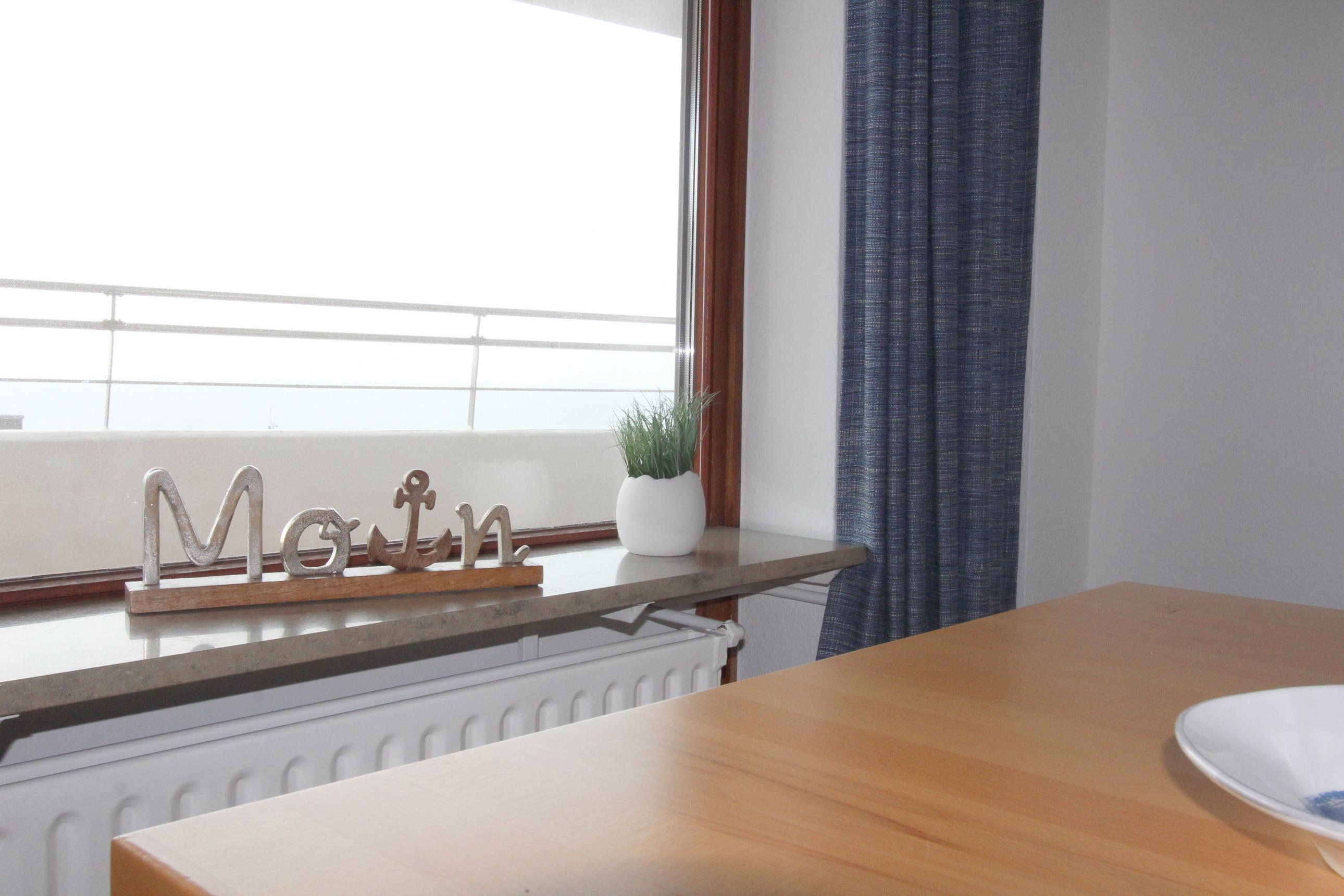 Die wunderschöne, freundlich eingerichtete Zweizimmerwohnung in der 7. Etage im Haus Metropol bietet Ihnen einen herrlichen Blick über die südliche Insel und die Nordsee. Das Wohnzimmer ist aufgrund der großen Fensterfronten und des Balkons lichtdurchflutet und verfügt über eine große Couch mit Schlaffunktion, zwei Fernsehsessel, zwei Couchtische, ein Sideboard, einen Sekretär sowie ein großes Smart TV, auf dem Sie Streamingdienste wie z.B. Netflix nutzen können. Der Essplatz mit vier Stühlen befindet sich zwischen der Durchreiche zur Küche und dem möblierten Südbalkon. Das separate Schlafzimmer mit eigenem Ostbalkon ist mit einem Doppelbett, einem Schrank mit reichlich Stauraum und einem weiteren Flachbild TV Gerät ausgestattet. Das Bad ist vom Flur und Schlafraum begehbar und verfügt über eine Eckdusche und ein Bidet. In der Küche mit Geschirrspüler, Mikrowelle und Ceranfeld können Sie sich selbst verpflegen und die Speisen durch die Durchreiche bequem zum Essplatz weitergeben. Zur technischen Ausstattung dieser Nichtraucherwohnung gehört: ein Radio mit CD Player und ein Telefon mit Flatrate ins dt. Festnetz. Der freie WLAN Hotspot des Hauses (WEG Haus Metropol - Passwortfrei - ohne Gewähr) sowie das private Netz des Eigentümers stehen Ihnen zur Verfügung. Zugangsdaten befinden sich auf dem Router im Objekt. Die Wohnung hat eine Größe von ca. 74 m².