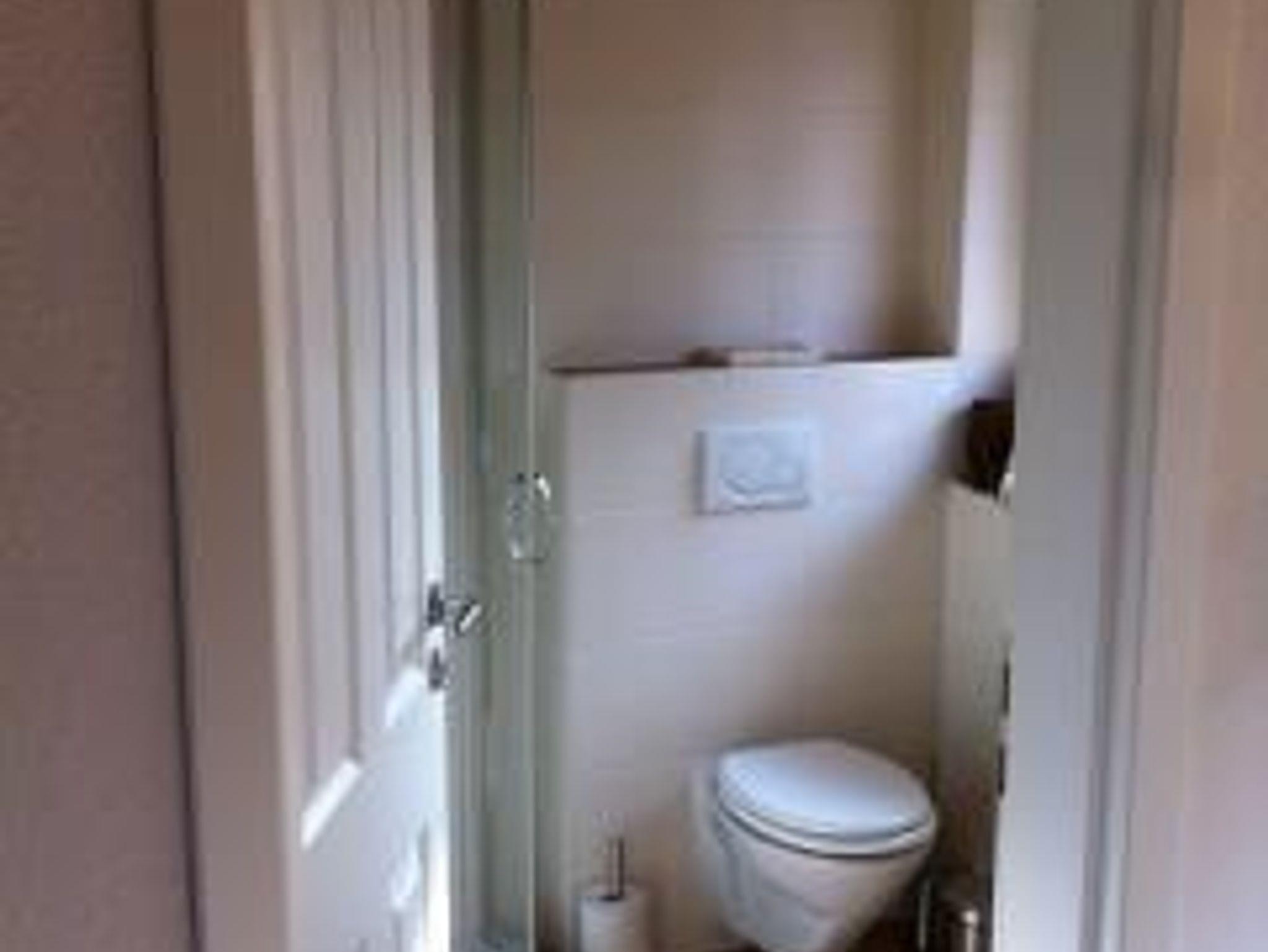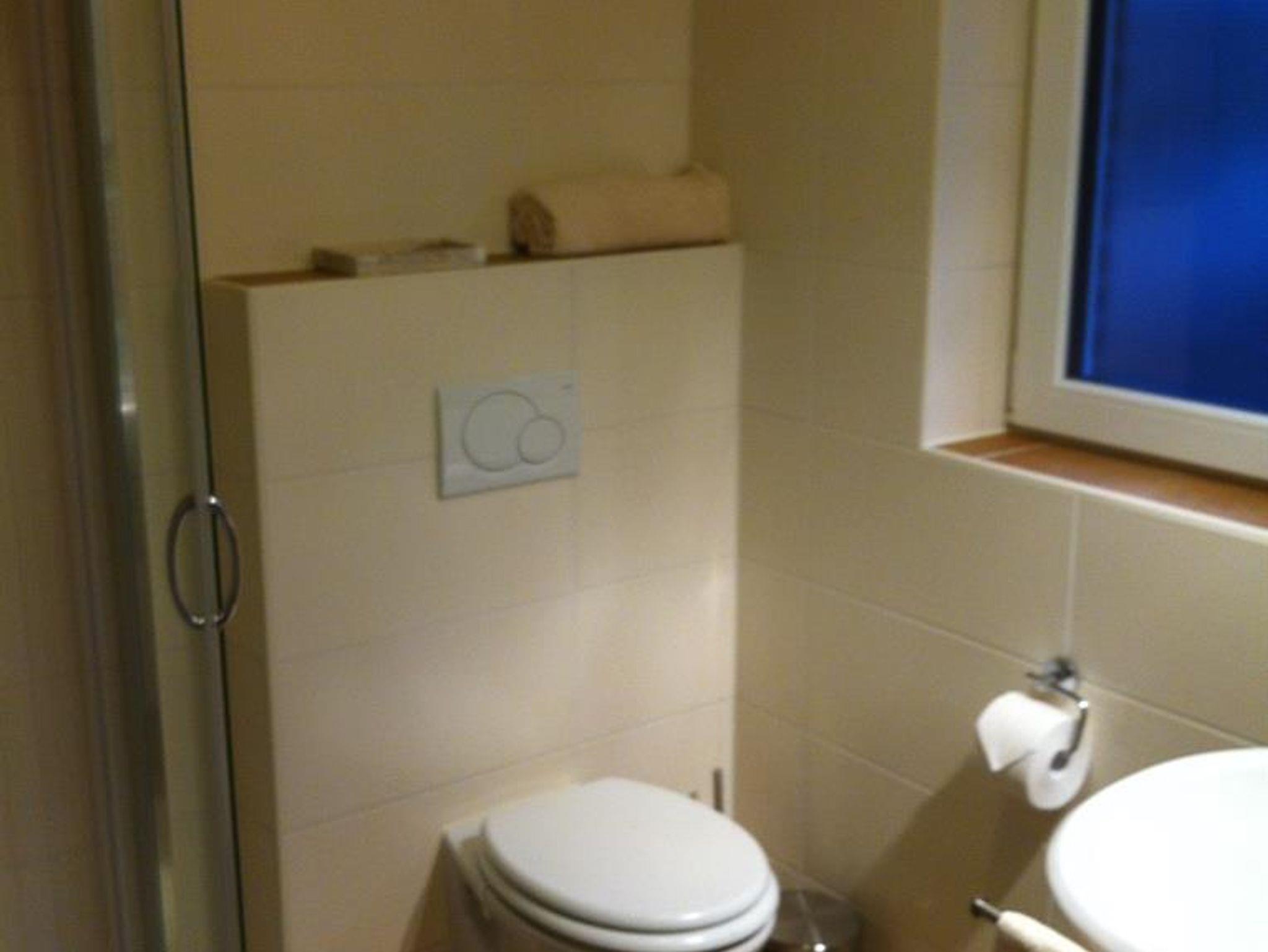 Das Bad bietet ein WC, eine Dusche, Badwandheizkörper und Föhn