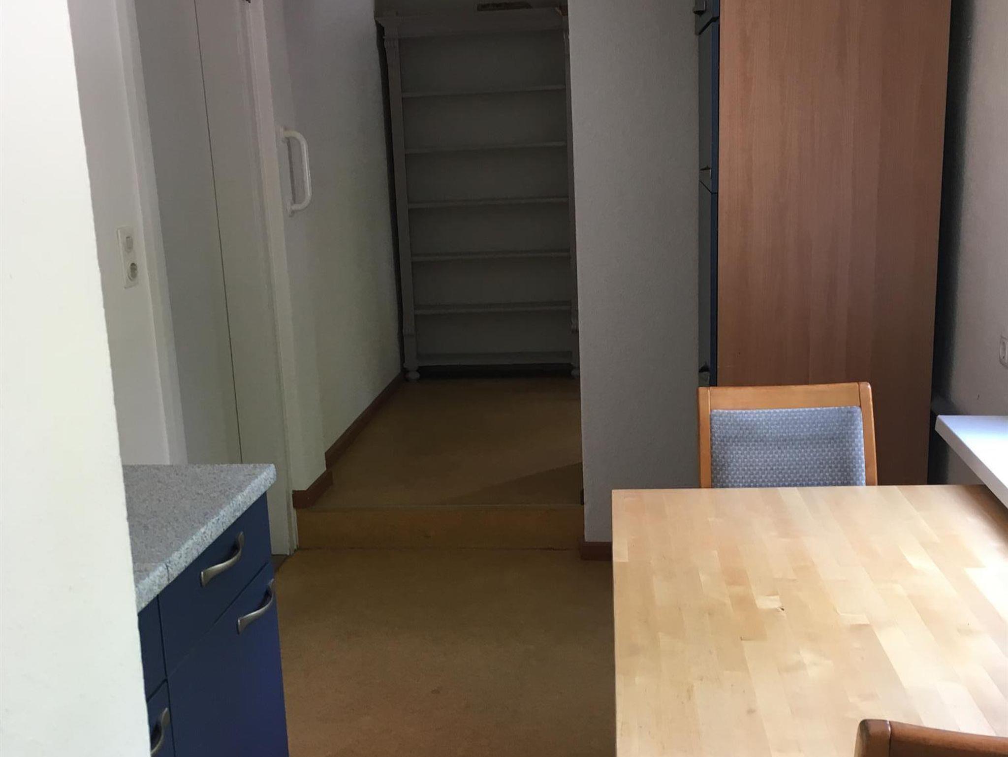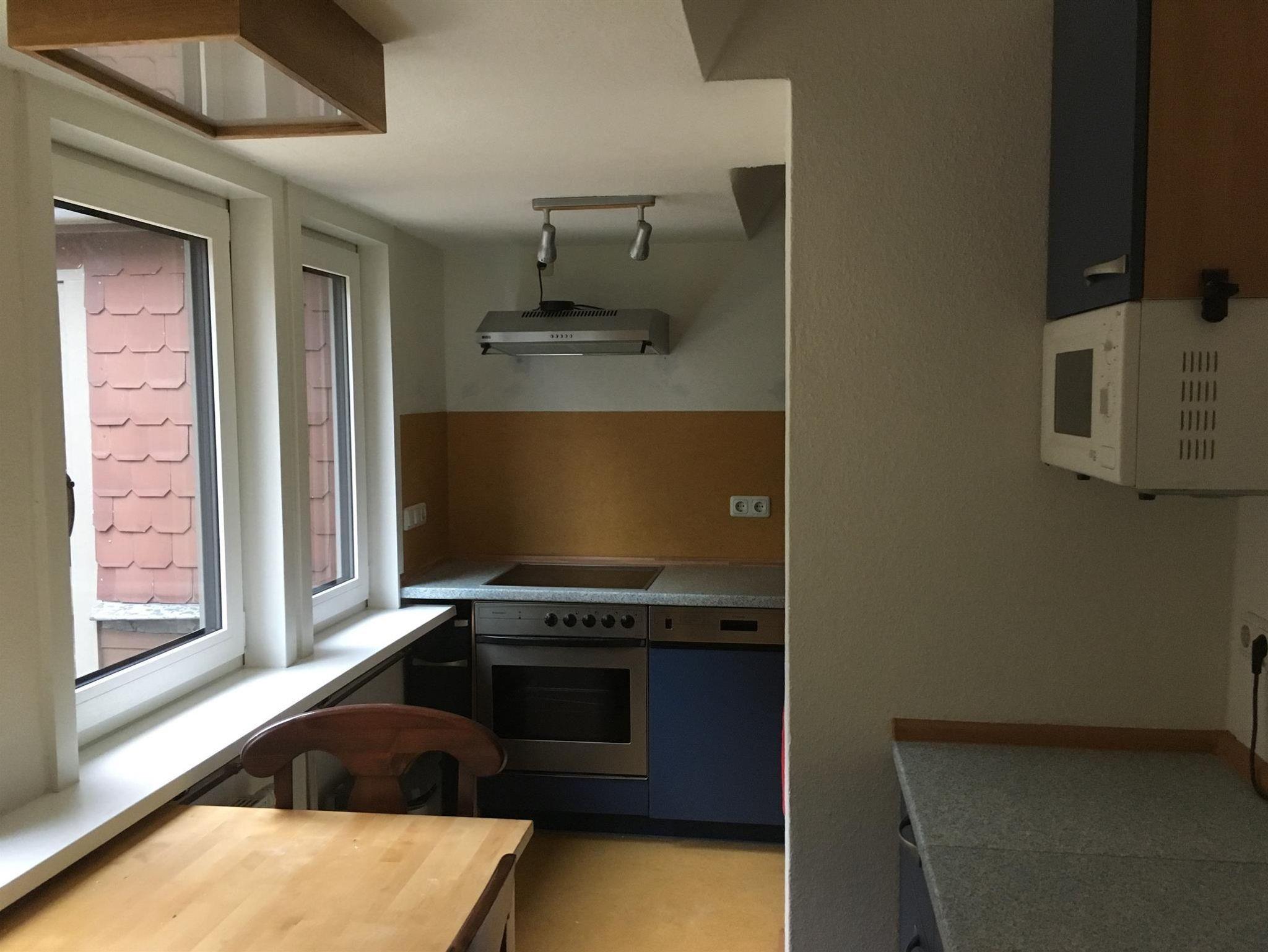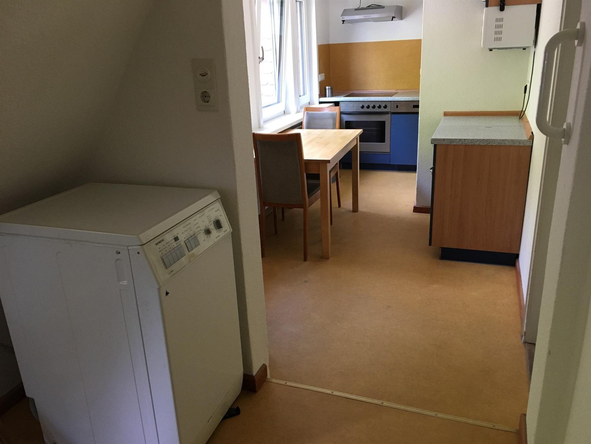 Küchenmitbenutzung zusammen mit einem anderen Mieter. Es ist eine Wohnküche, von der man auf den angrenzenden Wald schaut. Hier befindet sich auch die Waschmaschine.