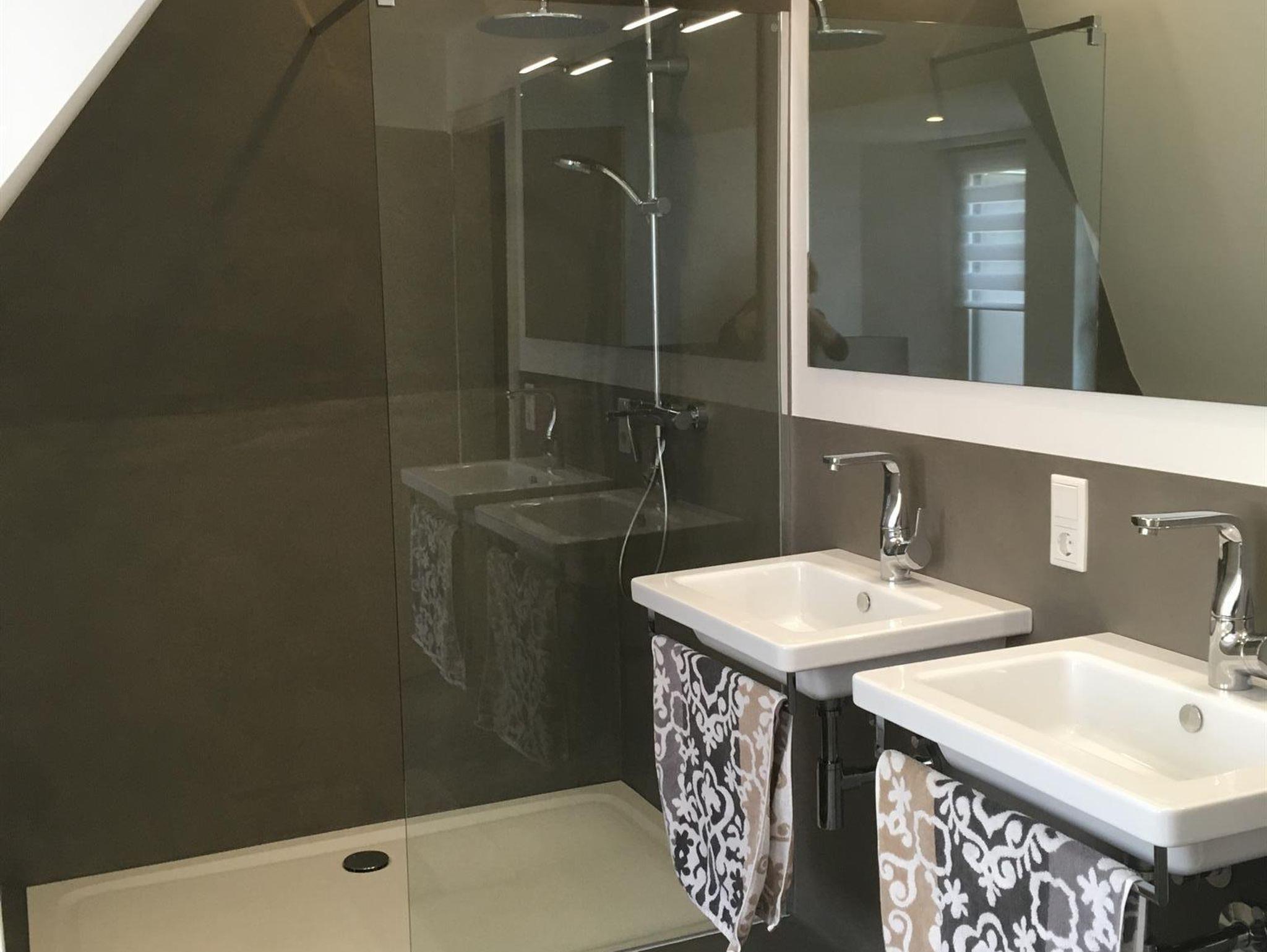 Im Haus befinden sich oben eine komplette Ferienwohnung (Wohnzimmer, Küche, 2 Schlafzimmer, Bad) und 2 Einzelzimmer inkl. eigenen Bädern und gemeinsamer Küche.